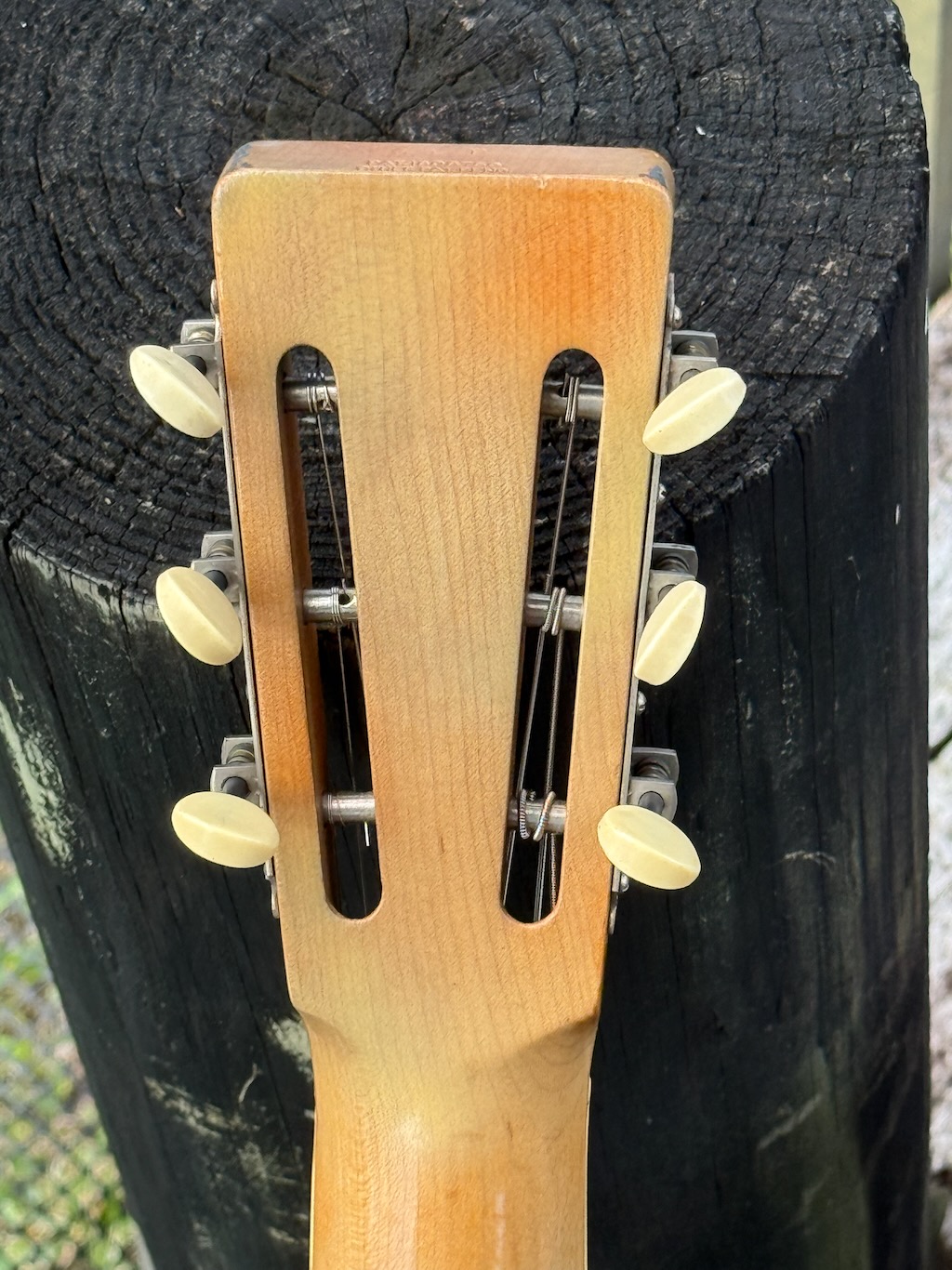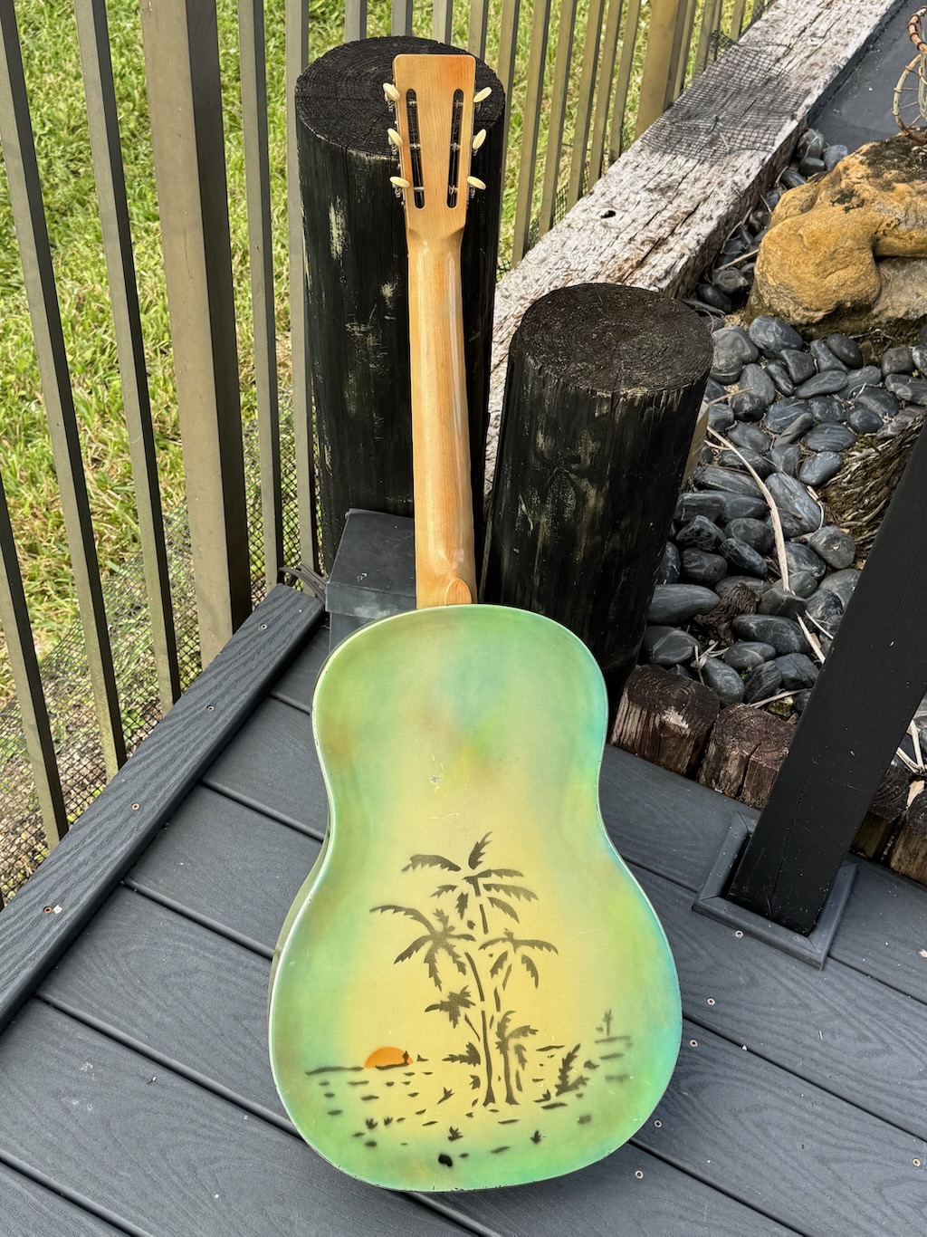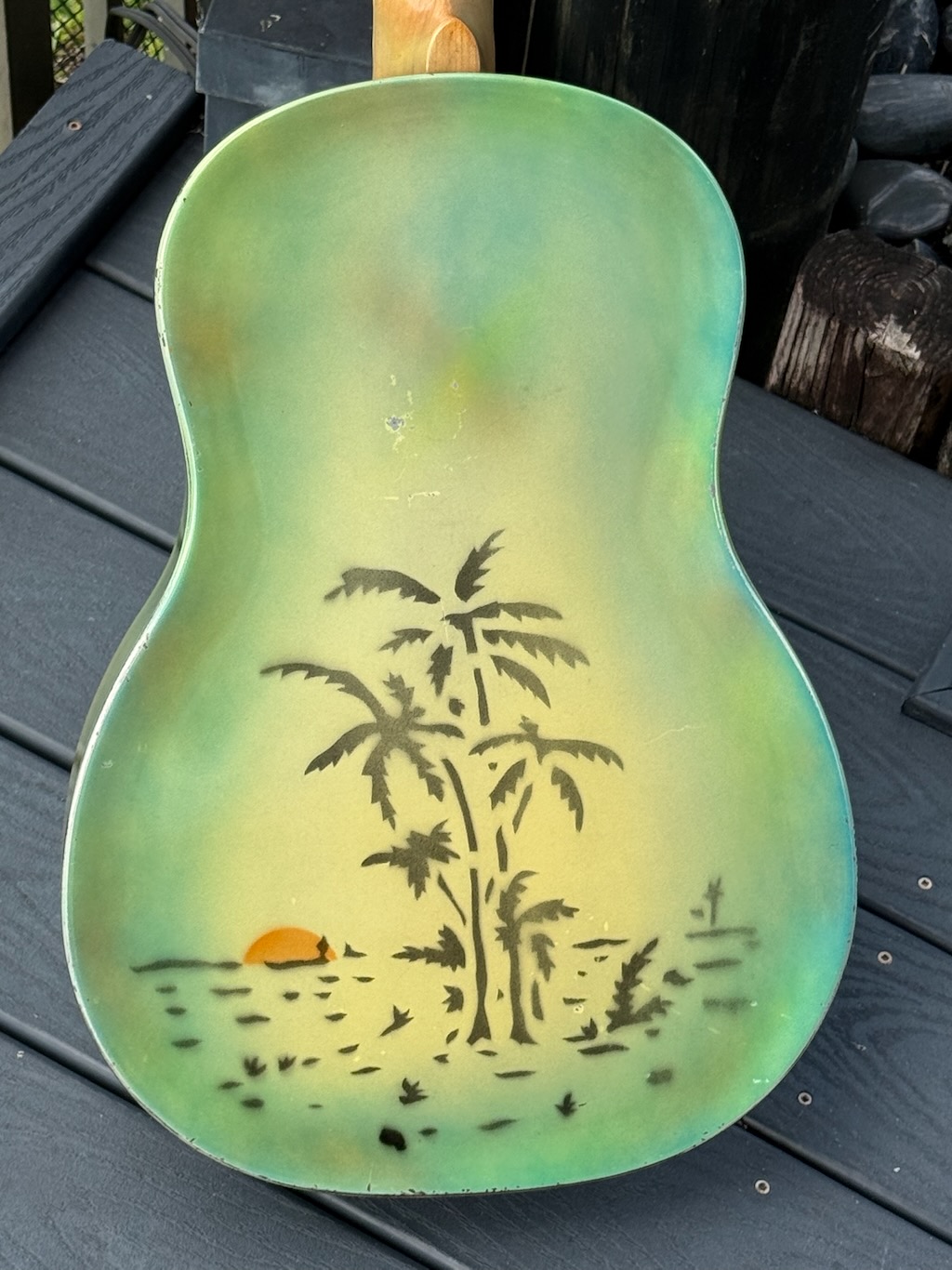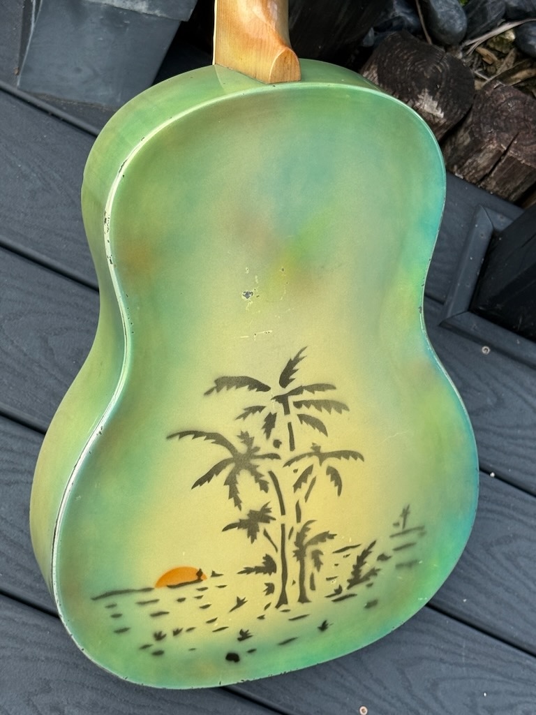 This 1930 “Polychrome” example (from the first production year) is in fabulous 100% substantially original condition, featuring a multi-hued enamel finished steel body with flat-cut F holes and a 12 fret maple neck with a bound painted maple fingerboard. These Triolians were hand-sprayed so no two are exactly alike. This one has the most unfaded Yellow finish w/a Blue & Green’bursted border w/just a few chips around the edges. The back has a bold and fairly clear palm tree & sunset sprayed on, the most distinctive visual signature of the Polychrome Triolian. Its neck has only slight wear w/a perfect decal & some flame to its maple neck. This is truly 1 of the finest examples & it’s exceptionally clean, unfaded & ready to enjoy. Comes in a generic case.