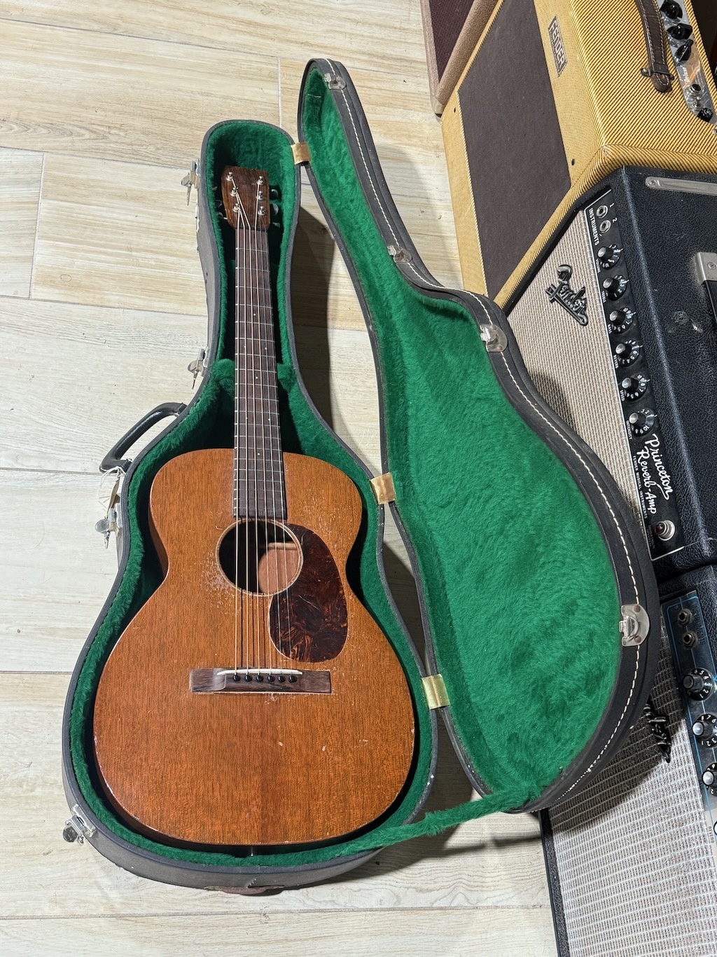 This is a great example of what Martin specialized in…making such fabulous sounding small bodied models of all types. This is a very special 2nd year of production 14 fret 0-17 made in 1934 in all original clean shape. Its Mahogany top is quite clean that’s been played a bit w/no repairs. It has perfect tone & playability. It still has all of its original scalloped braces. It’s Mahogany back & sides are absolutely crack free. Its 1 piece soft V shape neck feels very comfy, plays great & has a perfect neck angle. It sports a beautiful Brazilian Rosewood headstock veneer w/no Martin logo of any type just stamped Martin on its back side. Its original Grover open back nickel plated tuners w/metal buttons are super clean & hold tune pretty well. Its Brazilian Rosewood fingerboard & bridge are still quite nice. Amazingly she still retains her original railroad tie Frets. If you ever wanted a killer sounding 82 year old perfect playing 0 size Martin…this is it. She’s excellent overall, comes complete w/a “Greig Hutton Registry” report & comes w/a nice late 50’s Martin Hard Case.