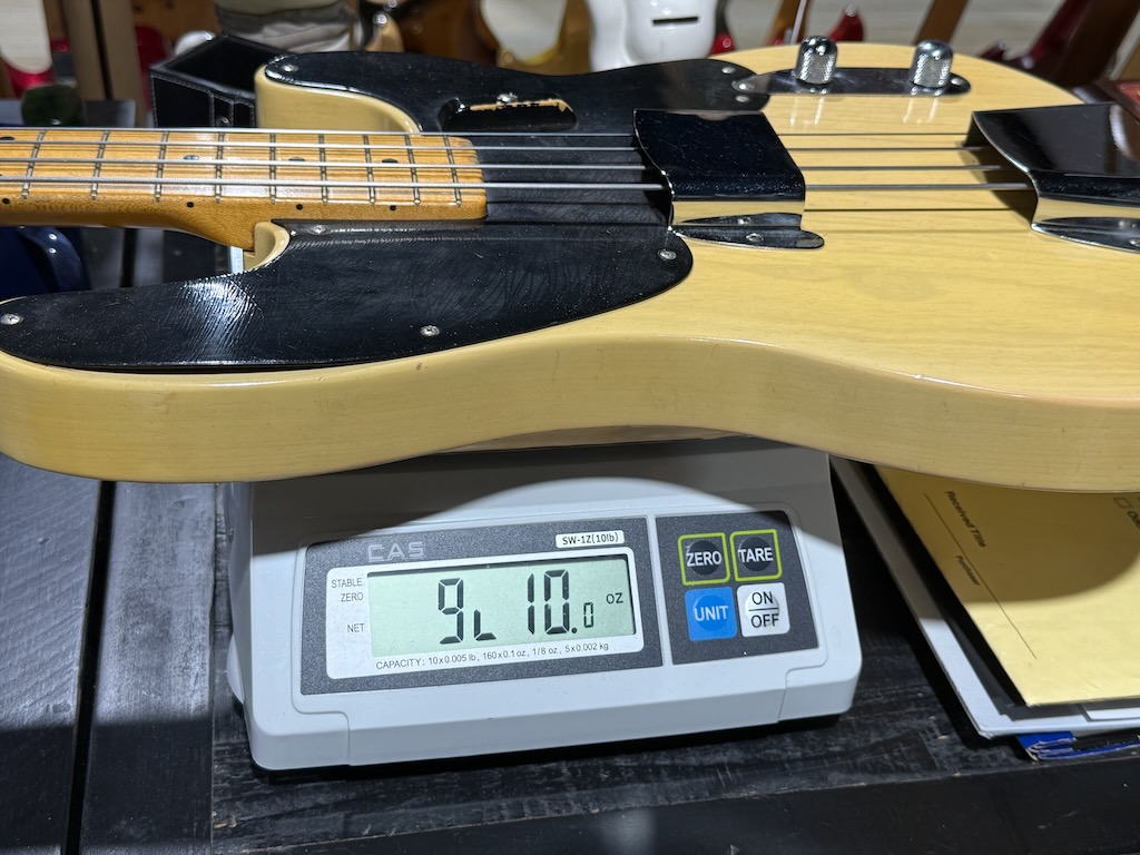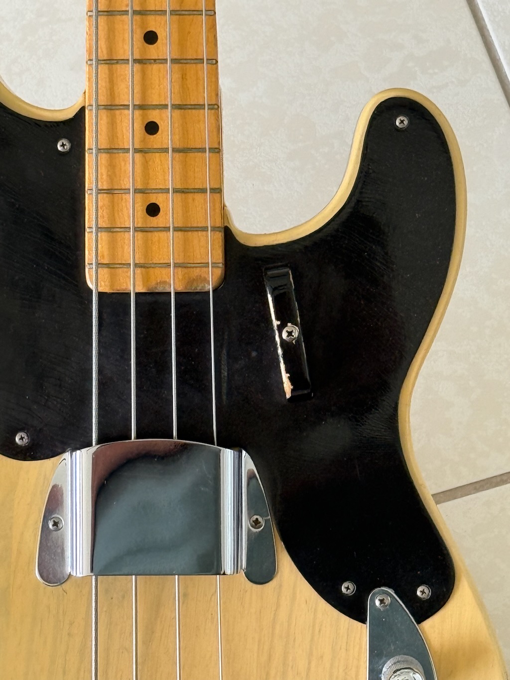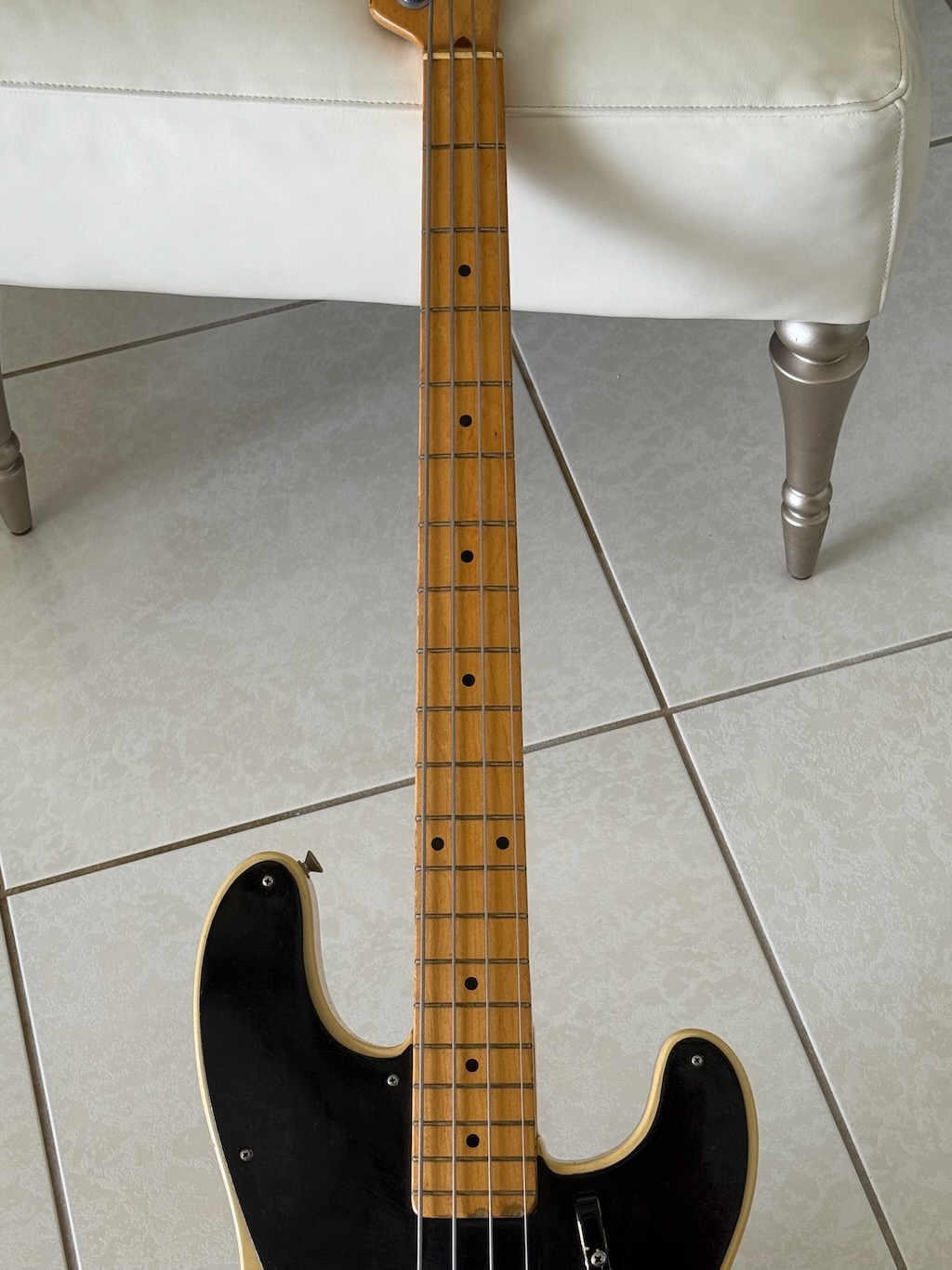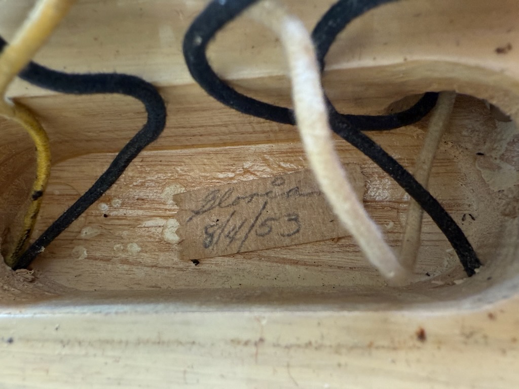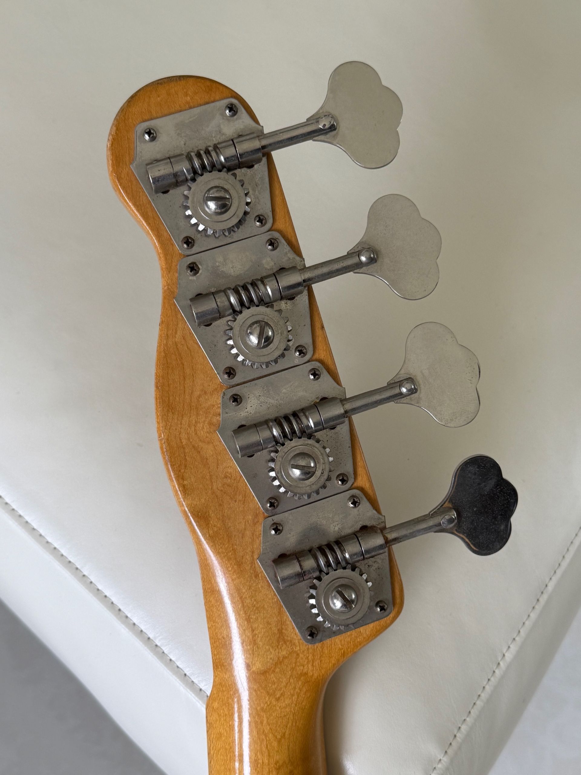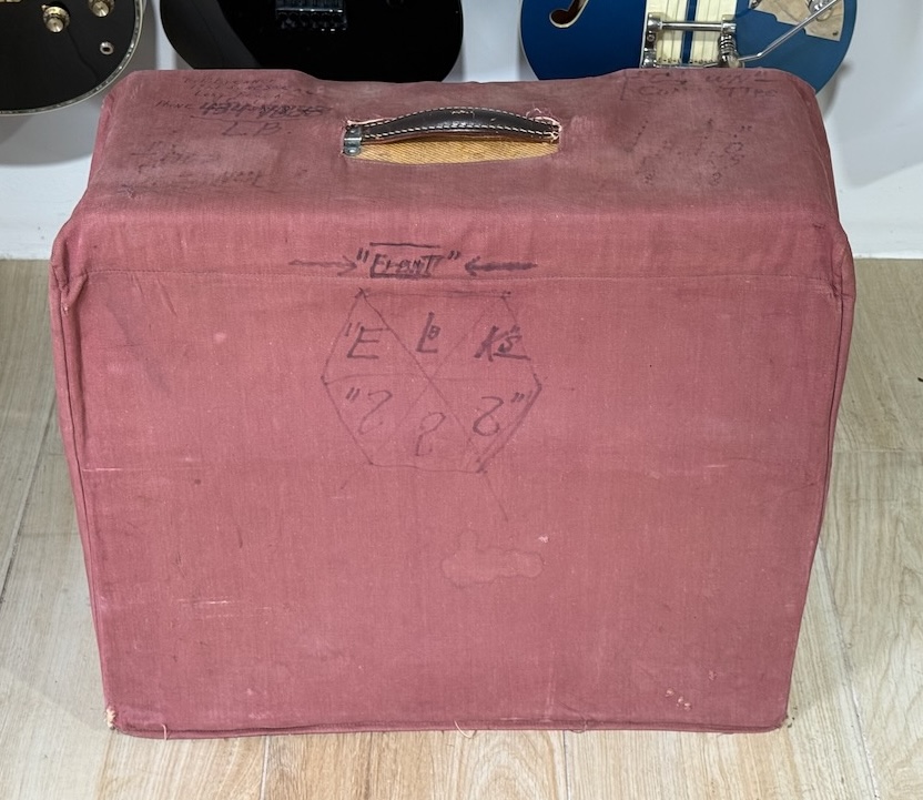 This is the ultimate Bass Players dream set to gig with, this all original very earliest production “Slab” bodied Pre-CBS Precision Bass w/a fat maple neck w/Leo’s 1st type features in untouched original condition, it has its original See-Thru Butterscotch finish over a very lightweight super grainy Ash body pencil dated to 3/23/53 by “Eddie” in its neck pocket, its also pencil dated 8/4/53 by “Gloria” on its tape inside its control cavity & weighing in at 9 lbs. 10 oz; these 1st issue Fender Slab bodies are ridiculously & she has a very full sized Maple Neck pencil dated to 7/29/53, it’s sporting a very low serial # 1303 stamped on its original bridge, its original Black Bakelite pickgard has that gorgeous contrast used only from 1951-1955, brings this all together, its single coil pickup is super potent, its pot date codes are the 20th week of 1952, its so cool from its nickel tuners to its large rubber saddle bridge, its all original in all respects & still retains its bridge & pickup covers along with every single screw from new. The 1952 Tweed Bassman w/serial # 0110, is included is extremely clean & all original, its 15″ Jensen Alnico 5 speaker dates to the 12th week of ’52. This is perhaps Leo’s prettiest P Bass Set & has a gorgeous patina for a 72-3 year old originals, she plays & feels incredible, we owned this exact set about 20 years ago as we got it in from its original owner of at least 40 years at that time, this amp is an untouched beautiful Tweed but shows a bit more age than the bass, its just returned to us happily, she’s absolutely near mint in all respects having almost no wear, 1 of the mintiest sets & most desirable examples on Earth as the amp is Excellent overall & to make this even betta…she comes complete in her original ultra rare brown tolex “Poodle” shaped hard case.