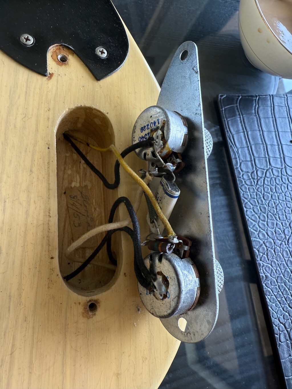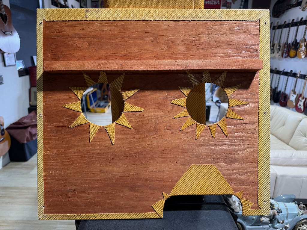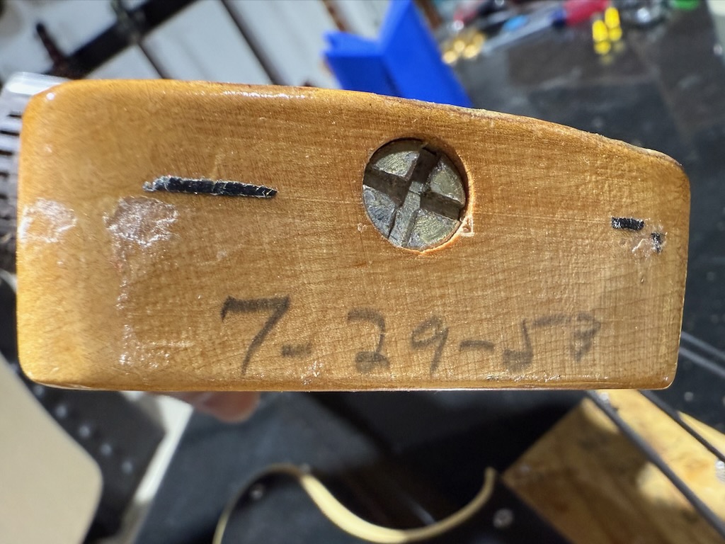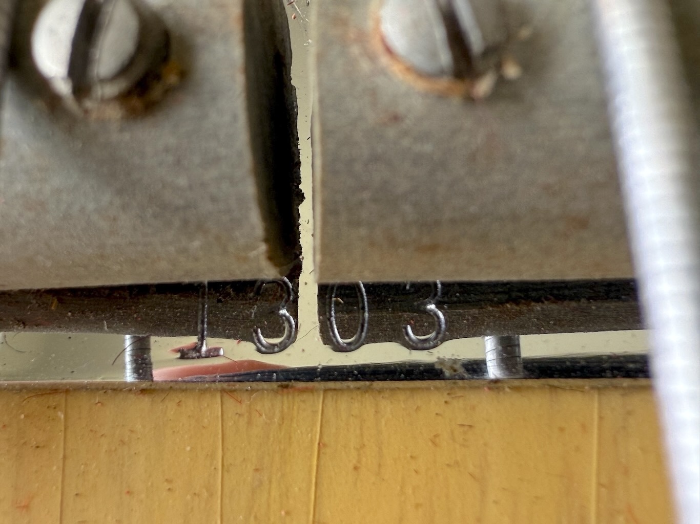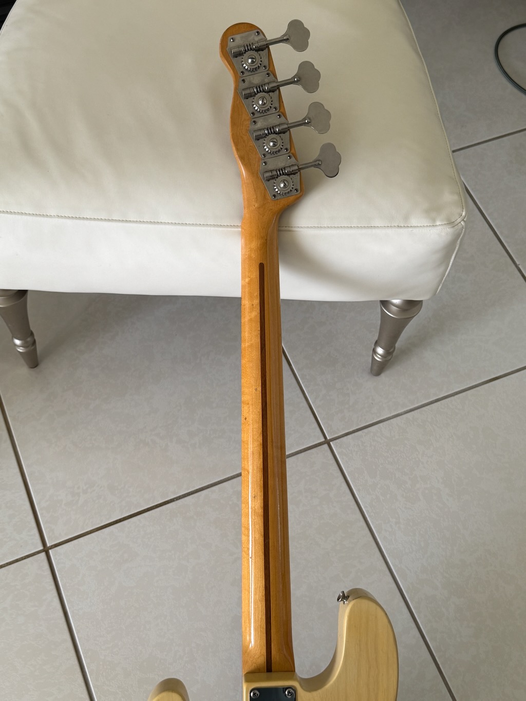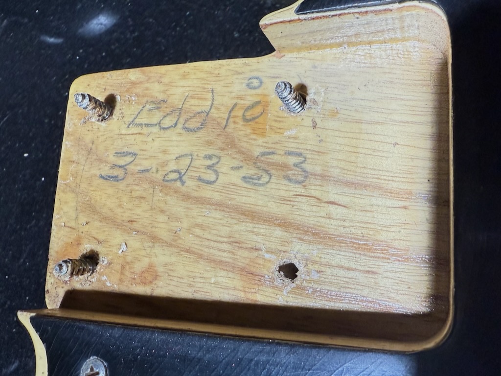 This is the ultimate Bass Players dream set to gig with, this all original very earliest production “Slab” bodied Pre-CBS Precision Bass w/a fat maple neck w/Leo’s 1st type features in untouched original condition, it has its original See-Thru Butterscotch finish over a very lightweight super grainy Ash body pencil dated to 3/23/53 by “Eddie” in its neck pocket, its also pencil dated 8/4/53 by “Gloria” on its tape inside its control cavity & weighing in at 9 lbs. 10 oz; these 1st issue Fender Slab bodies are ridiculously & she has a very full sized Maple Neck pencil dated to 7/29/53, it’s sporting a very low serial # 1303 stamped on its original bridge, its original Black Bakelite pickgard has that gorgeous contrast used only from 1951-1955, brings this all together, its single coil pickup is super potent, its pot date codes are the 20th week of 1952, its so cool from its nickel tuners to its large rubber saddle bridge, its all original in all respects & still retains its bridge & pickup covers along with every single screw from new. The 1952 Tweed Bassman w/serial # 0110, is included is extremely clean & all original, its 15″ Jensen Alnico 5 speaker dates to the 12th week of ’52. This is perhaps Leo’s prettiest P Bass Set & has a gorgeous patina for a 72-3 year old originals, she plays & feels incredible, we owned this exact set about 20 years ago as we got it in from its original owner of at least 40 years at that time, this amp is an untouched beautiful Tweed but shows a bit more age than the bass, its just returned to us happily, she’s absolutely near mint in all respects having almost no wear, 1 of the mintiest sets & most desirable examples on Earth as the amp is Excellent overall & to make this even betta…she comes complete in her original ultra rare brown tolex “Poodle” shaped hard case.