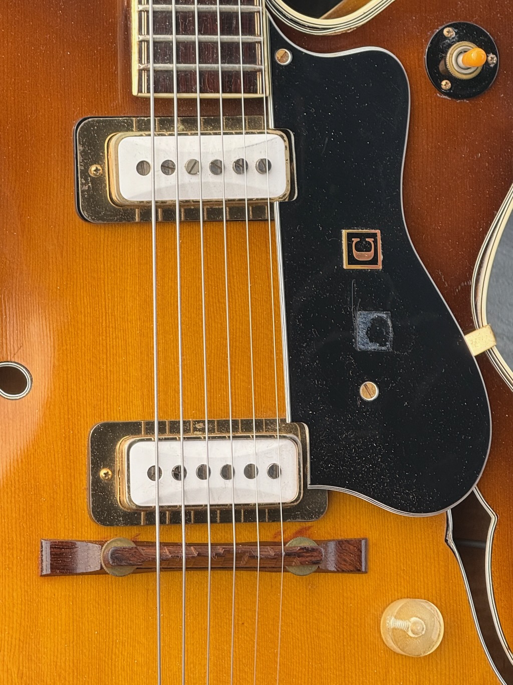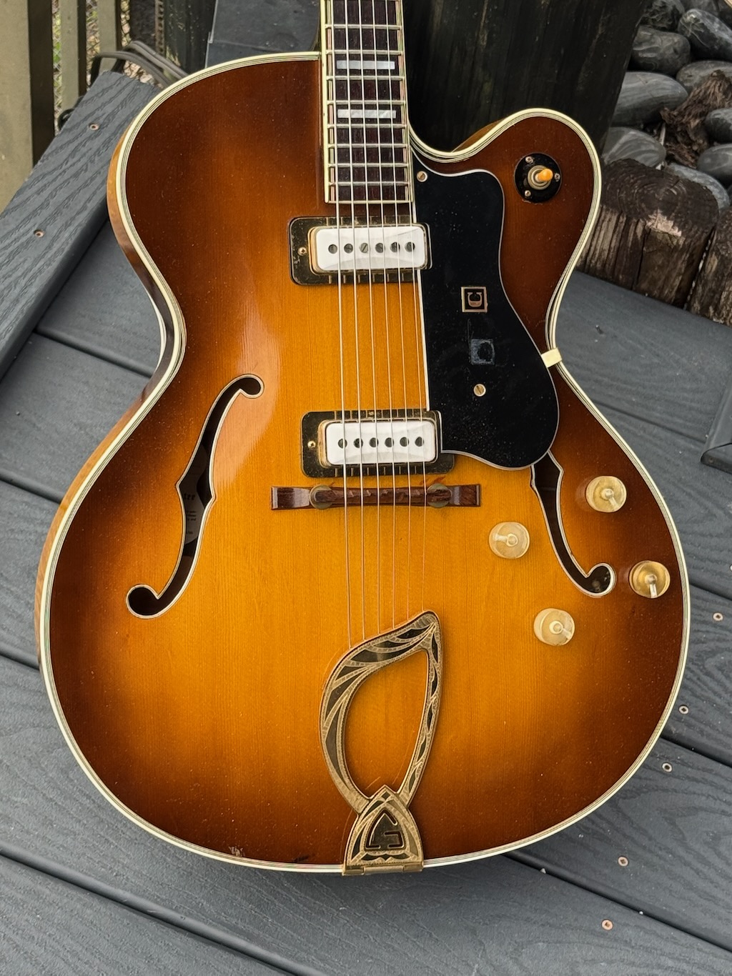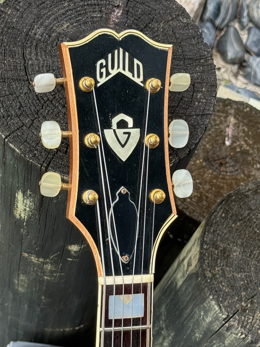 This very lovely full-body Guild was the company’s top of the line electric from the 1950’s, surpassed only by the carved acoustic/electric Johnny Smith Artist Award. The X-500 is a very fancy high end model, roughly equivalent to Gibson’s L-5CES although built with laminated woods instead of the Gibson’s fully carved top. The X-500 was intended to compete directly with Gibson and Gretsch’s best offerings, with enough distinctive Guild touches to set it apart. By the time this one was made in 1958, the relatively young Hoboken based company was firmly established as one of America’s top guitar builders, and this was one of their showpieces. This X-500 has the typical hallmarks of a high-end archtop electric, as top pro players would have expected in this period. Its beautiful Ice Tea Sunburst finish is to die for. There is multiple binding on the body, neck and headstock, 5-ply bound on the top and back and 3-ply bound on the sides. The f-holes are triple-bound as well. The single-bound ebony fingerboard has the elaborate split block Epiphone style inlay with multiple inset lines just inside the outer edge.