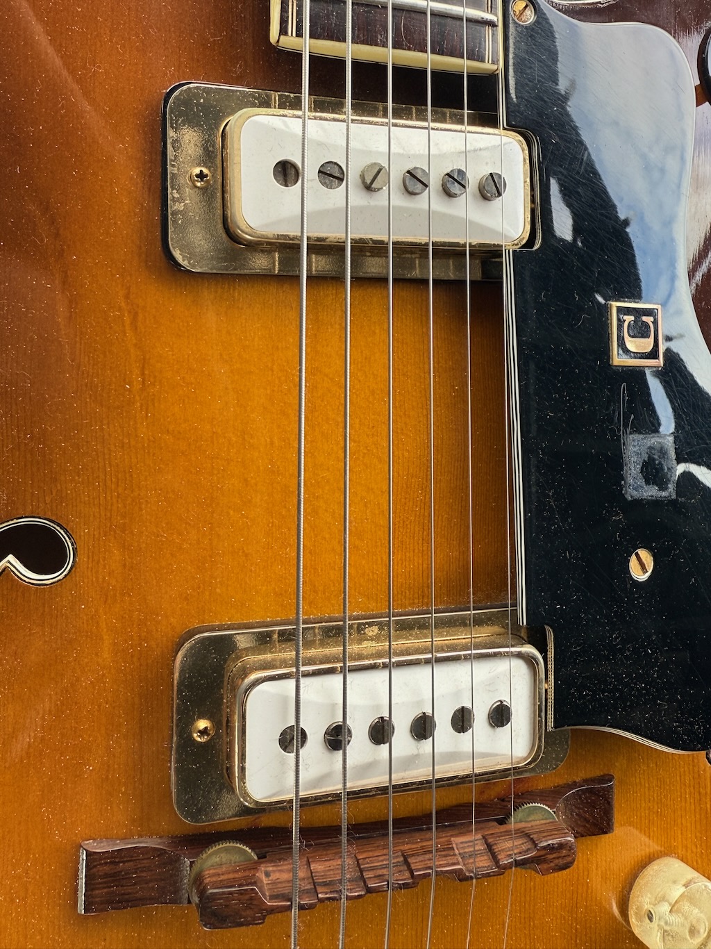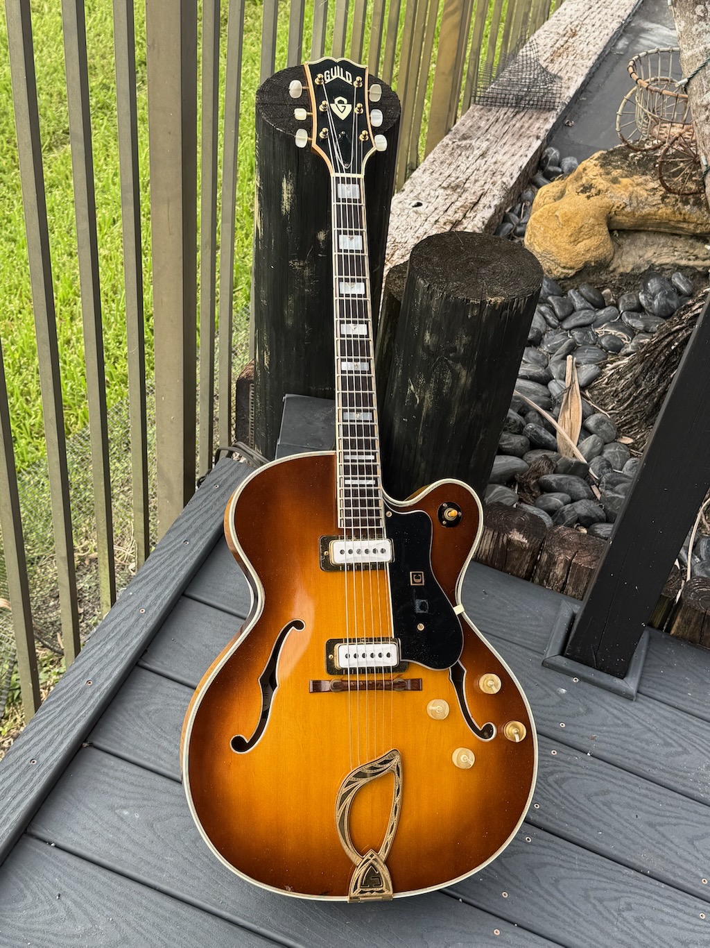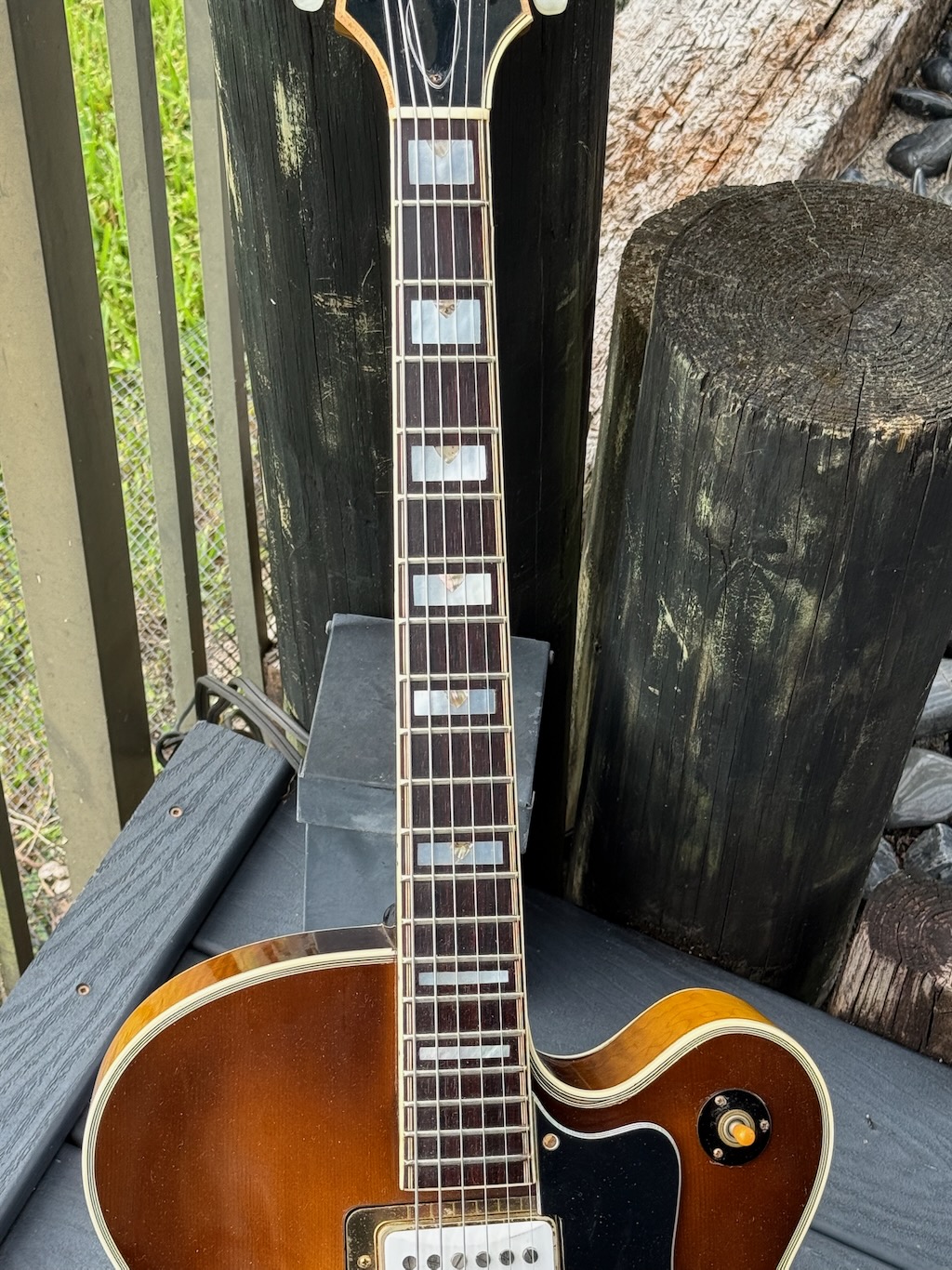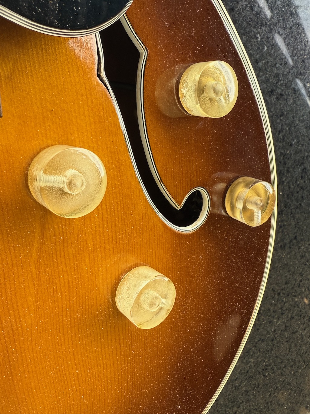 This very lovely full-body Guild was the company’s top of the line electric from the 1950’s, surpassed only by the carved acoustic/electric Johnny Smith Artist Award. The X-500 is a very fancy high end model, roughly equivalent to Gibson’s L-5CES although built with laminated woods instead of the Gibson’s fully carved top. The X-500 was intended to compete directly with Gibson and Gretsch’s best offerings, with enough distinctive Guild touches to set it apart. By the time this one was made in 1958, the relatively young Hoboken based company was firmly established as one of America’s top guitar builders, and this was one of their showpieces. This X-500 has the typical hallmarks of a high-end archtop electric, as top pro players would have expected in this period. Its beautiful Ice Tea Sunburst finish is to die for. There is multiple binding on the body, neck and headstock, 5-ply bound on the top and back and 3-ply bound on the sides. The f-holes are triple-bound as well. The single-bound ebony fingerboard has the elaborate split block Epiphone style inlay with multiple inset lines just inside the outer edge.
