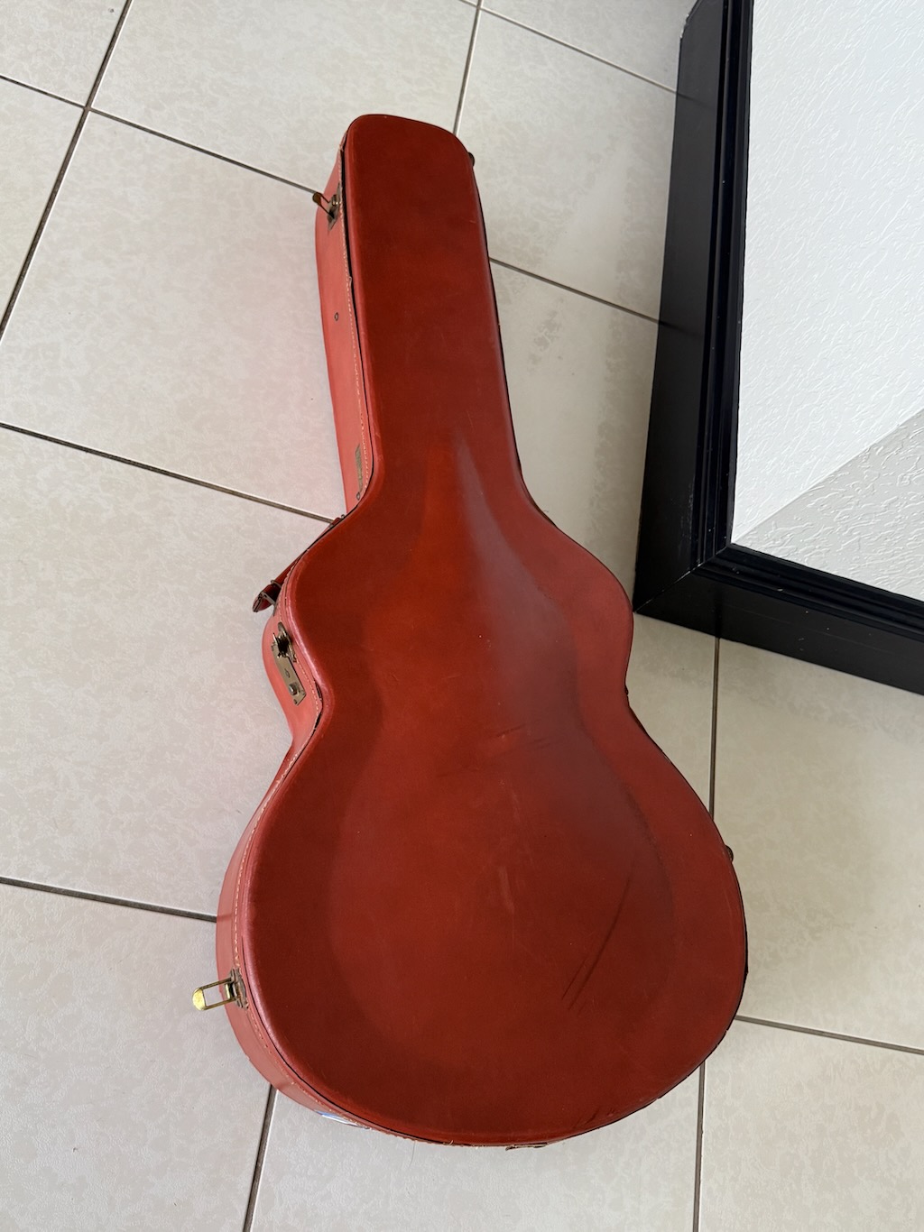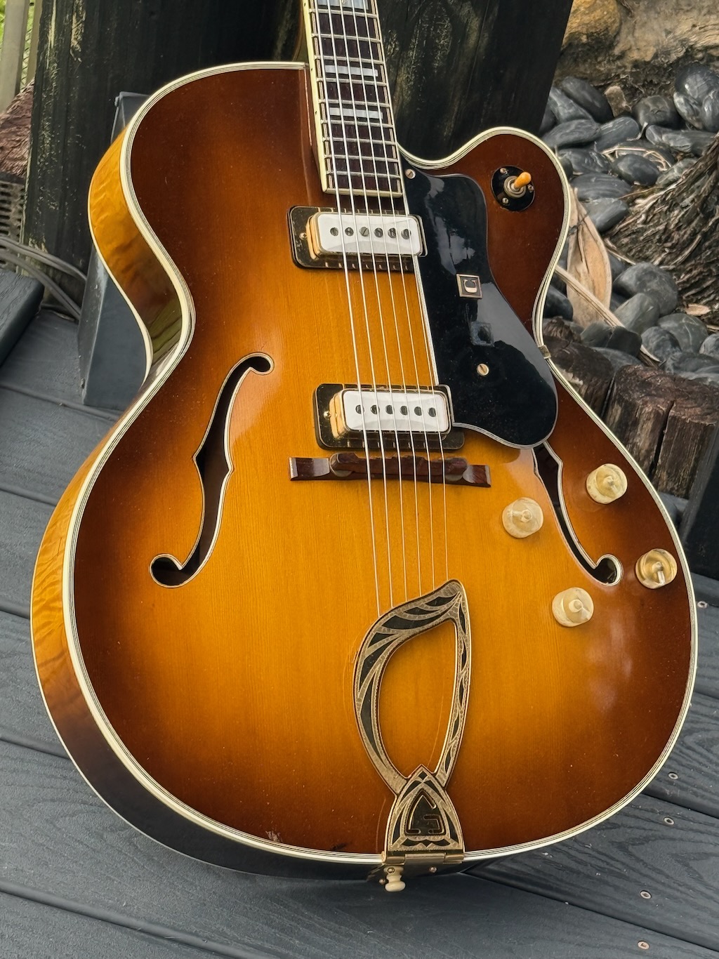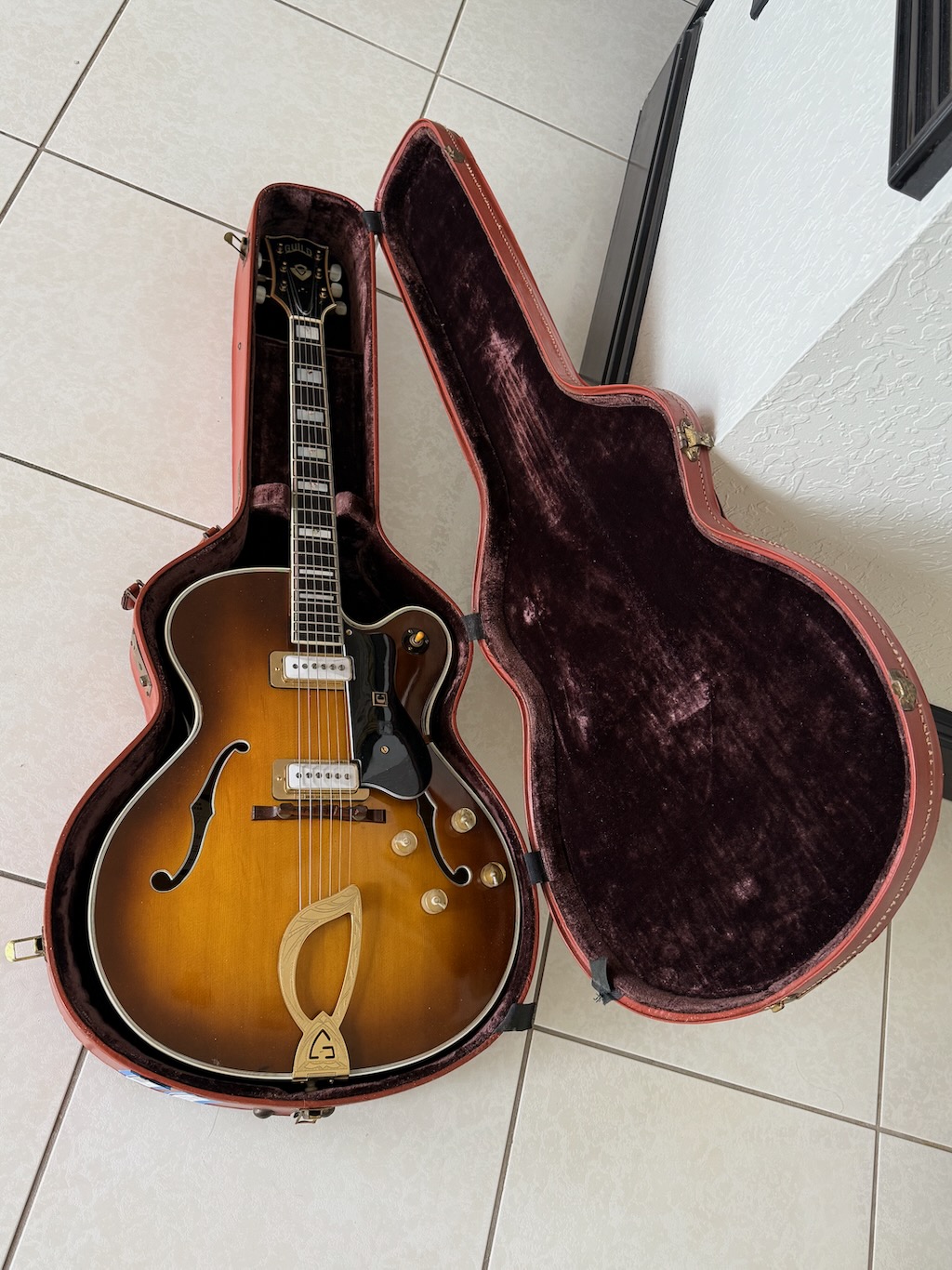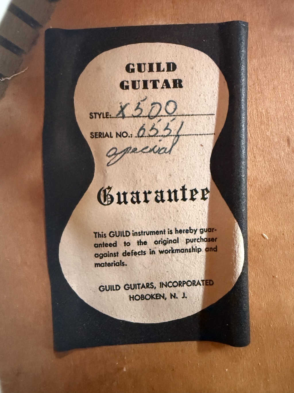 The 17″ body is made of laminated curly maple with a spruce top, while the neck shows its Epiphone ancestry with a 5-piece lamination down the back. The headstock is multi-bound on the face with an inlaid pearl Guild logo and G-shield centerpiece. All hardware is gold plated including the Kolb tuners with pearloid buttons. Its 4 digit serial # is stamped into the back of its headstock. Its factory square label is perfectly intact & states it’s a “Special” made guitar from new. All part details and the beautifully engraved deluxe Guild harp tailpiece are gold plated. The fittings are typical for Guild in 1958, with its twin D’Armond single coil pickups under white beveled covers with gold plated surrounds & accents. The knobs are the final type of clear transparent barrel style, while the older black switch ring is still in use. The black laminated pickgard is original including a few initial stickers from a past owner. Its heel cap & a small area of back binding is replaced. The X-500 represents Guild’s finest fully electric arch top electric guitar and ranks with the best acoustic/electric guitars ever made. The sound is a bit brighter and less “electric” than some similar Gibson instruments from the same period, due mostly to the comparatively under wound D’Armond pickups. The guitar plays and handles extremely well, and aside from the fully carved Artist Award it remained Guild’s most prestigious electric offering into the 1970s and beyond. It’s fabulous in all respects & a very rare guitar today. It’s exceptionally clean & comes in its original Brown Tolex/Maroon Lined hard case.