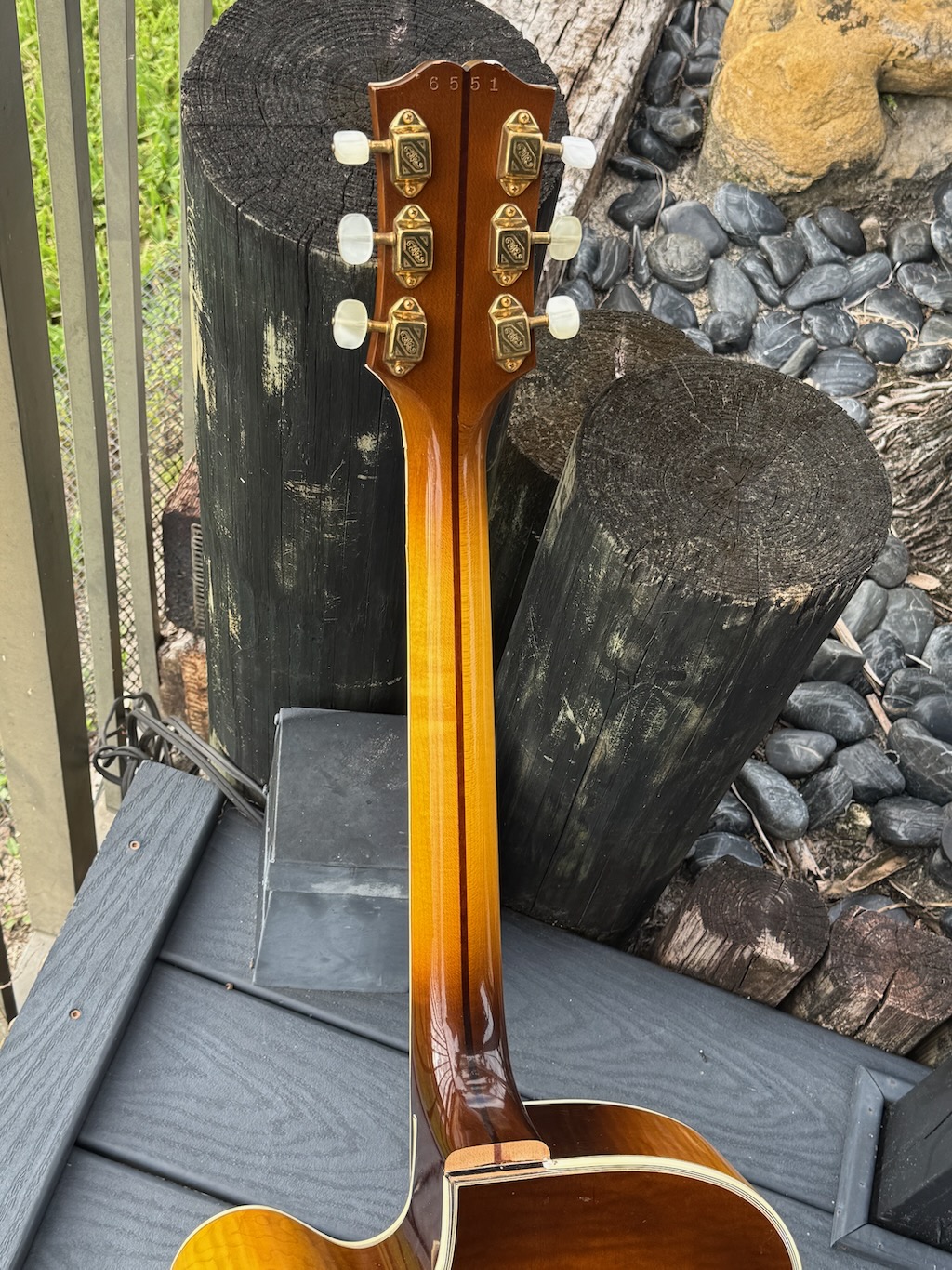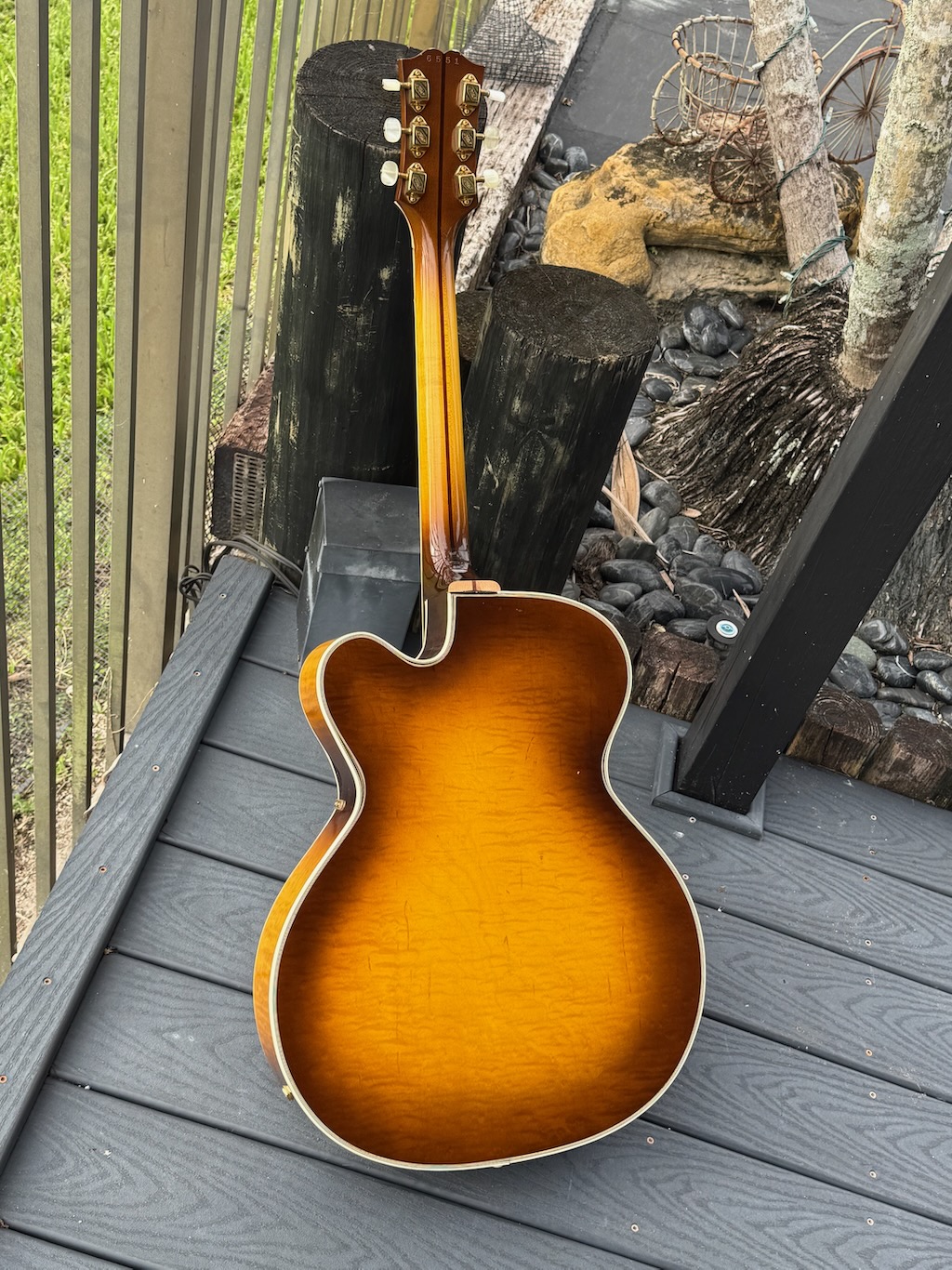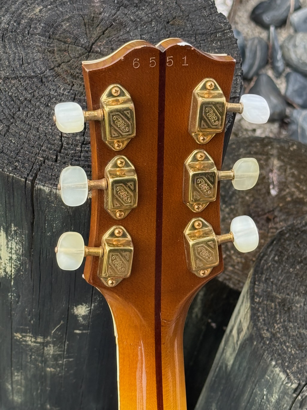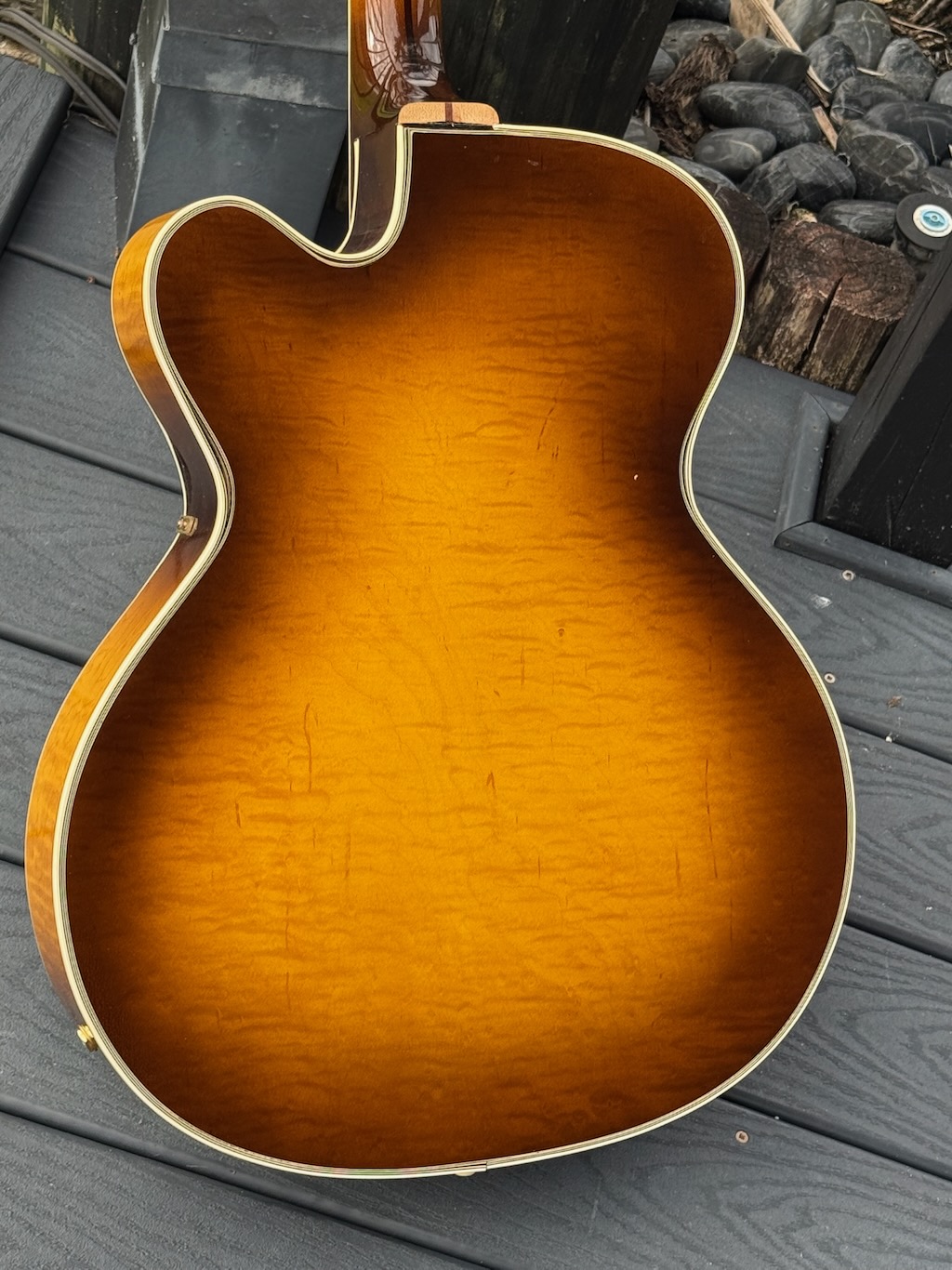 The 17″ body is made of laminated curly maple with a spruce top, while the neck shows its Epiphone ancestry with a 5-piece lamination down the back. The headstock is multi-bound on the face with an inlaid pearl Guild logo and G-shield centerpiece. All hardware is gold plated including the Kolb tuners with pearloid buttons. Its 4 digit serial # is stamped into the back of its headstock. Its factory square label is perfectly intact & states it’s a “Special” made guitar from new. All part details and the beautifully engraved deluxe Guild harp tailpiece are gold plated. The fittings are typical for Guild in 1958, with its twin D’Armond single coil pickups under white beveled covers with gold plated surrounds & accents. The knobs are the final type of clear transparent barrel style, while the older black switch ring is still in use. The black laminated pickgard is original including a few initial stickers from a past owner. Its heel cap & a small area of back binding is replaced. The X-500 represents Guild’s finest fully electric arch top electric guitar and ranks with the best acoustic/electric guitars ever made. The sound is a bit brighter and less “electric” than some similar Gibson instruments from the same period, due mostly to the comparatively under wound D’Armond pickups. The guitar plays and handles extremely well, and aside from the fully carved Artist Award it remained Guild’s most prestigious electric offering into the 1970s and beyond. It’s fabulous in all respects & a very rare guitar today. It’s exceptionally clean & comes in its original Brown Tolex/Maroon Lined hard case.