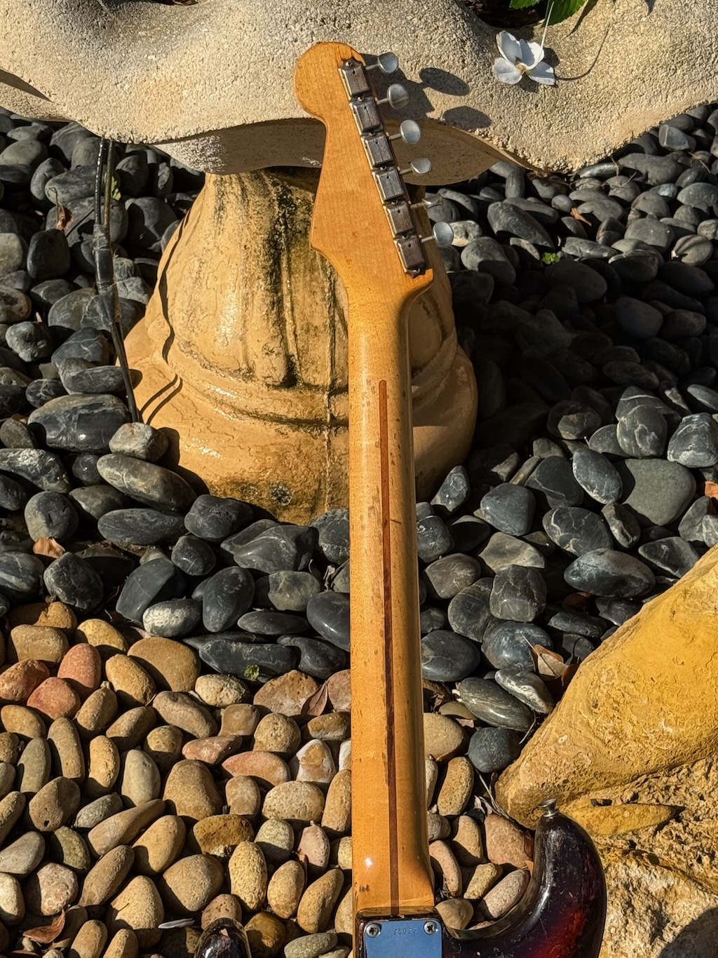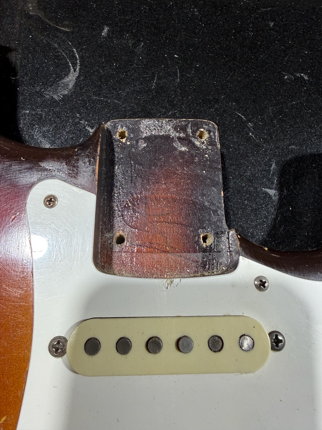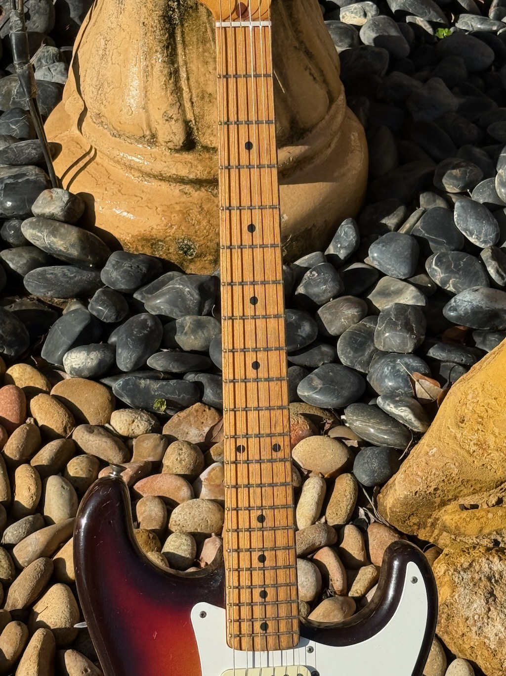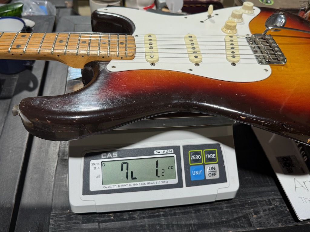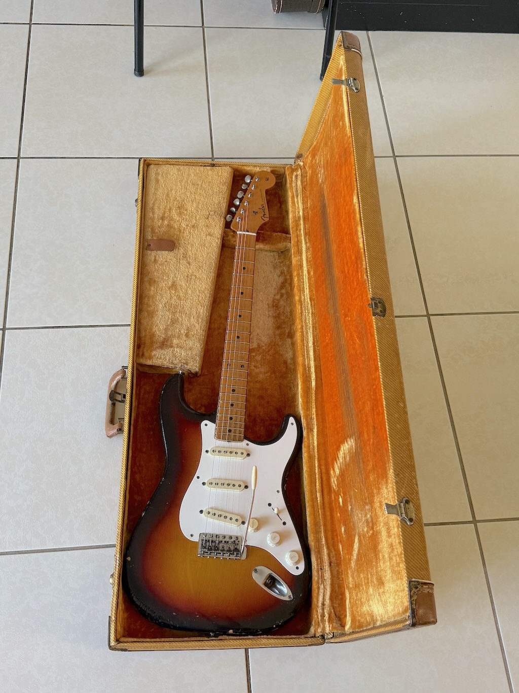 This is the ultimate all original & perhaps the very last production run Pre-CBS Stratocaster w/a Maple neck & all early ’59 features in all original condition. It has its original slightly faded 3-Tone Brown’burst finish over a very lightweight Alder body pencil dated 11/58 & weighing in at a featherweight 7 lbs. 1 oz. These early 59’s were the last made Maple Necks, this one being pencil dated 3/59 & are quite wide & have a flat/thin feel like no others. It’s sporting a very low serial # (31XXX) stamped on its 4-bolt neck plate, its original single layer pickgard has 1 crackle in it. Its 3 Pickups are absolutely fantastic w/that quintessential Strat tone !, Its pot date codes are from the 39th week of 1958, Its so cool from its nickel tuners to its pat. pend. 6 saddle bridge, its all original other than a pro-refret by Gruhn’s. She has a gorgeous patina for a 65 year old original, it plays & feels incredible, other than having some major play time, she’s still rather Excellent. 1 of the coolest & most desirable examples on Earth, she comes complete w/its original Tweed case.