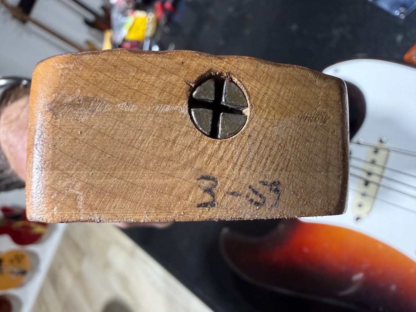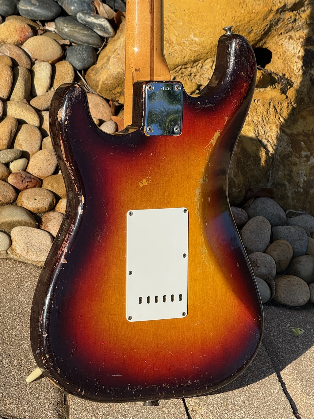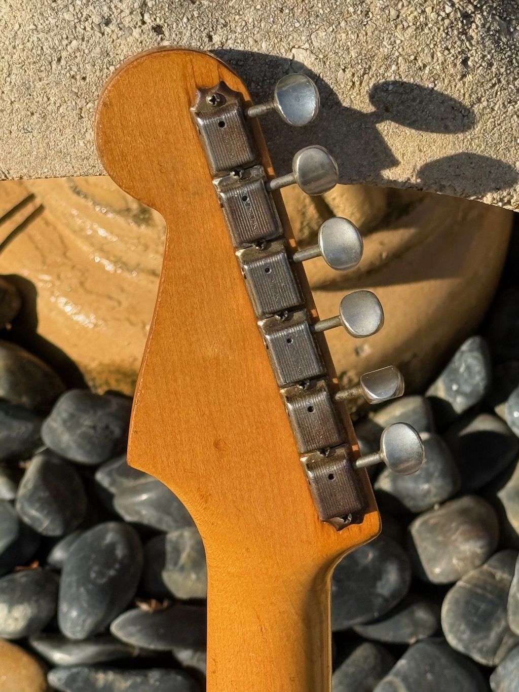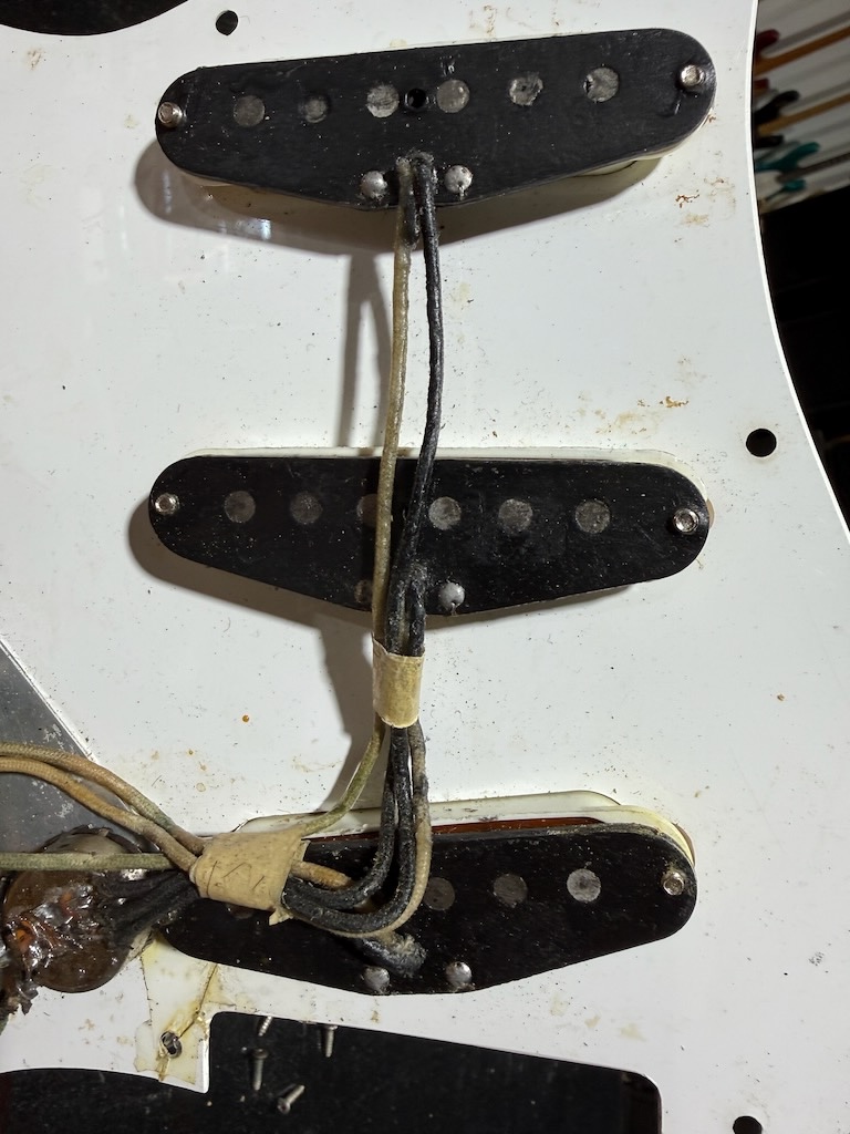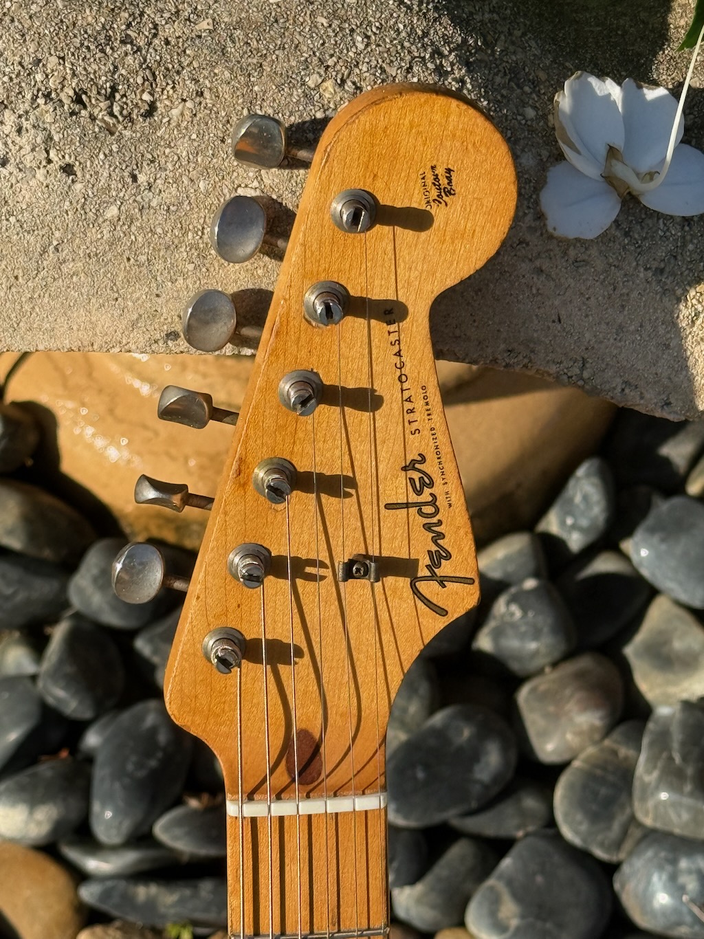 This is the ultimate all original & perhaps the very last production run Pre-CBS Stratocaster w/a Maple neck & all early ’59 features in all original condition. It has its original slightly faded 3-Tone Brown’burst finish over a very lightweight Alder body pencil dated 11/58 & weighing in at a featherweight 7 lbs. 1 oz. These early 59’s were the last made Maple Necks, this one being pencil dated 3/59 & are quite wide & have a flat/thin feel like no others. It’s sporting a very low serial # (31XXX) stamped on its 4-bolt neck plate, its original single layer pickgard has 1 crackle in it. Its 3 Pickups are absolutely fantastic w/that quintessential Strat tone !, Its pot date codes are from the 39th week of 1958, Its so cool from its nickel tuners to its pat. pend. 6 saddle bridge, its all original other than a pro-refret by Gruhn’s. She has a gorgeous patina for a 65 year old original, it plays & feels incredible, other than having some major play time, she’s still rather Excellent. 1 of the coolest & most desirable examples on Earth, she comes complete w/its original Tweed case.