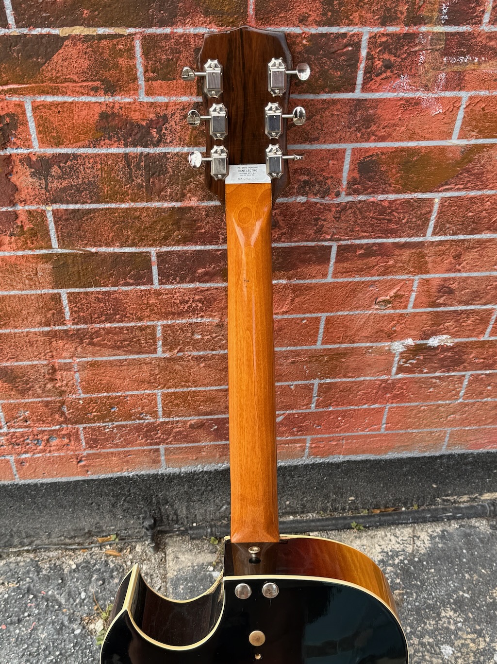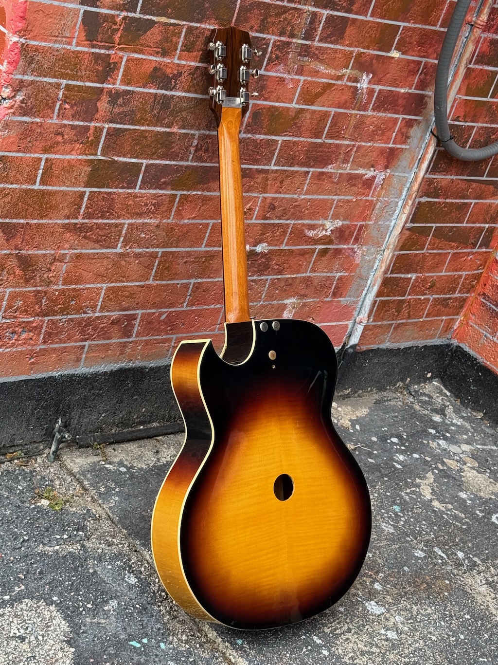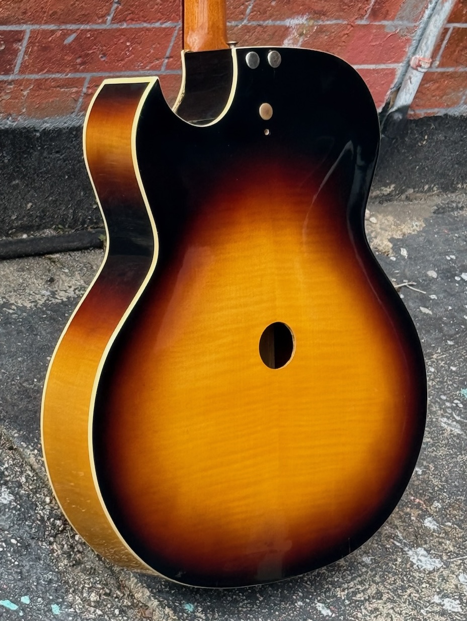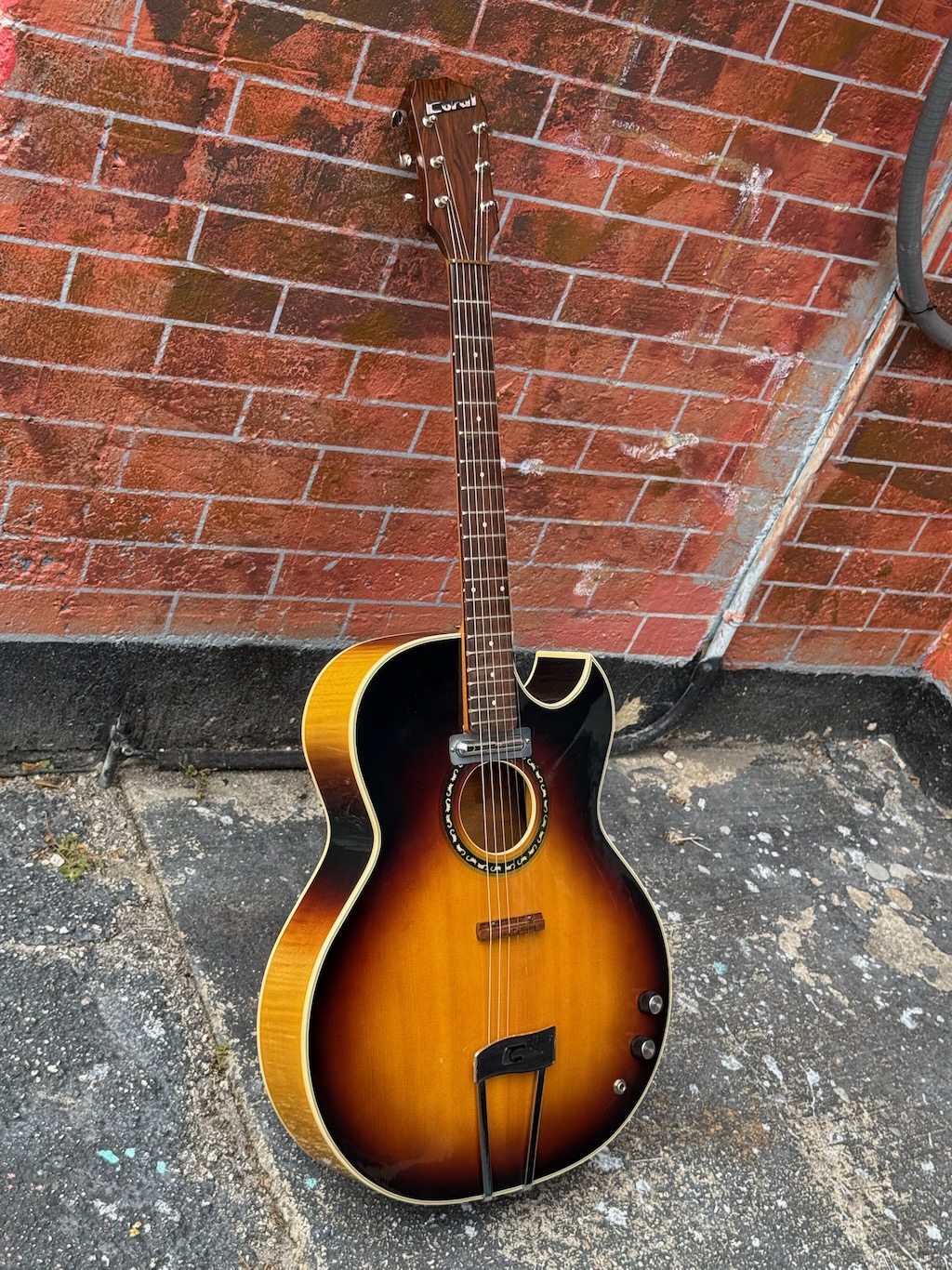 This is a very beautiful and rare Coral Vincent Bell Combo Acoustic from the early 1960s. It was designed by the legendary Vincent Bell and built by Coral/Danelectro in the USA. This unique hybrid between acoustic and electric guitar features its original lipstick pickup, delivering that signature bright and smooth Danelectro tone of the era. It’s truly  excellent overall condition, showing only minor signs of age. It remains fully original and fully functional. The neck is straight and comfortable, the action smooth, and the tone warm and articulate both amplified and unplugged. It’s missing an insert into the back of the body (see photo) & not sure what it did.