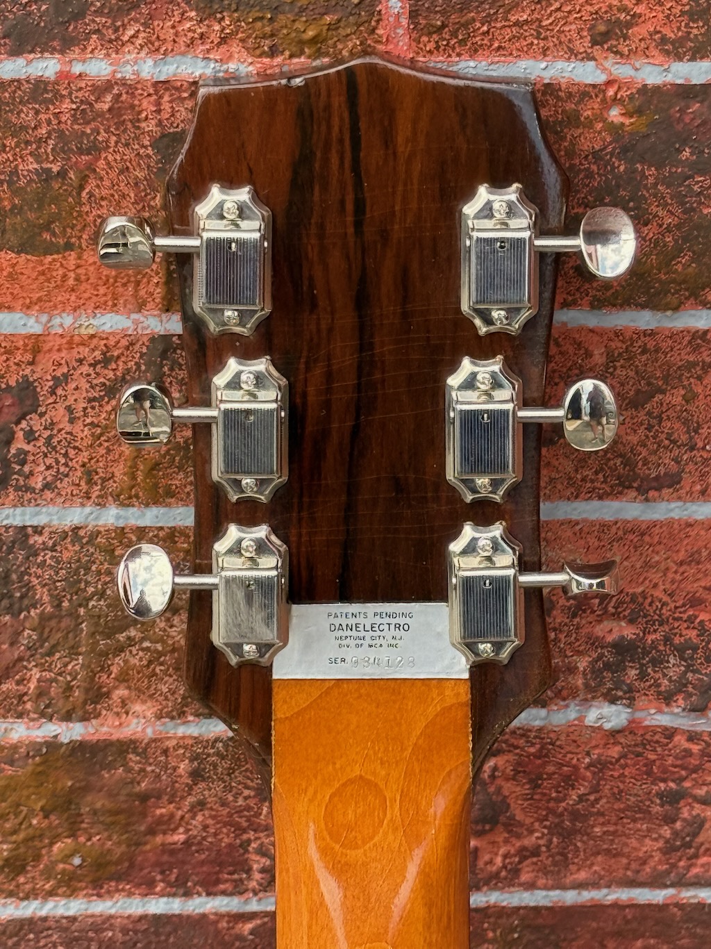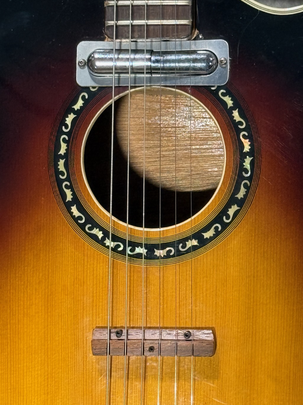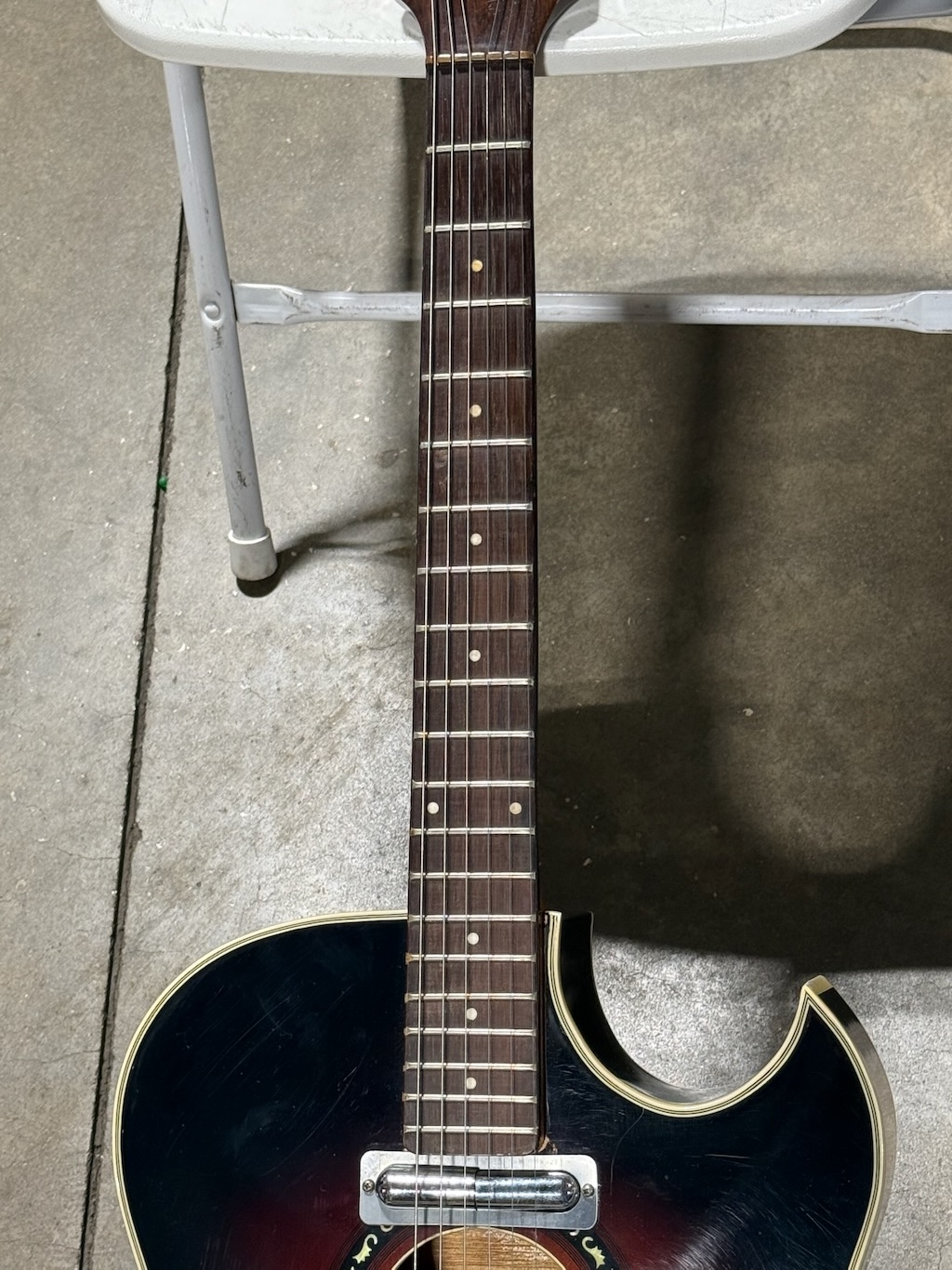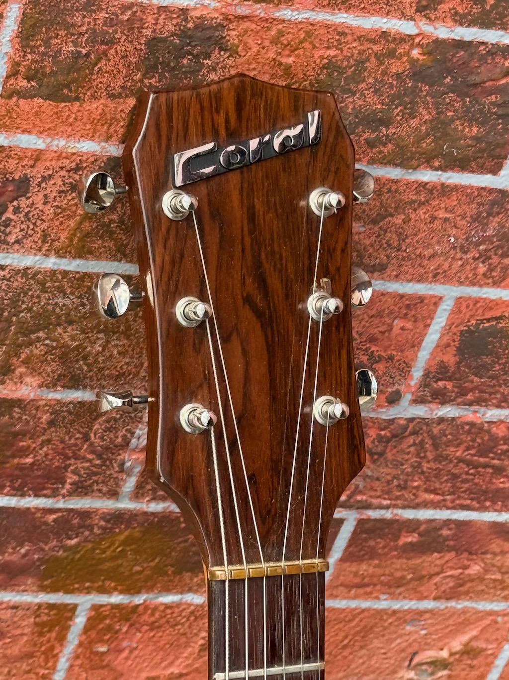 This is a very beautiful and rare Coral Vincent Bell Combo Acoustic from the early 1960s. It was designed by the legendary Vincent Bell and built by Coral/Danelectro in the USA. This unique hybrid between acoustic and electric guitar features its original lipstick pickup, delivering that signature bright and smooth Danelectro tone of the era. It’s truly  excellent overall condition, showing only minor signs of age. It remains fully original and fully functional. The neck is straight and comfortable, the action smooth, and the tone warm and articulate both amplified and unplugged. It’s missing an insert into the back of the body (see photo) & not sure what it did.