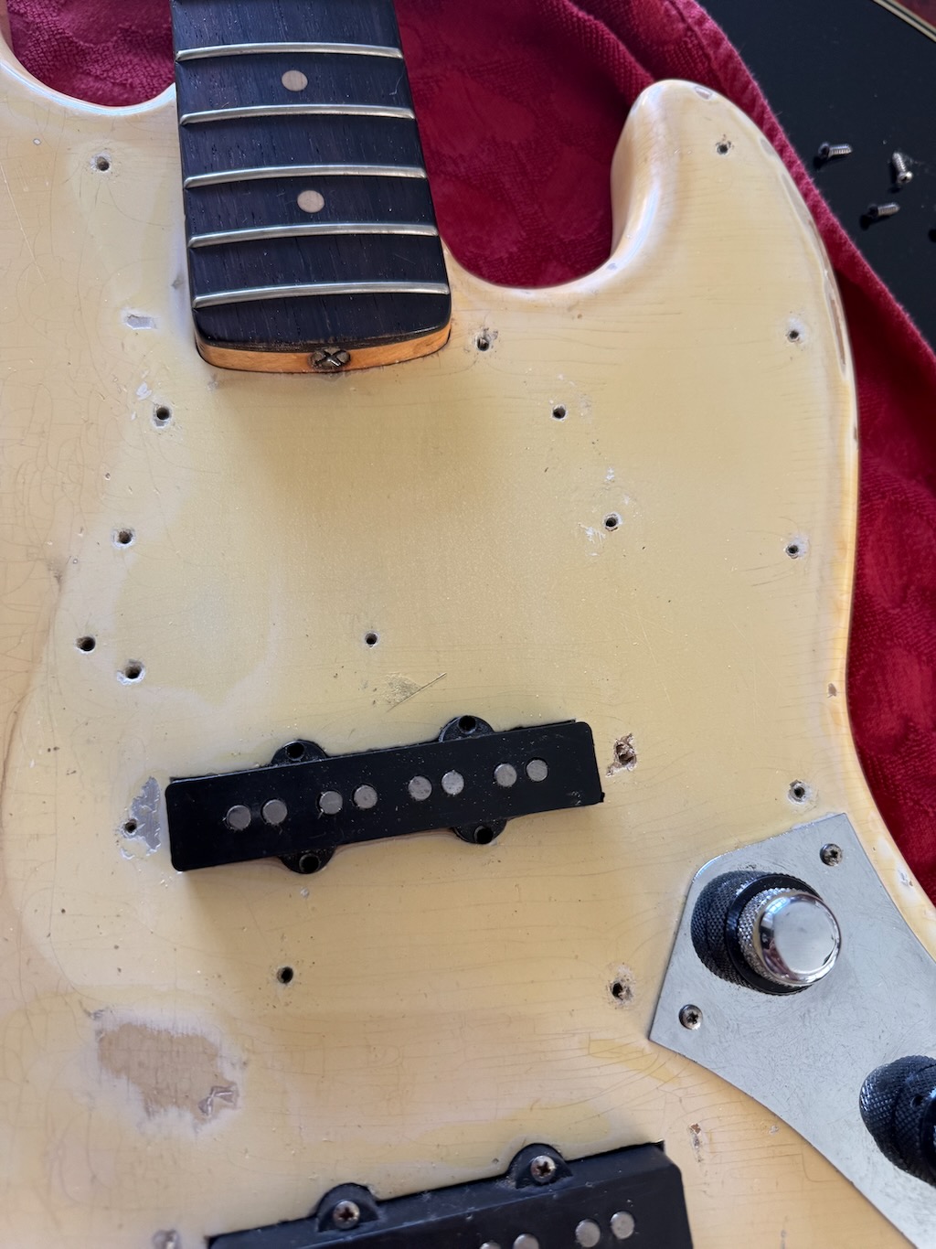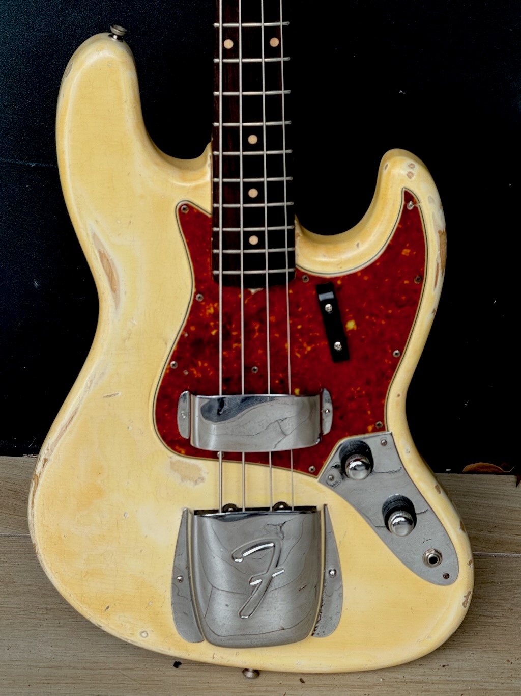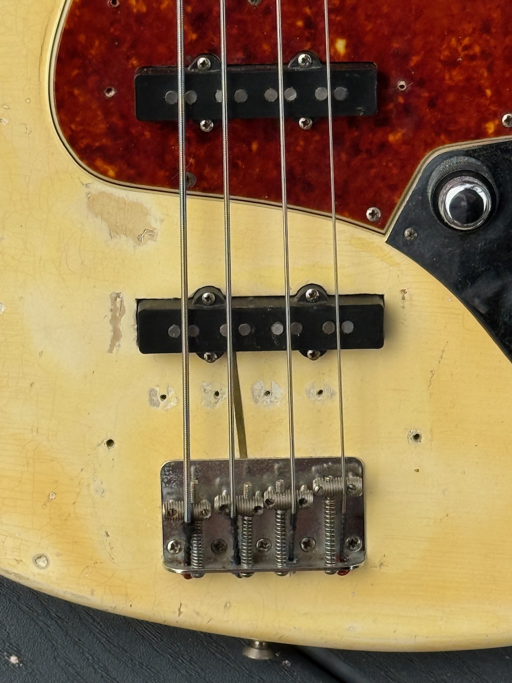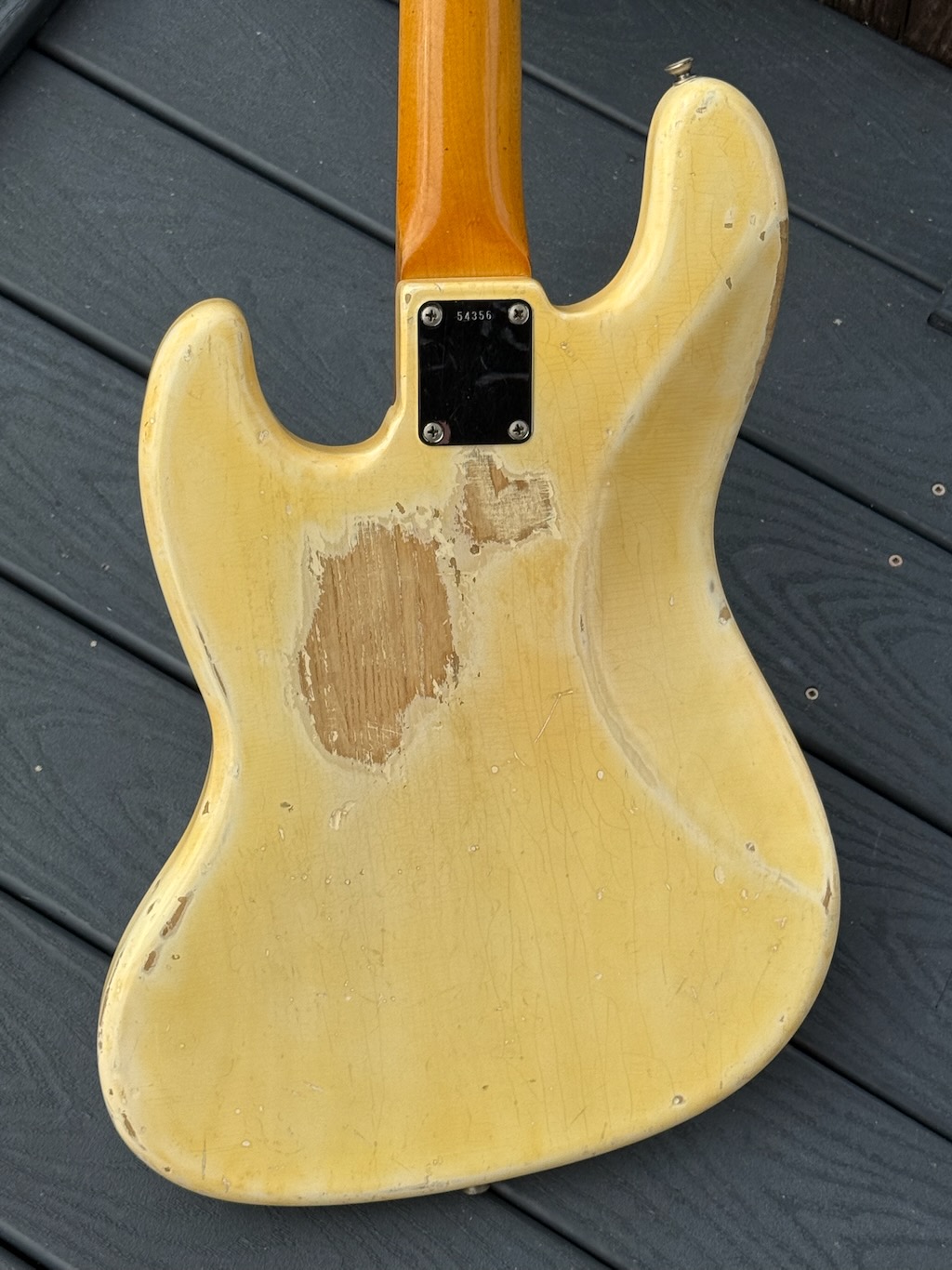 This is the ultimate find its 1 of the very earliest production Pre-CBS “Stacked Pot” Jazz Bass w/all the 1st issue features in all original condition, it has its original Olympic White finish over a very lightweight Alder body & weighing in at a scant 8 lbs. 10 oz; these Jazz Basses are ridiculously rare as we have not seen many from 1960, its “Unbound” Slab Rosewood Clay Dot neck is super slim as only the 1st ones were & has an all in one logo w/the “counter body” portion inclusive, she has a penciled neck date of 9/60 making it 1 of the very 1st few produced & perhaps the very 1st “Custom Color” White Jazz Bass ever, it’s sporting a very low serial # (54XXX) stamped on the 4-bolt neck plate, its original Tortoiseshell Nitro pickgard has that luscious color used only in 1960-1 w/1 small top chip reglued, its 2 pickups are super smooth w/that quintessential “Jaco” sound !, its stacked pot date codes are from the 25th week of 1960, its original control cavity has the earliest type copper solder plates, its so cool from its nickel tuners to its threaded saddle bridge w/outside ground wire in place w/its original “String Mute” screw holes, its all original in most respects w/only a pro-refret & its pickup leads being re-soldered, still retaining its original bridge & pickup covers w/a sticker & marker from 1 of its previous owners, a Mr. Lou Guardino from Florida, this is from Leo’s earliest Jazz Basses & has a gorgeous patina for a 66 year old original, it plays & feels incredible, other than having some major play time all over, she’s still excellent overall, 1 of the best & most desirable examples on Earth, comes complete in her original Brown Tolex/Orange lined Hard Case.