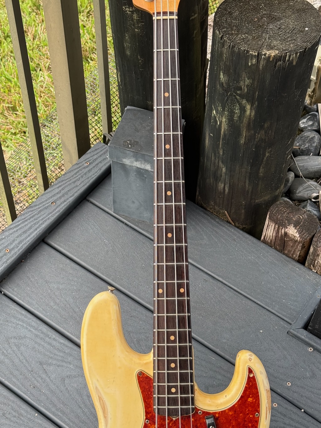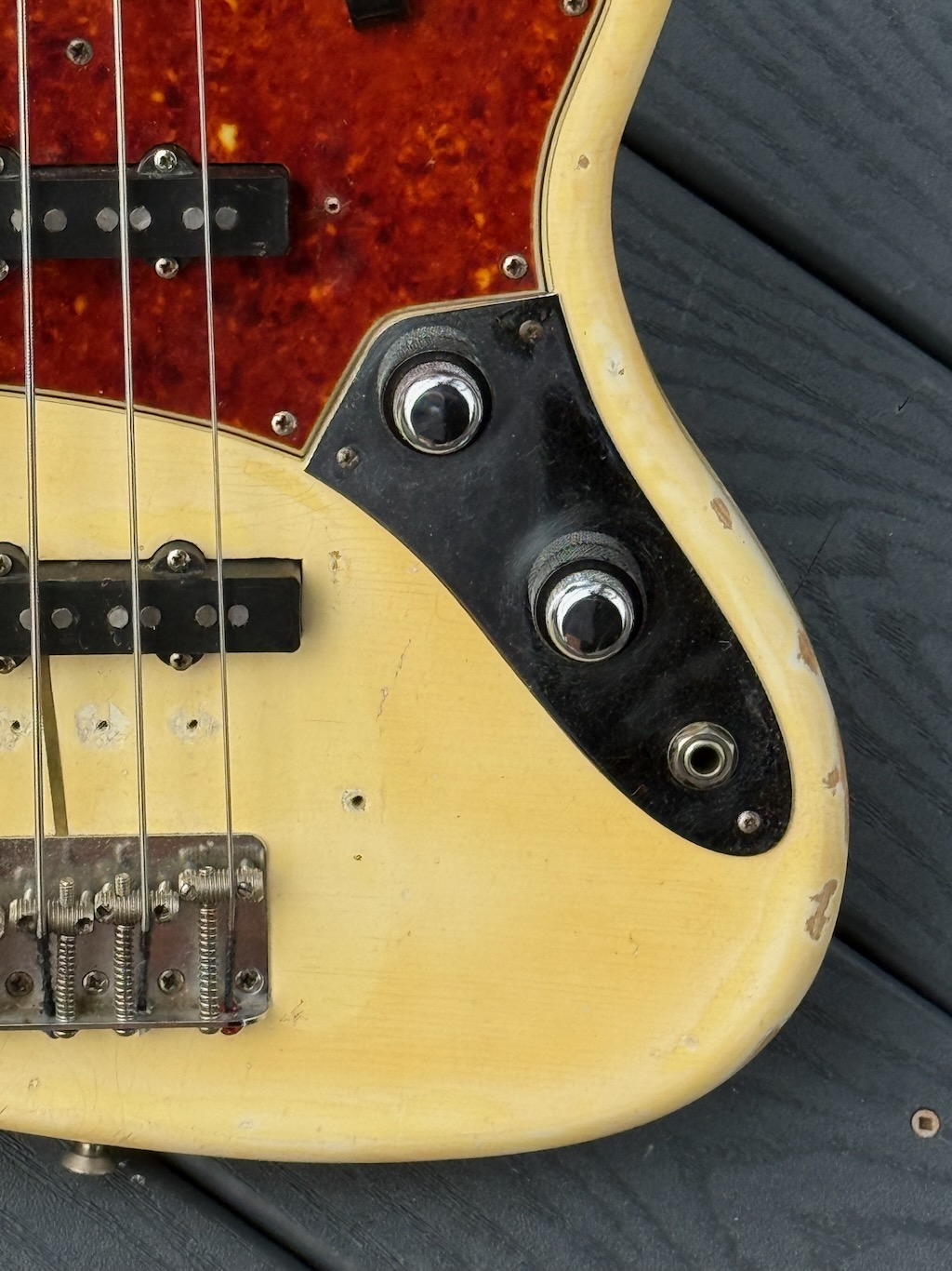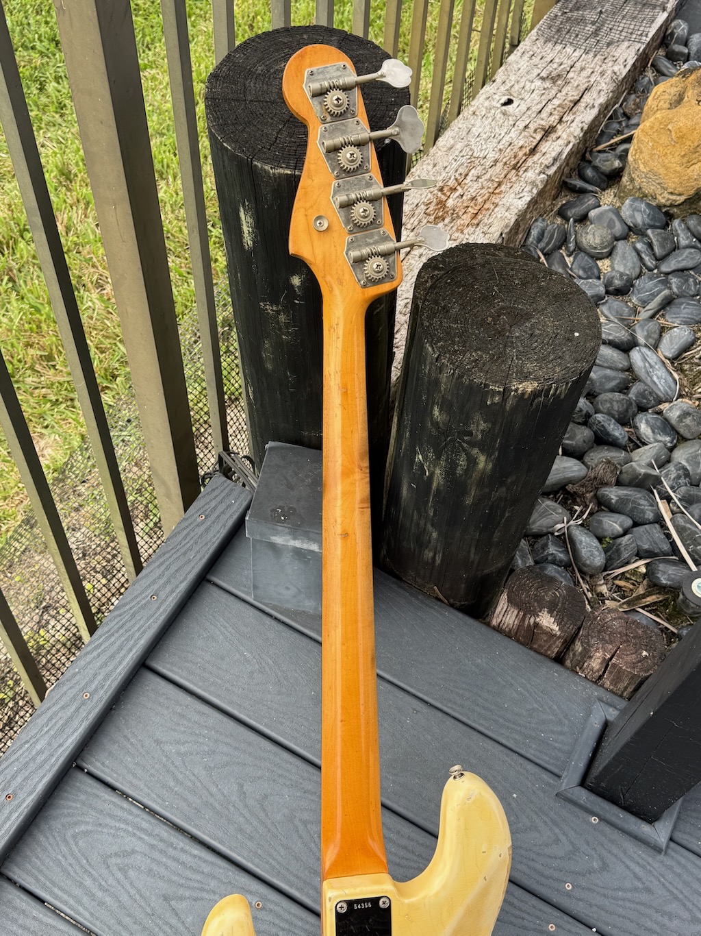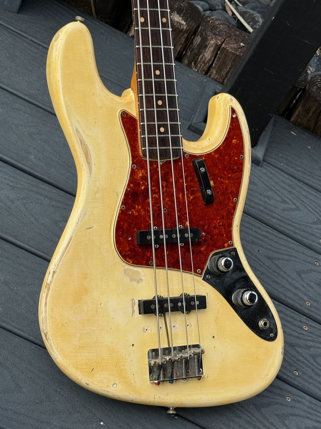 This is the ultimate find its 1 of the very earliest production Pre-CBS “Stacked Pot” Jazz Bass w/all the 1st issue features in all original condition, it has its original Olympic White finish over a very lightweight Alder body & weighing in at a scant 8 lbs. 10 oz; these Jazz Basses are ridiculously rare as we have not seen many from 1960, its “Unbound” Slab Rosewood Clay Dot neck is super slim as only the 1st ones were & has an all in one logo w/the “counter body” portion inclusive, she has a penciled neck date of 9/60 making it 1 of the very 1st few produced & perhaps the very 1st “Custom Color” White Jazz Bass ever, it’s sporting a very low serial # (54XXX) stamped on the 4-bolt neck plate, its original Tortoiseshell Nitro pickgard has that luscious color used only in 1960-1 w/1 small top chip reglued, its 2 pickups are super smooth w/that quintessential “Jaco” sound !, its stacked pot date codes are from the 25th week of 1960, its original control cavity has the earliest type copper solder plates, its so cool from its nickel tuners to its threaded saddle bridge w/outside ground wire in place w/its original “String Mute” screw holes, its all original in most respects w/only a pro-refret & its pickup leads being re-soldered, still retaining its original bridge & pickup covers w/a sticker & marker from 1 of its previous owners, a Mr. Lou Guardino from Florida, this is from Leo’s earliest Jazz Basses & has a gorgeous patina for a 66 year old original, it plays & feels incredible, other than having some major play time all over, she’s still excellent overall, 1 of the best & most desirable examples on Earth, comes complete in her original Brown Tolex/Orange lined Hard Case.