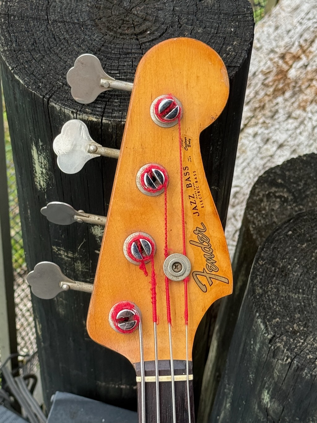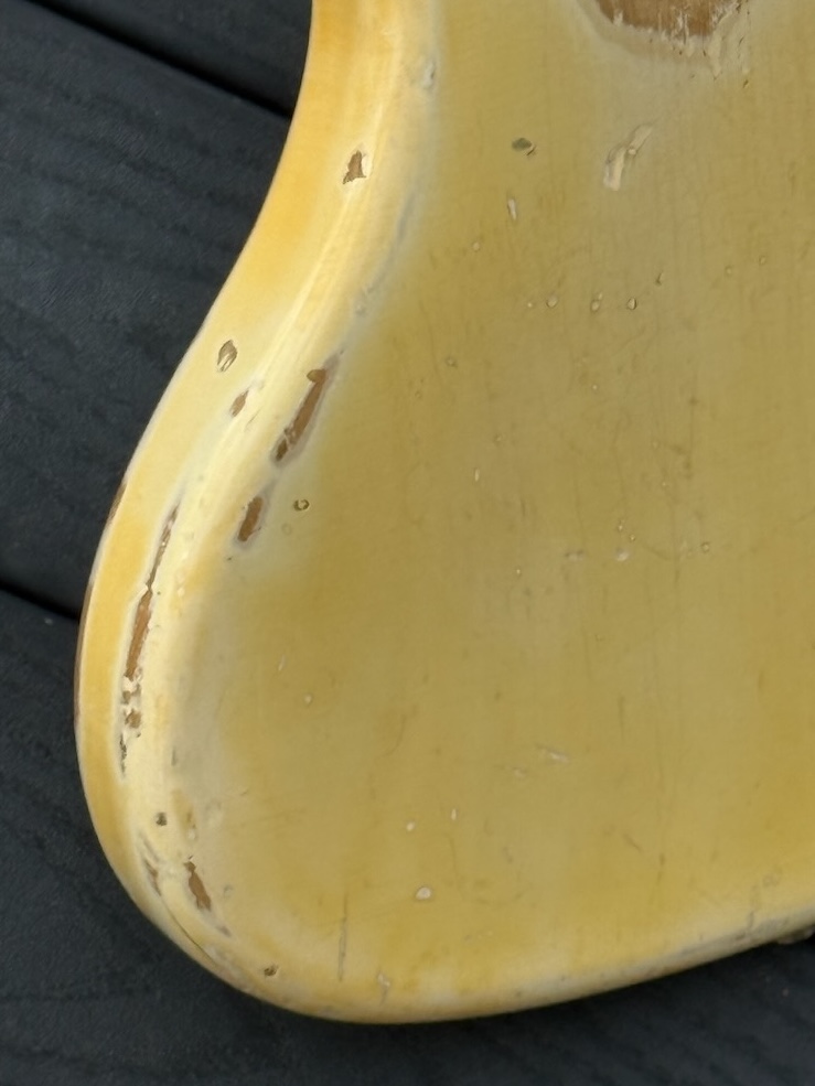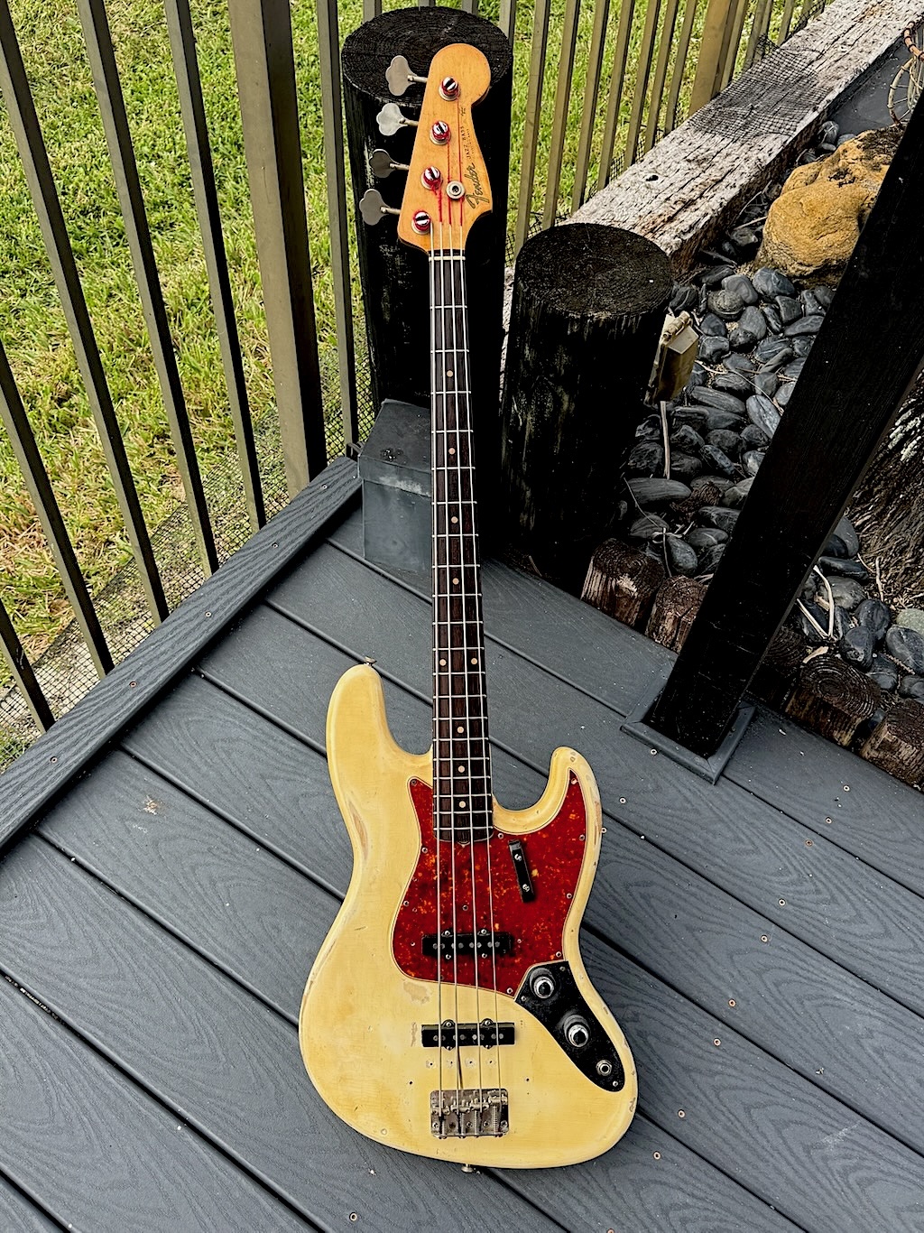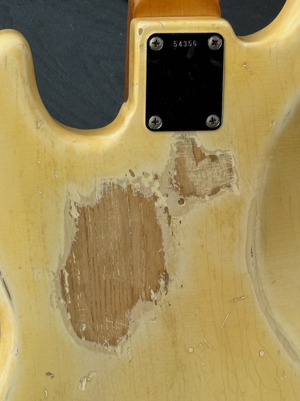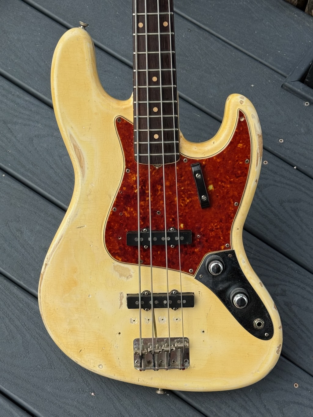 This is the ultimate find its 1 of the very earliest production Pre-CBS “Stacked Pot” Jazz Bass w/all the 1st issue features in all original condition, it has its original Olympic White finish over a very lightweight Alder body & weighing in at a scant 8 lbs. 10 oz; these Jazz Basses are ridiculously rare as we have not seen many from 1960, its “Unbound” Slab Rosewood Clay Dot neck is super slim as only the 1st ones were & has an all in one logo w/the “counter body” portion inclusive, she has a penciled neck date of 9/60 making it 1 of the very 1st few produced & perhaps the very 1st “Custom Color” White Jazz Bass ever, it’s sporting a very low serial # (54XXX) stamped on the 4-bolt neck plate, its original Tortoiseshell Nitro pickgard has that luscious color used only in 1960-1 w/1 small top chip reglued, its 2 pickups are super smooth w/that quintessential “Jaco” sound !, its stacked pot date codes are from the 25th week of 1960, its original control cavity has the earliest type copper solder plates, its so cool from its nickel tuners to its threaded saddle bridge w/outside ground wire in place w/its original “String Mute” screw holes, its all original in most respects w/only a pro-refret & its pickup leads being re-soldered, still retaining its original bridge & pickup covers w/a sticker & marker from 1 of its previous owners, a Mr. Lou Guardino from Florida, this is from Leo’s earliest Jazz Basses & has a gorgeous patina for a 66 year old original, it plays & feels incredible, other than having some major play time all over, she’s still excellent overall, 1 of the best & most desirable examples on Earth, comes complete in her original Brown Tolex/Orange lined Hard Case.