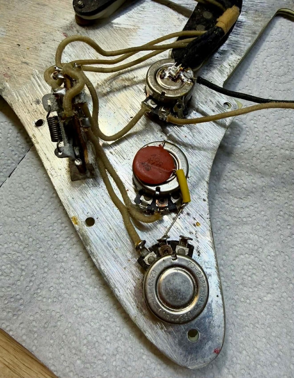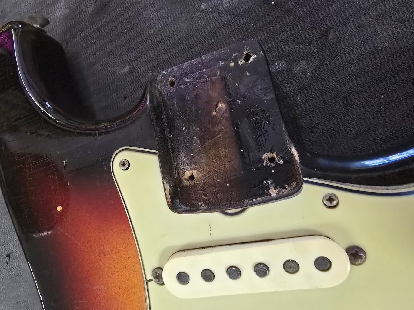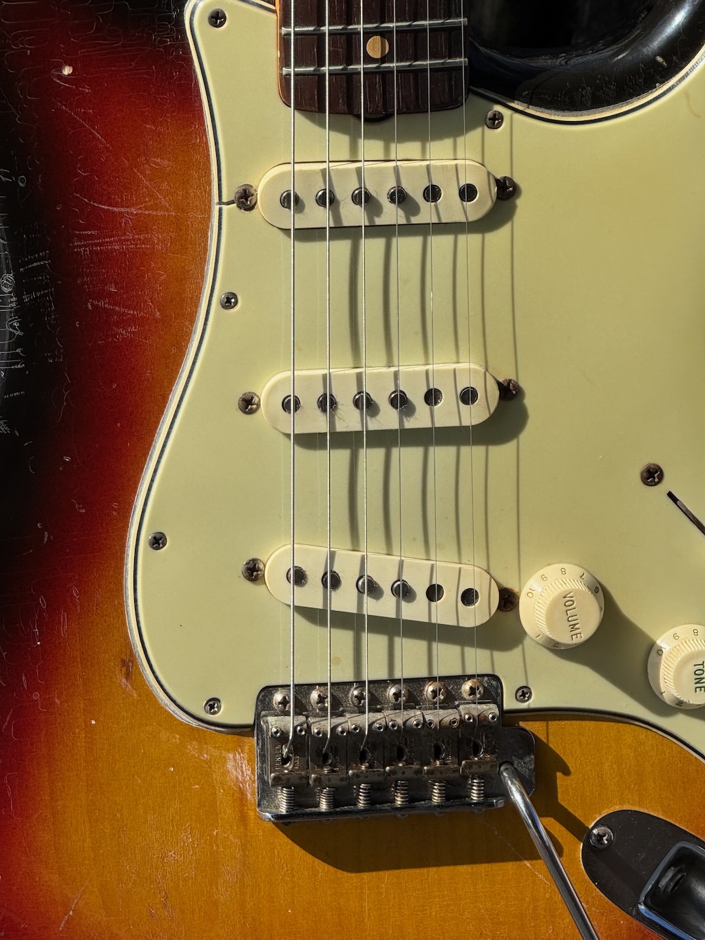 This is the ultimate all original & perhaps the most popular “Stevie Ray Vaughn” era Pre-CBS Stratocaster in all original condition. It has its original bright 3-Tone’burst finish over a very lightweight Alder body pencil dated 8/63 in the Trem cavity. These mid-1963 Strats were the best period prior to when CBS was going to acquire Fender in late ’64. This has a neck date stamped June 1963 & are quite perfect in both feel playability like no others. It’s sporting a very low serial # (L01XXx) stamped on its 4-bolt neck plate, its original Green’gard has 1 screw crackle & 1 small chippy in it. Its 3 Pickups are absolutely fantastic (both Top & Bottom pickups rewound) w/that quintessential Strat tone ! Its pot date codes are from the 24th week of 1963, Its so cool from its nickel tuners to its pat. pend. 6 saddle bridge. She has a gorgeous patina for a 63 year old original, it plays & feels incredible, other than having some major play time, she’s still rather Excellent. 1 of the coolest & most desirable examples on Earth, she comes complete w/its original Brown Tolex case.