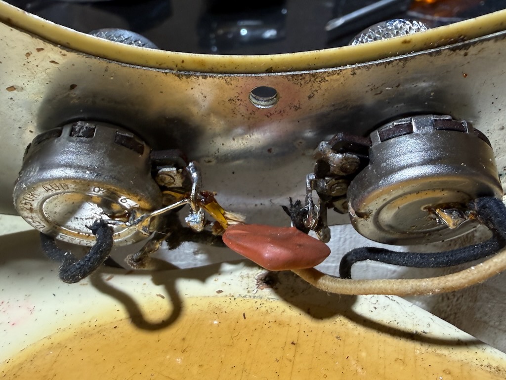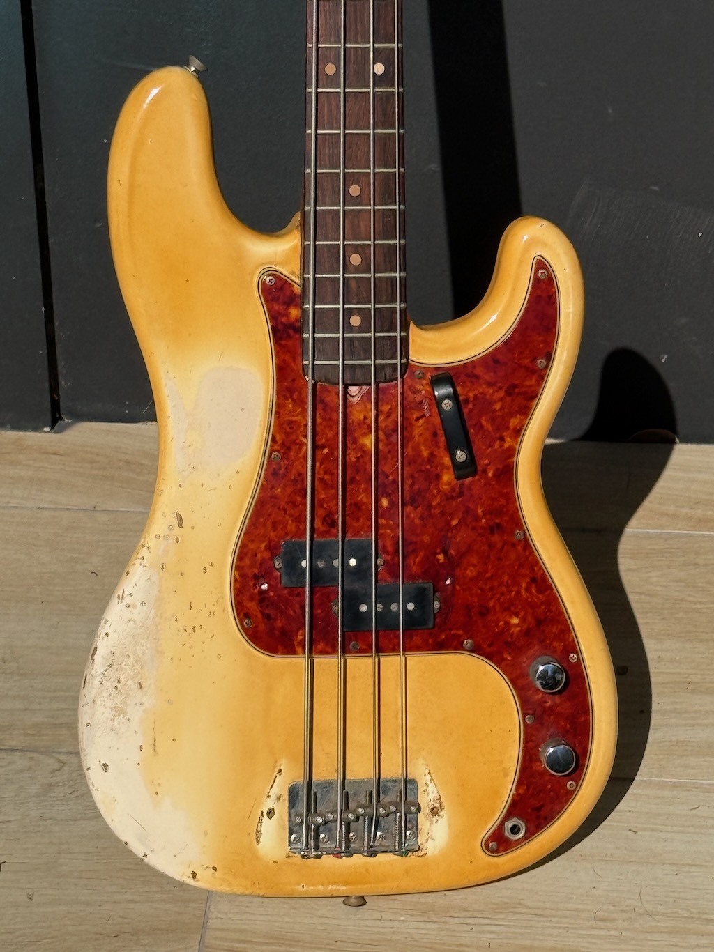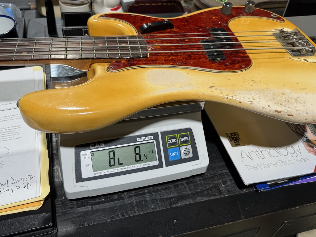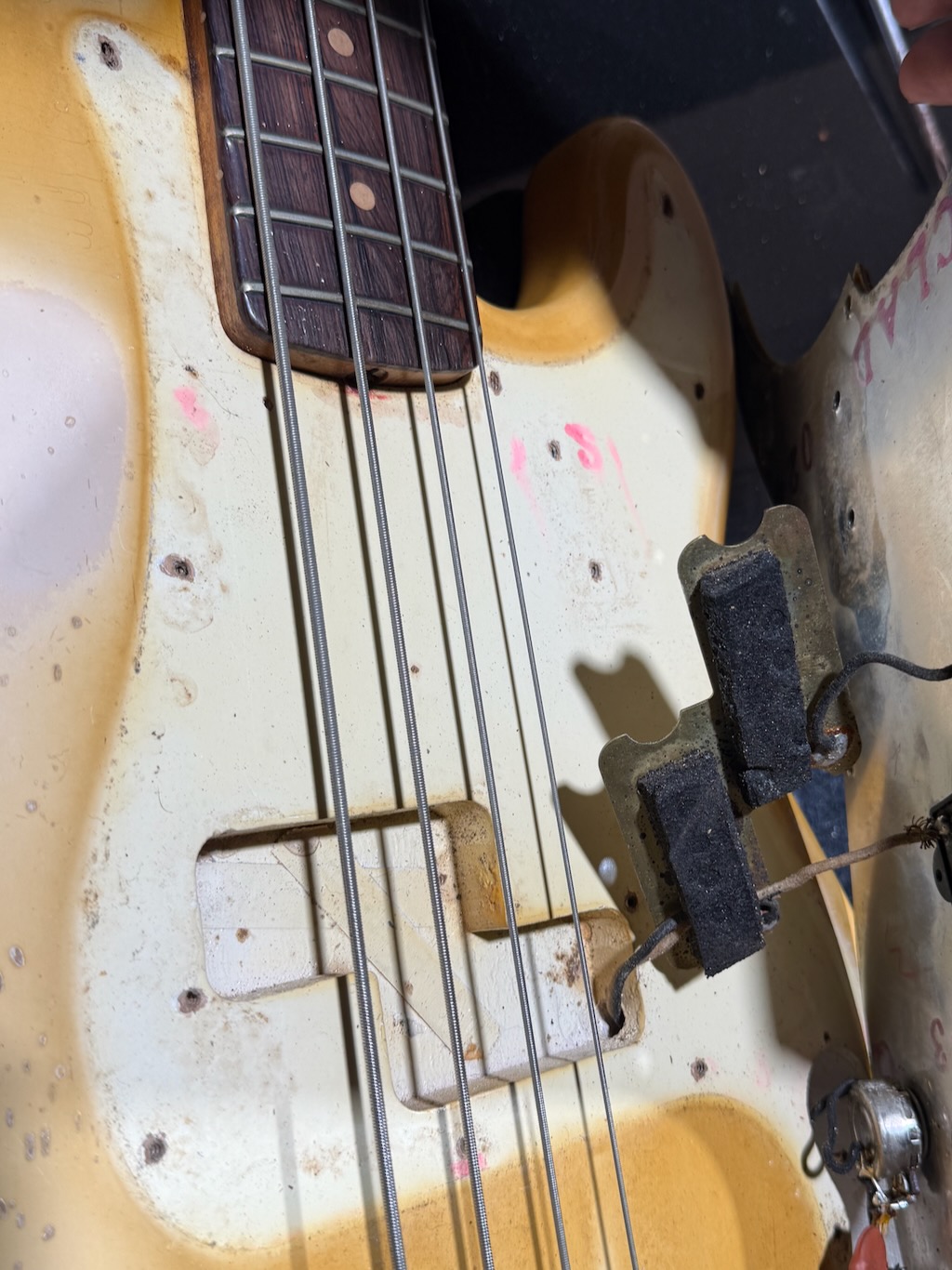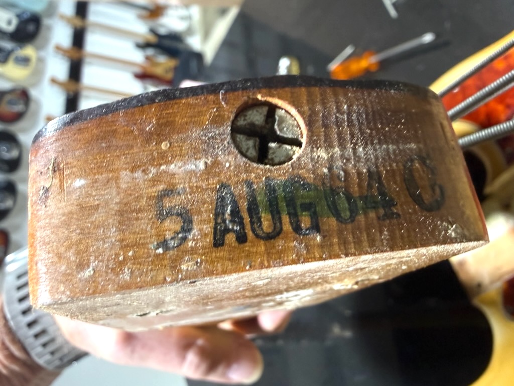 Check out this really collectible & all original 1964 Fender Precision Bass w/all Pre-CBS features in the rare Custom Color of Olympic White over an alder body, its yellowed over the years & its got some nice fade & plenty of play time all over. It’s got a dark Brazilian Rosewood fingerboard w/clay dot inlays dated to August 1964. It also has its original pepperoni colored tortoise’gard w/that beautiful classic color combo. Its split pickup is super smooth & its pot codes date to the 47th week of 1964. It’s the coolest Pre-CBS period P Bass w/all the coolest traits that’s excellent – overall & comes w/its nice original Black Tolex hard case.