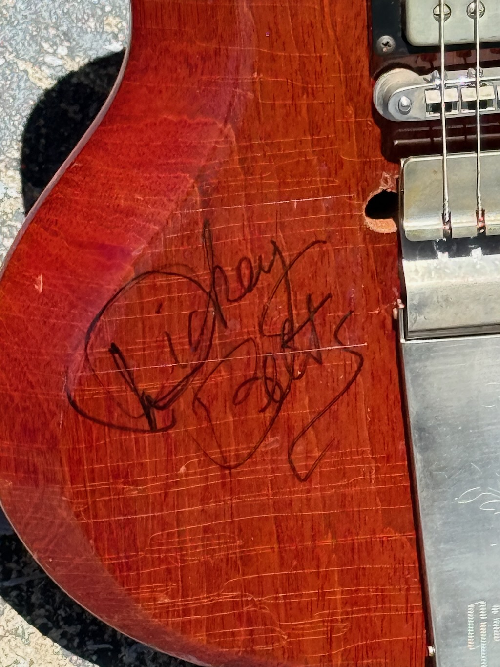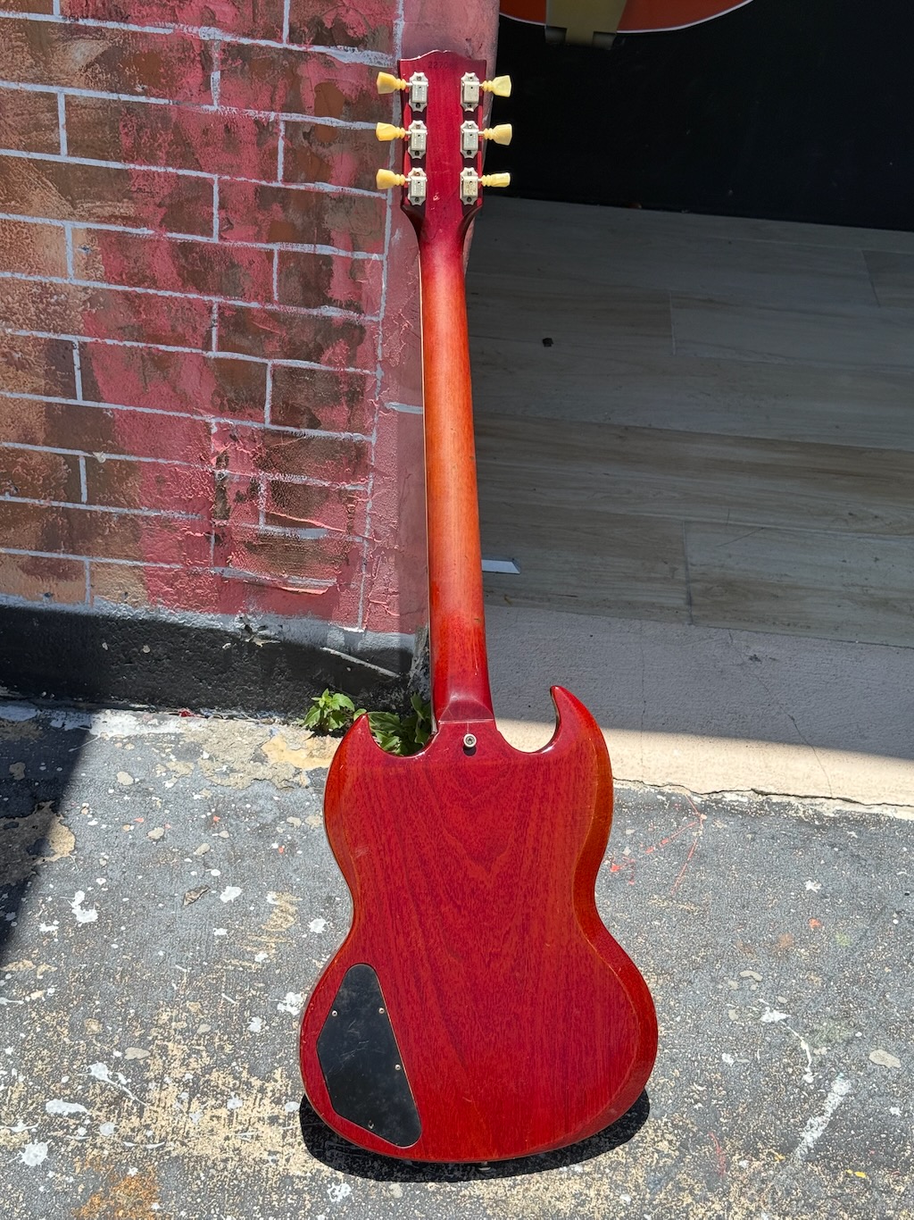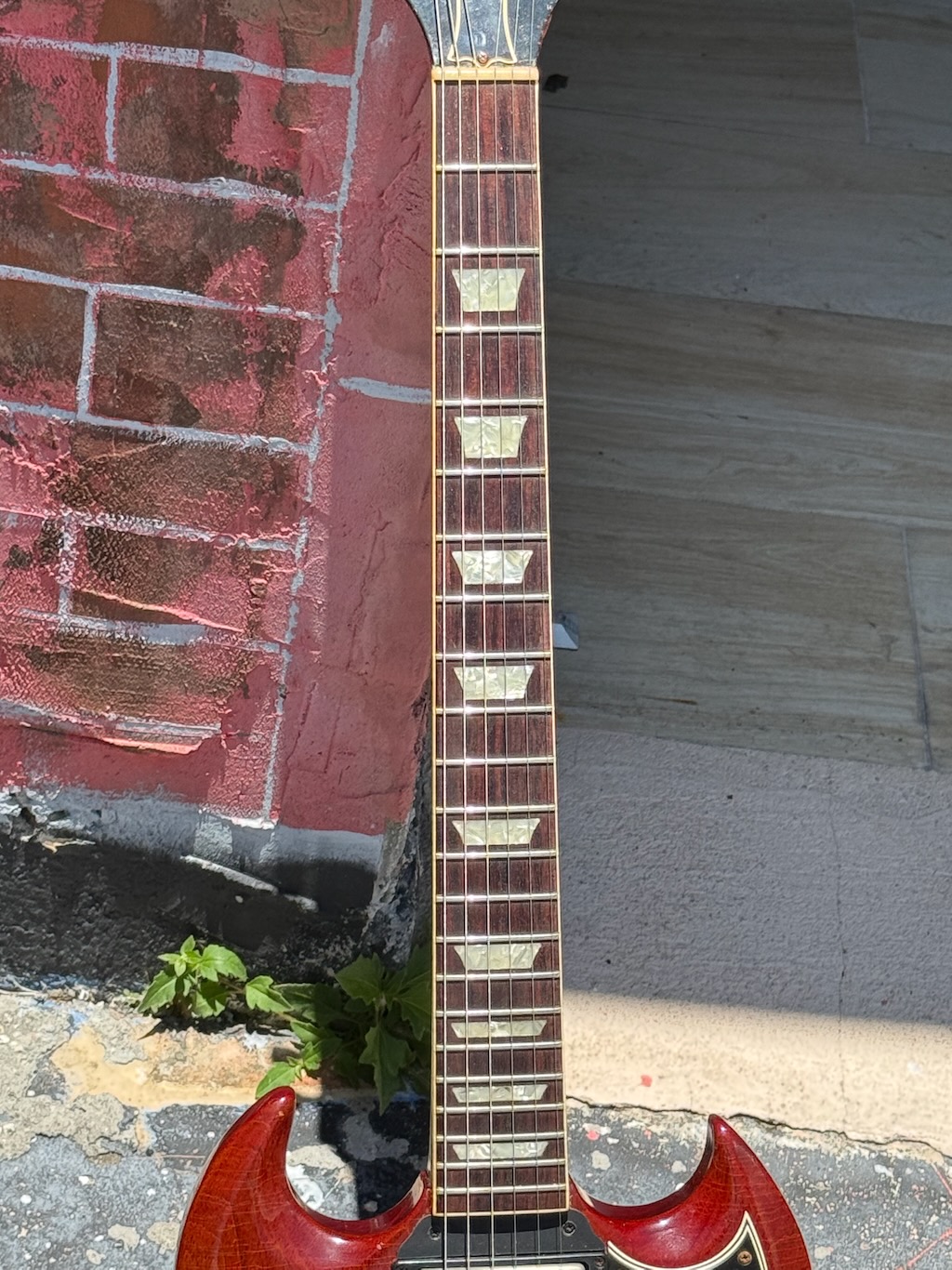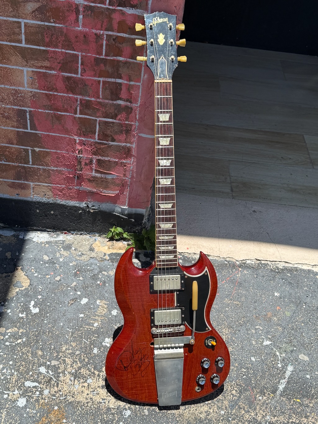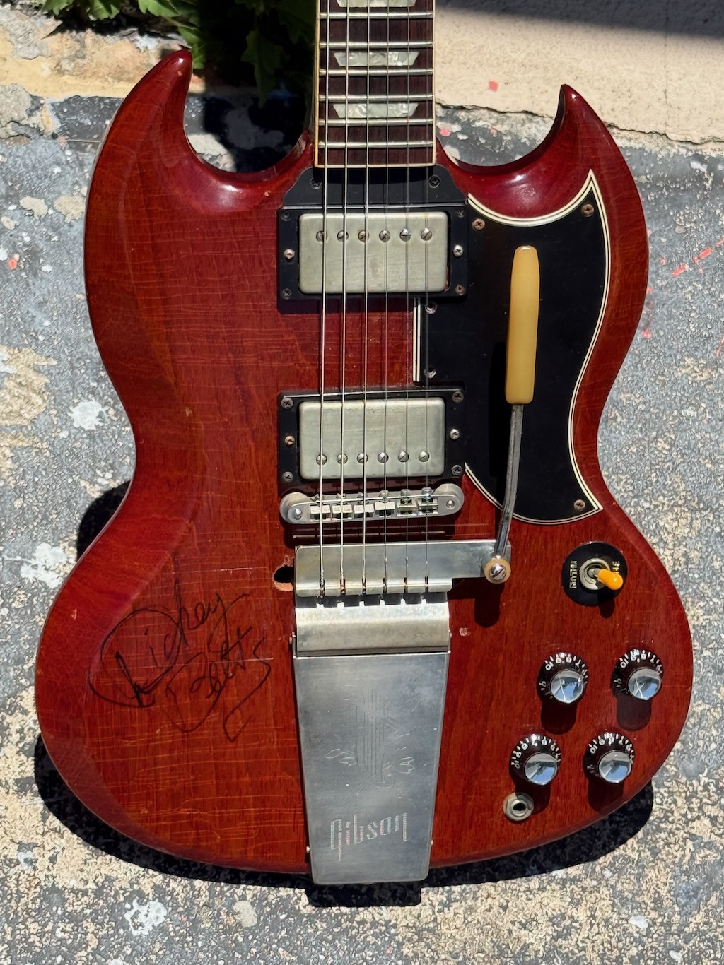 This is a very cool 1964 Gibson SG Std. in the beautiful beat sweet faded cherry finish. This is a very rare & original Harrison “Beatle” spec SG Std. This has a nice 1 piece mahogany neck that is 1 11/16″ wide at the nut. It is in very good shape overall w/a ton of patina & has a powerful pair of Reissue PAF’s of unknown origin, that kick ass for sure. It’s equipped w/a set of original double line double ring Kluson tuners w/a factory long Maestro Vibrato unit. Its pickgard is beautiful & goes well w/its nickel parts & chrome capped black knobs. Its had a hard life w/a well repaired headstock crack & a pair of stop bar holes drilled out in the top. The coolest part of this vibey bad ass SG is that it’s autographed by none other than the slide king himself, “Mr. Dickey Betts” w/pics to prove its authenticity. But the cool factor just flows from this bad boy as you can see. It’s been played a bunch & ready to gig with today. It’s a very cool 61 year old user friendly axe ready to rip on some Allman or Beatle gigs. It’s quite cool in every respect & comes in a decent hard case.