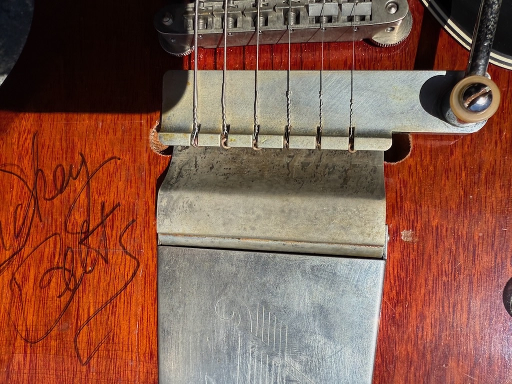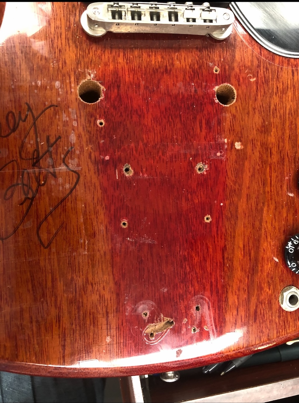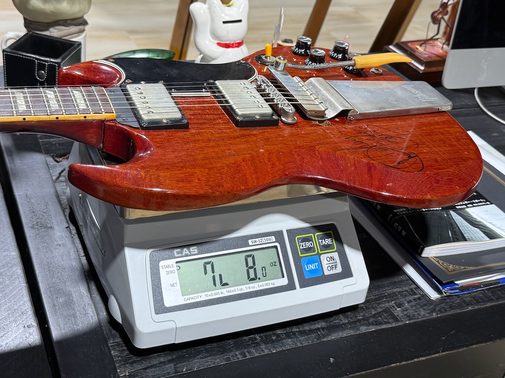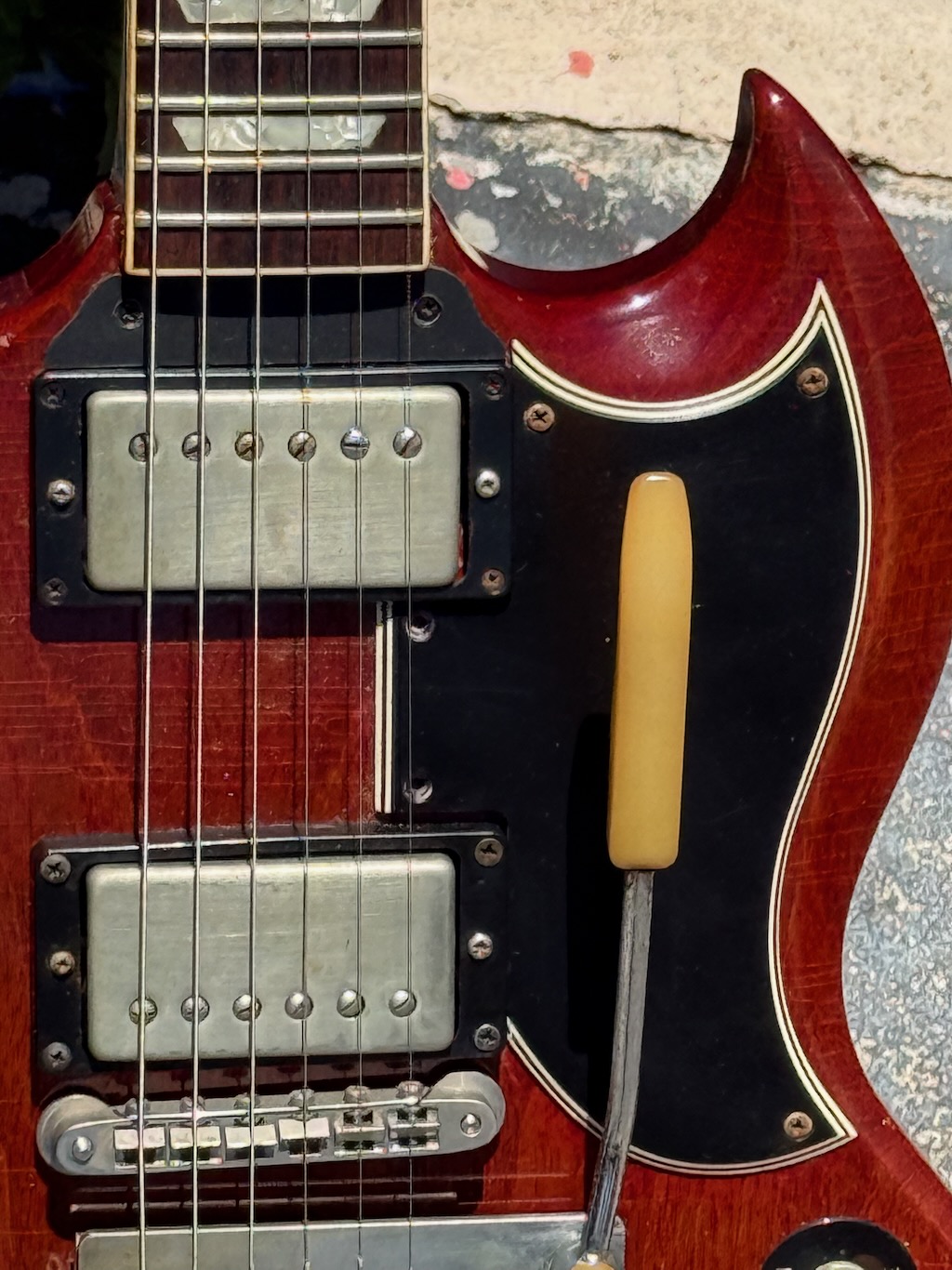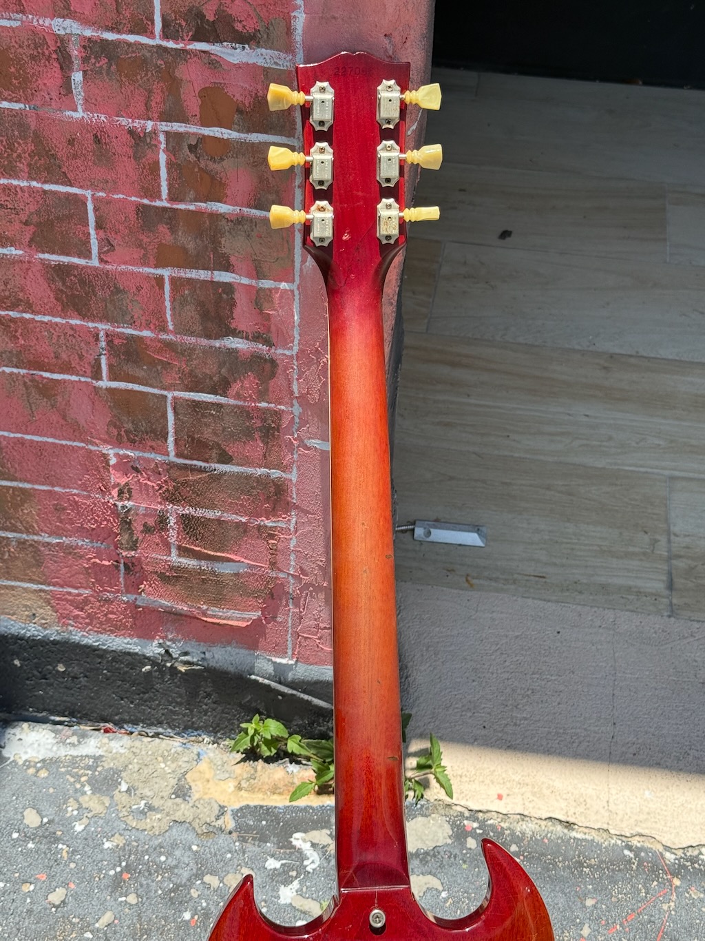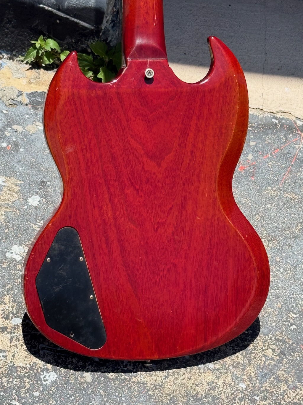 This is a very cool 1964 Gibson SG Std. in the beautiful beat sweet faded cherry finish. This is a very rare & original Harrison “Beatle” spec SG Std. This has a nice 1 piece mahogany neck that is 1 11/16″ wide at the nut. It is in very good shape overall w/a ton of patina & has a powerful pair of Reissue PAF’s of unknown origin, that kick ass for sure. It’s equipped w/a set of original double line double ring Kluson tuners w/a factory long Maestro Vibrato unit. Its pickgard is beautiful & goes well w/its nickel parts & chrome capped black knobs. Its had a hard life w/a well repaired headstock crack & a pair of stop bar holes drilled out in the top. The coolest part of this vibey bad ass SG is that it’s autographed by none other than the slide king himself, “Mr. Dickey Betts” w/pics to prove its authenticity. But the cool factor just flows from this bad boy as you can see. It’s been played a bunch & ready to gig with today. It’s a very cool 61 year old user friendly axe ready to rip on some Allman or Beatle gigs. It’s quite cool in every respect & comes in a decent hard case.
