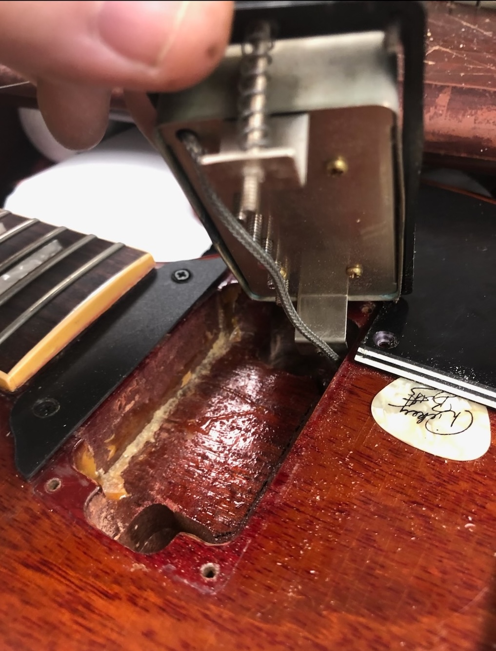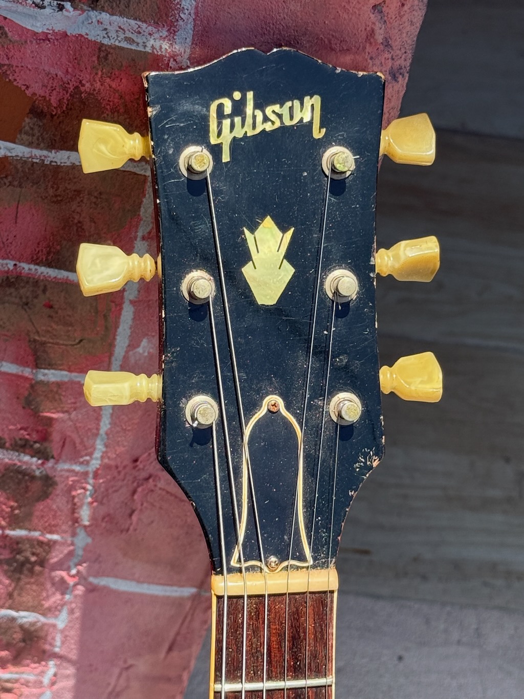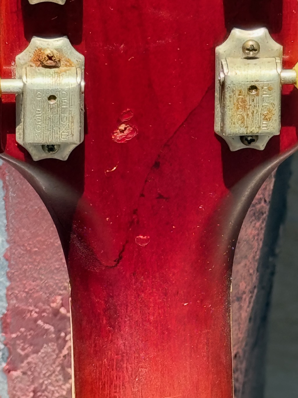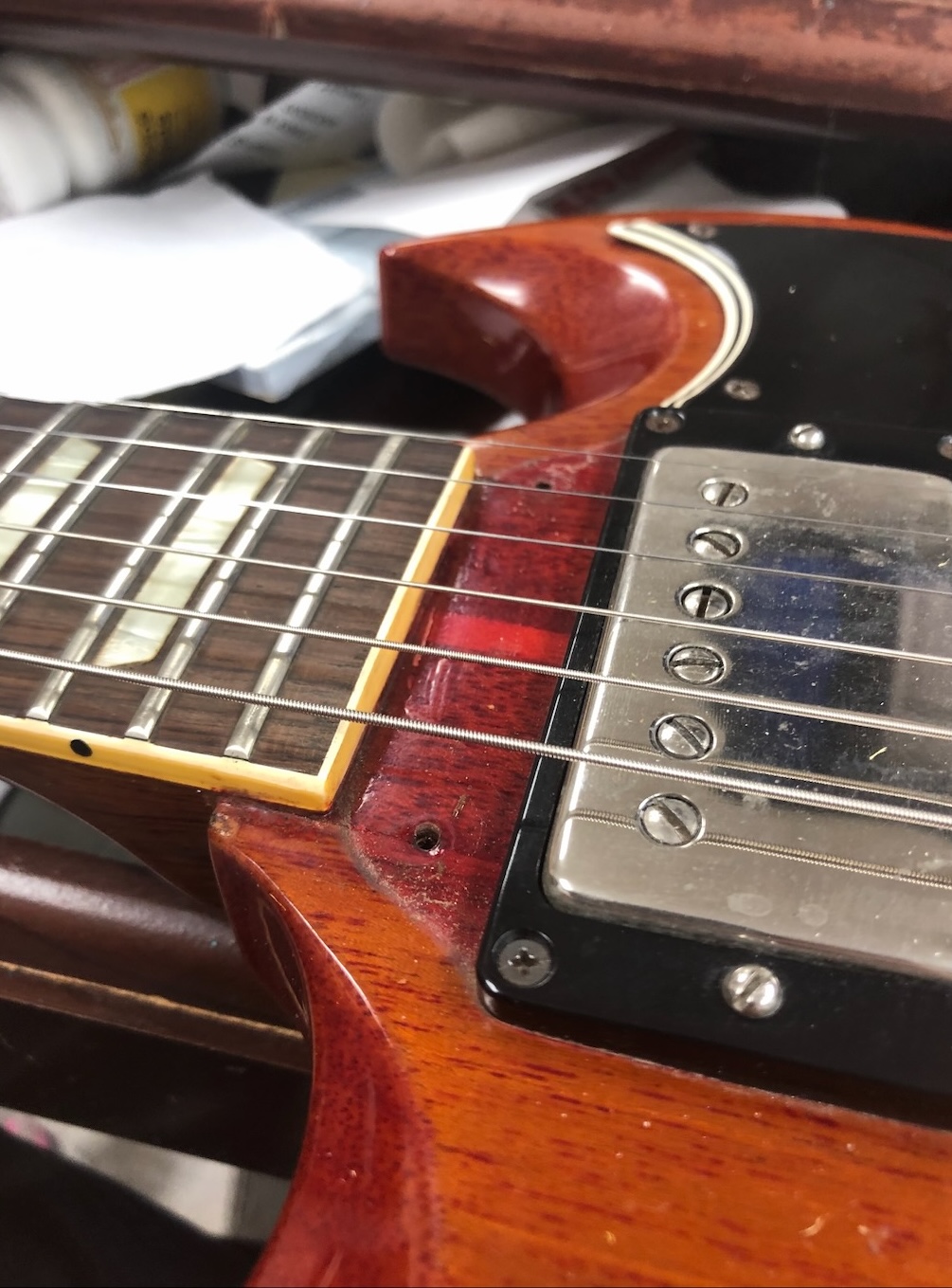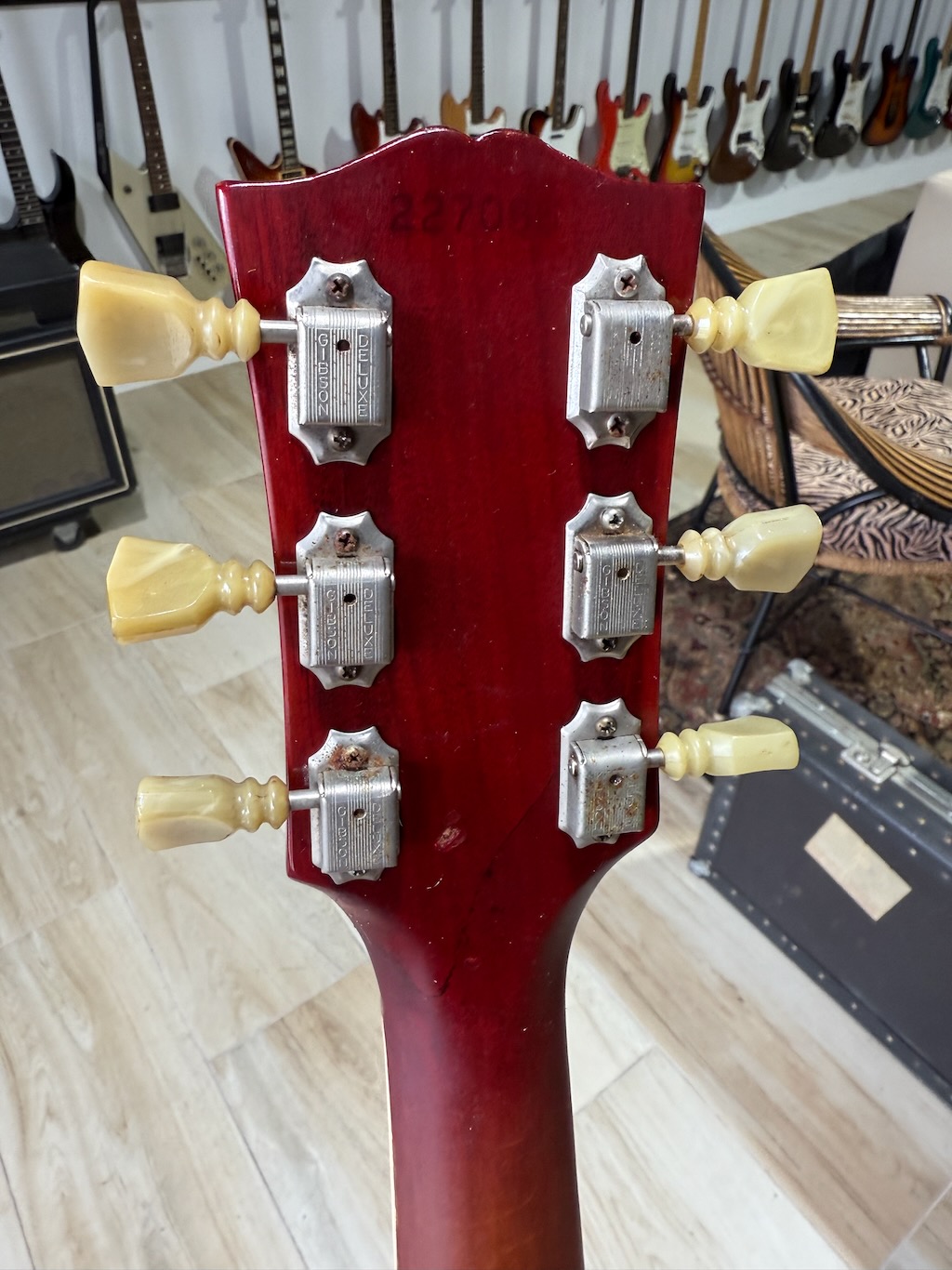 This is a very cool 1964 Gibson SG Std. in the beautiful beat sweet faded cherry finish. This is a very rare & original Harrison “Beatle” spec SG Std. This has a nice 1 piece mahogany neck that is 1 11/16″ wide at the nut. It is in very good shape overall w/a ton of patina & has a powerful pair of Reissue PAF’s of unknown origin, that kick ass for sure. It’s equipped w/a set of original double line double ring Kluson tuners w/a factory long Maestro Vibrato unit. Its pickgard is beautiful & goes well w/its nickel parts & chrome capped black knobs. Its had a hard life w/a well repaired headstock crack & a pair of stop bar holes drilled out in the top. The coolest part of this vibey bad ass SG is that it’s autographed by none other than the slide king himself, “Mr. Dickey Betts” w/pics to prove its authenticity. But the cool factor just flows from this bad boy as you can see. It’s been played a bunch & ready to gig with today. It’s a very cool 61 year old user friendly axe ready to rip on some Allman or Beatle gigs. It’s quite cool in every respect & comes in a decent hard case.
