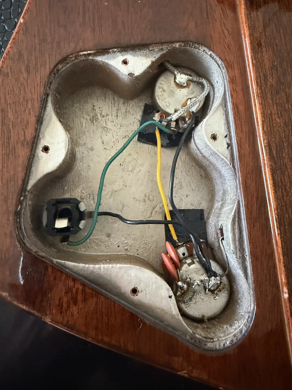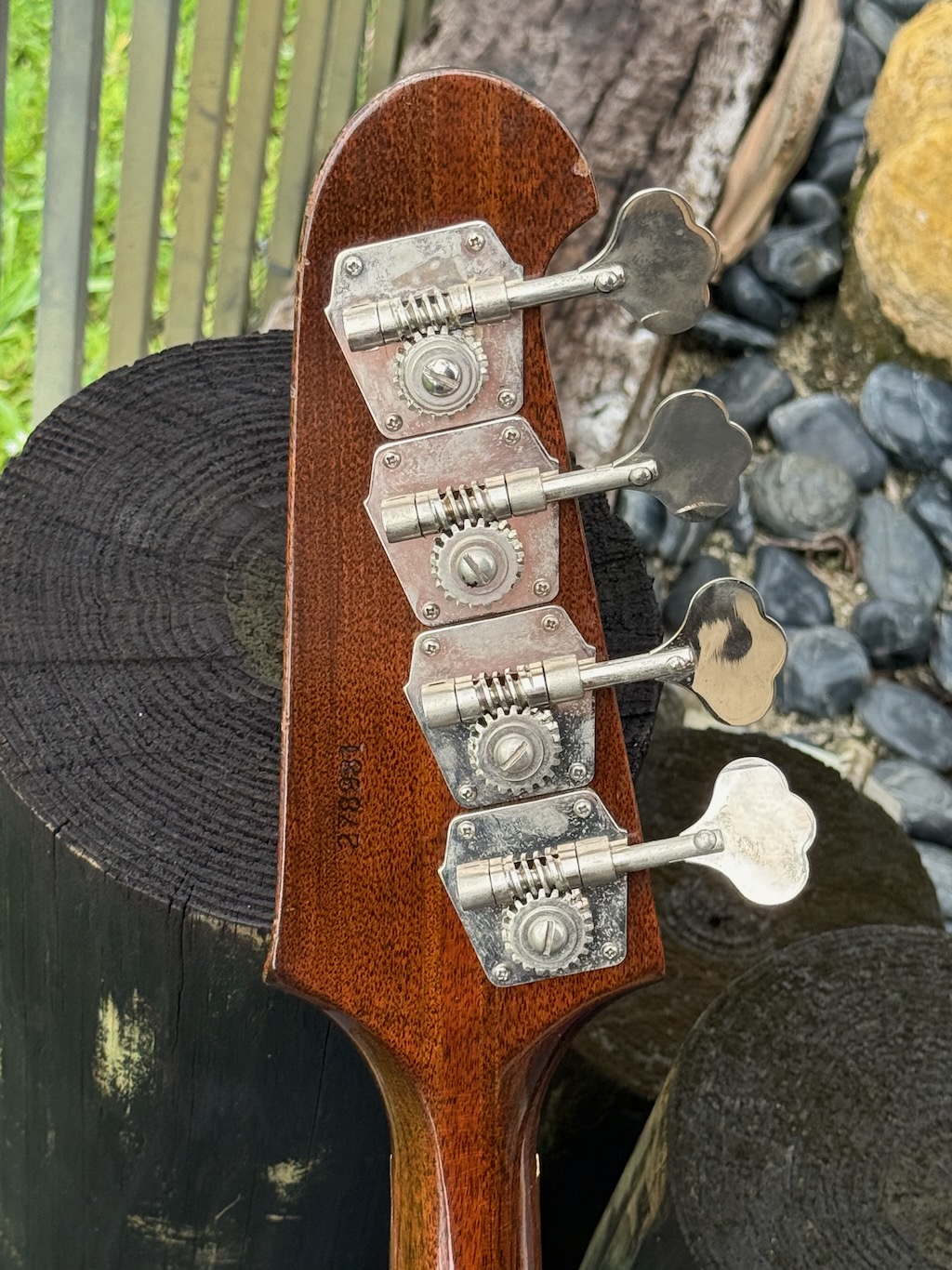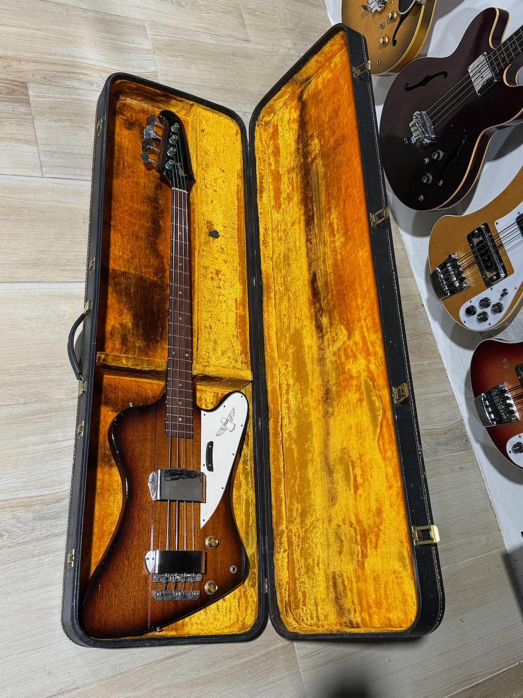 These early production Reverse” Thunderbird’s & Firebird’s were so far ahead of time & very few were ever made comparatively to Fender’s P & J Basses. This particular example was ordered in Gibson’s most popular color of a Dark 2-tone Sunburst finish all over its pretty mahogany neck & body. Very little yellowing appears yet she has slight playtime all over. These tend to get funky from playing in bars & clubs & get nicotine stained. Its rosewood fingerboard is straight as an arrow & its neck is very playable. It’s nickel plated pickup cover & all parts are all original & faded like they should be. It has some weather checking up here & there down the back of the neck & body. Its original pickup sound like a Precision Bass w/a thinner nut than most Gibsons & a very straight neck. Its original pickgard is ultra clean & has no shrinking or cracking around the screws. It has its nickel plated bridge/mute cover is still intact along with/the factory mutes. The best part is that its 2 original pot codes date her to 1964 but cannot be read as its solders blocks them. A rare 8 lb. 9 oz. bass that plays delightfully & sounds great at a fair market value. It’s truly 100% original, 1 of the best available & comes in an original black tolex/yellow lined square hard case.