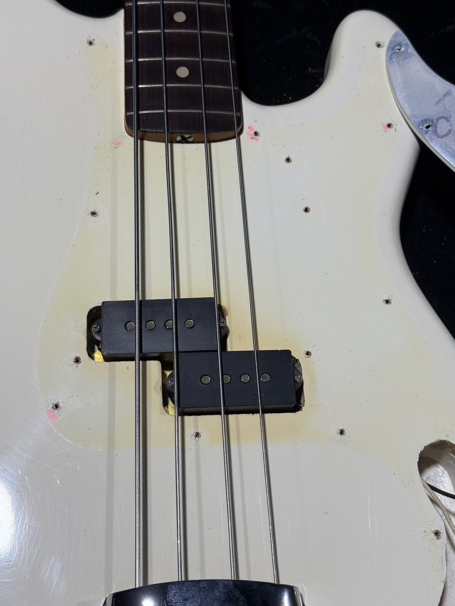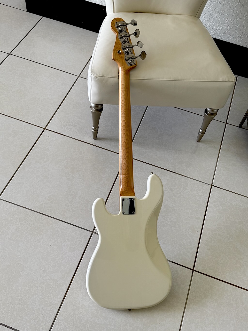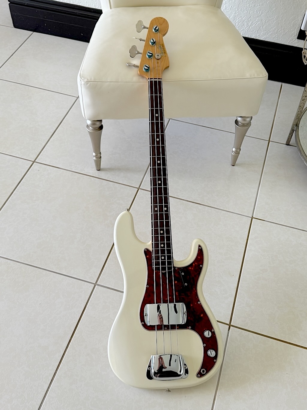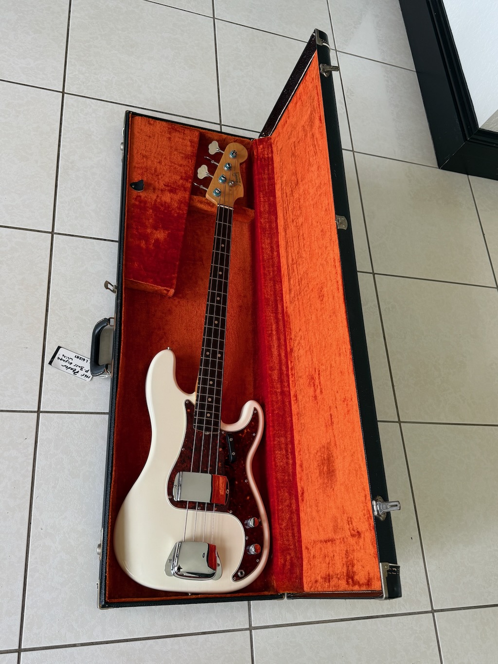Check out this really outragious & extremely collectible 1965 Fender Precision Bass w/all Pre-CBS features that literally is like new from back in 1965. It has an original unfaded Olympic White nitro finish over an alder body, its very colorful 1st of the pearl dot inlaid Brazilian Rosewood fingerboards date stamped January 1965, she has the white-ist maple neck w/some fabulous grain & figuring we’ve seen during these late Leo’s years. Its also has a minty tortoise pickgard. Its split pickup is super smooth. Its pot codes date to the 50th week of 1964. It’s insane to find one from under the bed ever & for a 60 year old original, they do not get any better. What makes this even cooler is that it just came from “Robin Trower’s” Bass player, Mr. Glen Letsch, from his personal collection of the last 15+ years. This bass has never been taken apart from birth ever until now as it’s still sporting its factory original installed blue cloth wrapped Flat Wound Fender Flat strings. It’s truly Mint overall w/only some very faint checking w/almost no aging to its finish. It’s complete w/its original Fender polishing cloth, cord & leather strap all in its minty matching original Black Tolex hard case.