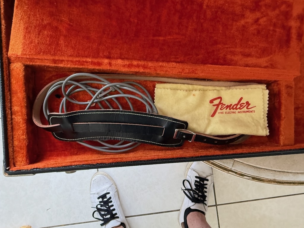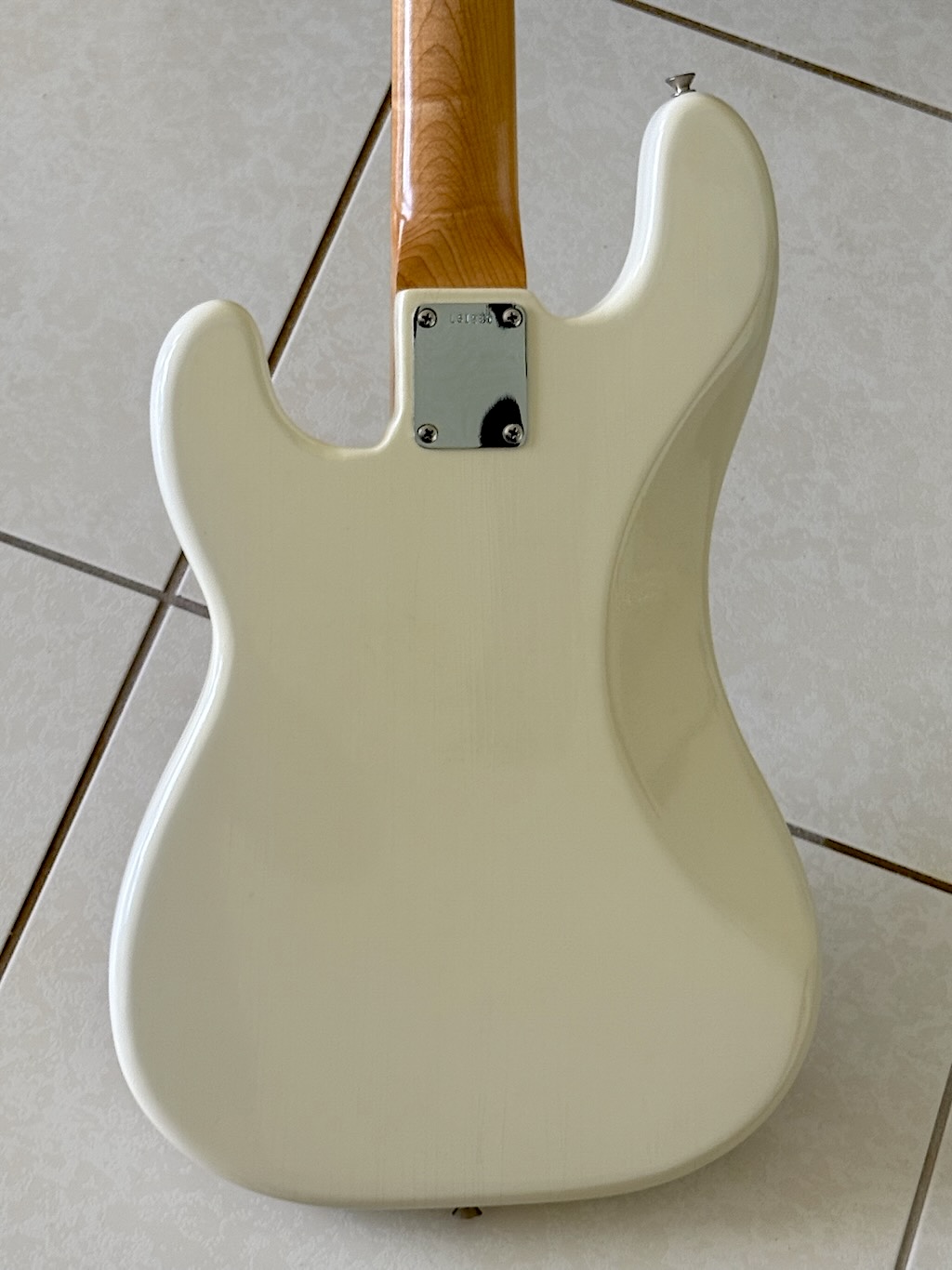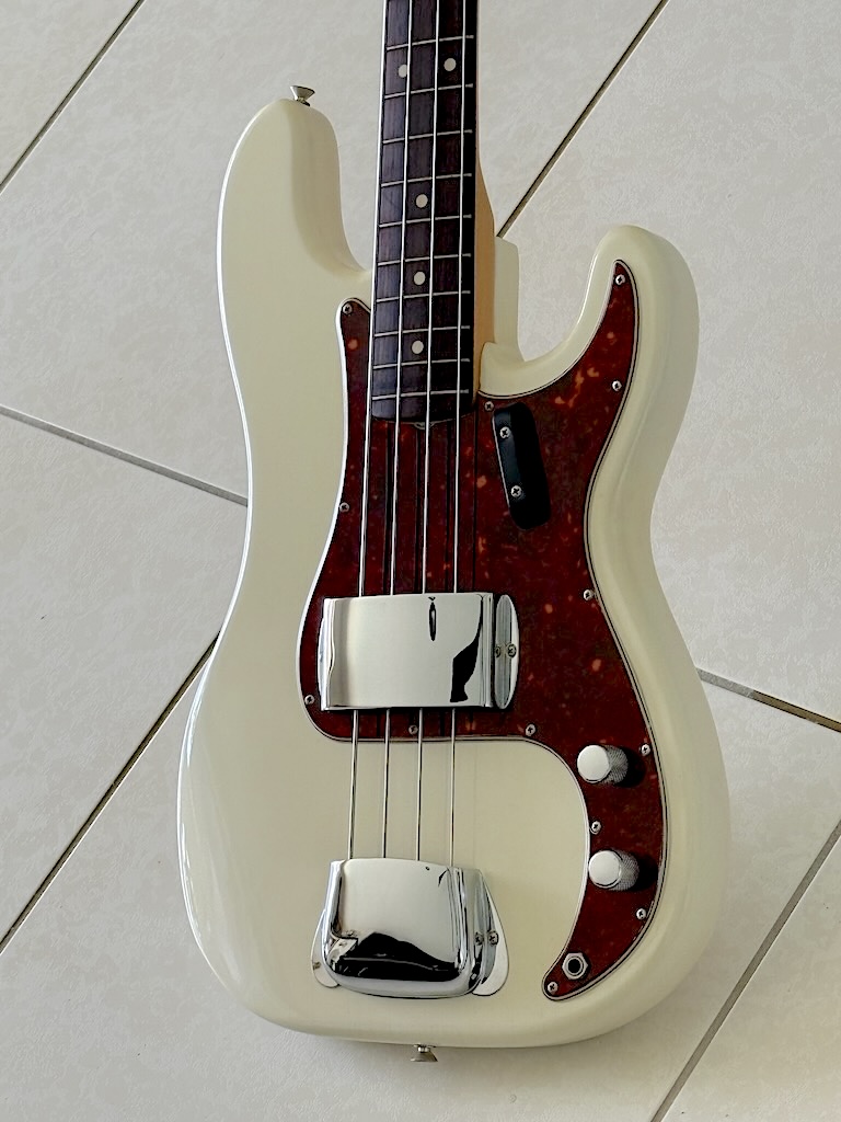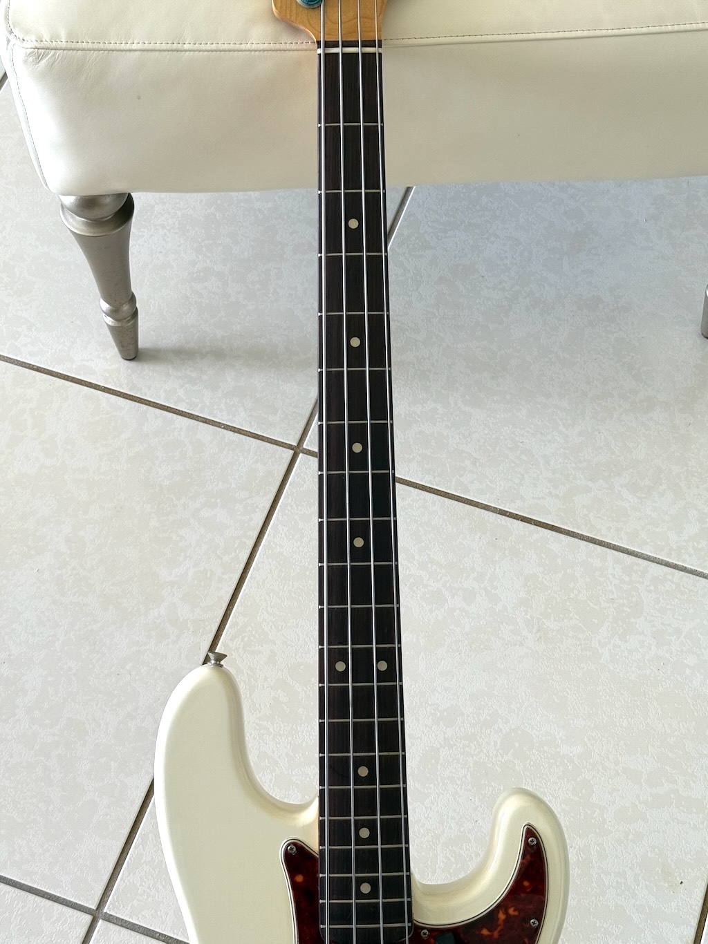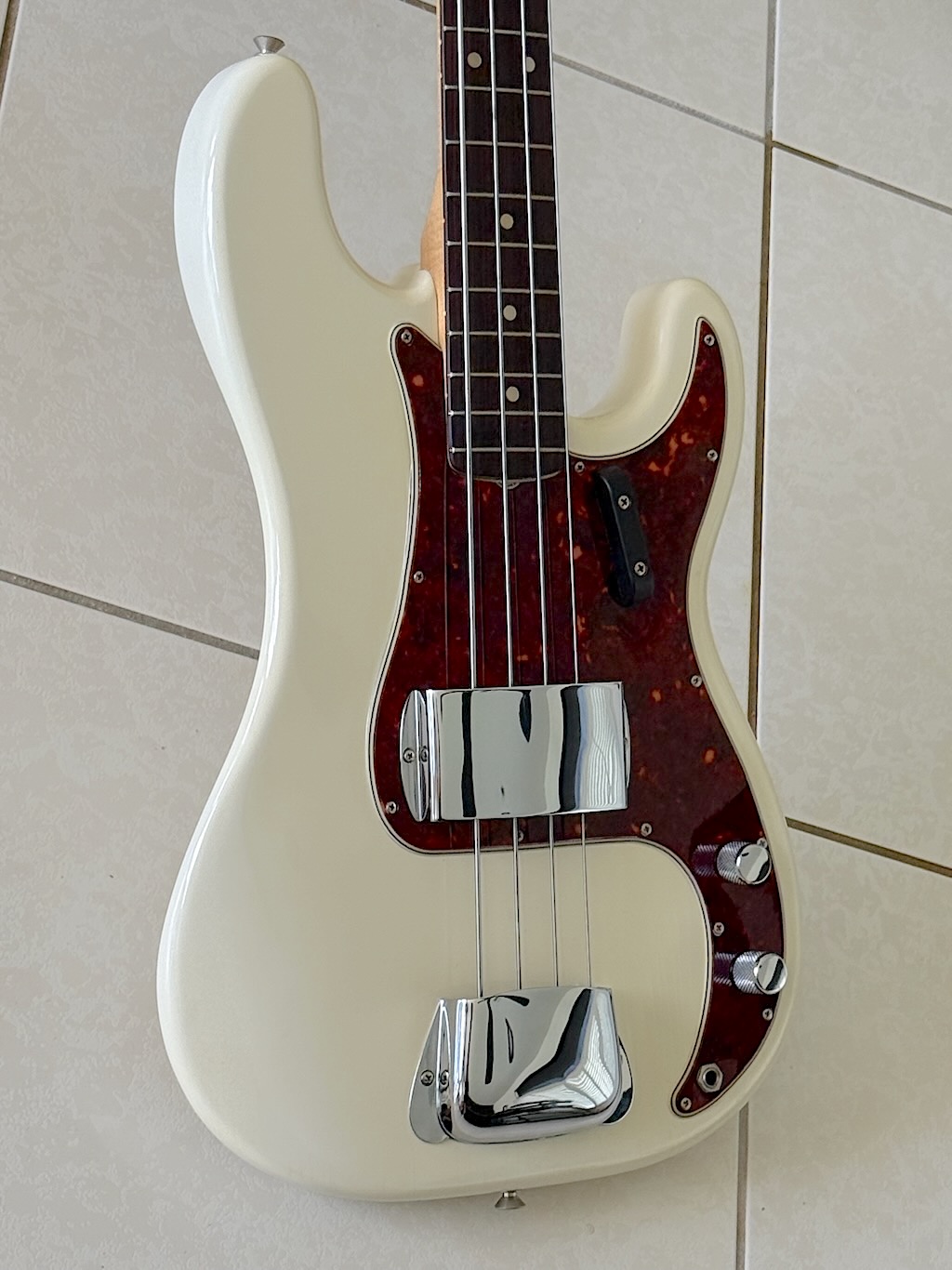 Check out this really outragious & extremely collectible 1965 Fender Precision Bass w/all Pre-CBS features that literally is like new from back in 1965. It has an original unfaded Olympic White nitro finish over an alder body, its very colorful 1st of the pearl dot inlaid Brazilian Rosewood fingerboards date stamped January 1965, she has the white-ist maple neck w/some fabulous grain & figuring we’ve seen during these late Leo’s years. Its also has a minty tortoise pickgard. Its split pickup is super smooth. Its pot codes date to the 50th week of 1964. It’s insane to find one from under the bed ever & for a 60 year old original, they do not get any better. What makes this even cooler is that it just came from “Robin Trower’s” Bass player, Mr. Glen Letsch, from his personal collection of the last 15+ years. This bass has never been taken apart from birth ever until now as it’s still sporting its factory original installed blue cloth wrapped Flat Wound Fender Flat strings. It’s truly Mint overall w/only some very faint checking w/almost no aging to its finish. It’s complete w/its original Fender polishing cloth, cord & leather strap all in its minty matching original Black Tolex hard case.
