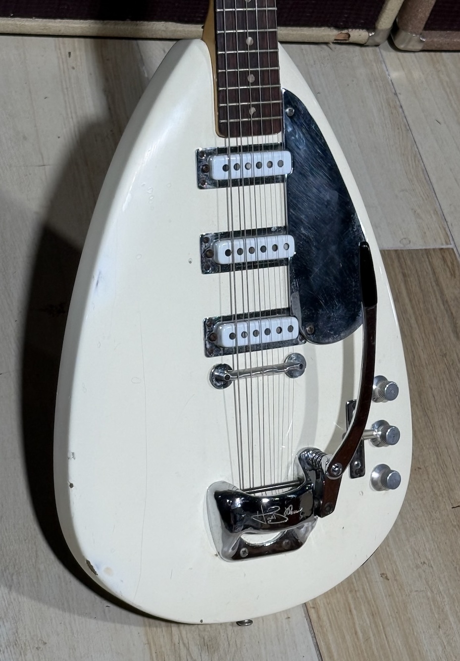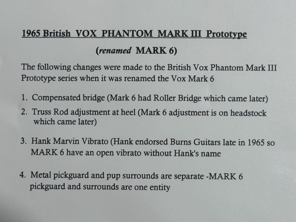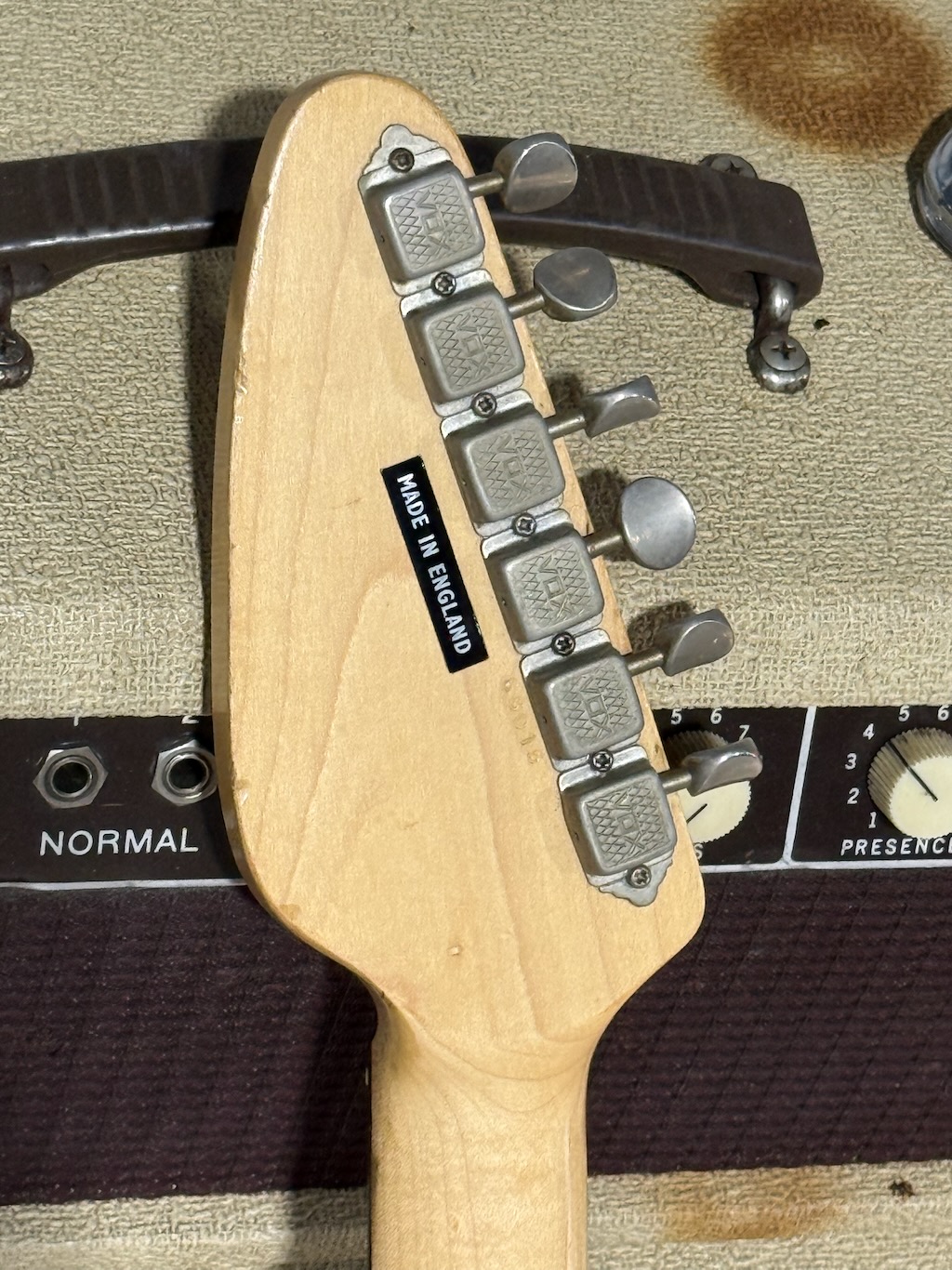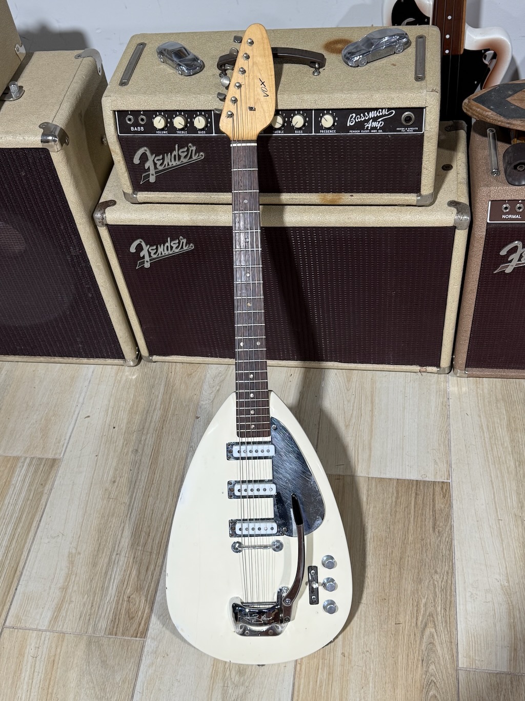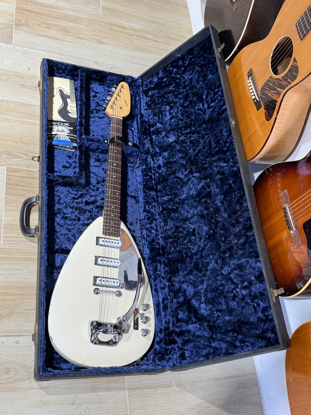 This is a very very rare early production Vox Phantom Mark III “Prototype” made in 1965 in England by Jennings Musical Industries with some Rock & Roll celebrity roots. These UK made early guitars are some of the most desirable vintage guitars from the UK. This Teardrop guitar was made famous by Brian Jones of the Stones who played an infamous White 3 pickup Mark VI similar to this Mark III. Its 1st owner was Denis Payton, the Sax player (also played guitar) in the Dave Clark V Band. It was made unlike any production Mark VI having 3 pickups that have separate bezels, a metal compensated bridge, the truss rod adjusts at the heel of the neck, sporting a Hank Marvin endorsed Vibrato & wearing its signature UK metal pickgard. It’s got the coolest Vox stamped 6-in-tuners tuners w/a serial # stamped just below w/the Vox “Made in England” sticker. It’s just out of a collection that the last owner had since 1978. It’s a once in a lifetime chance to own 1 of the most desirable iconic guitars ever produced. It’s excellent overall & comes with/some case candy in its original square hard case.