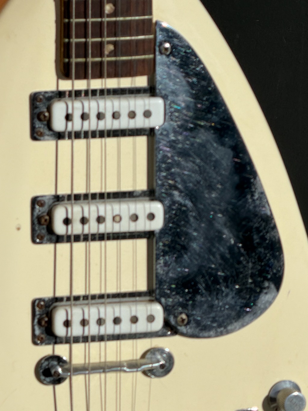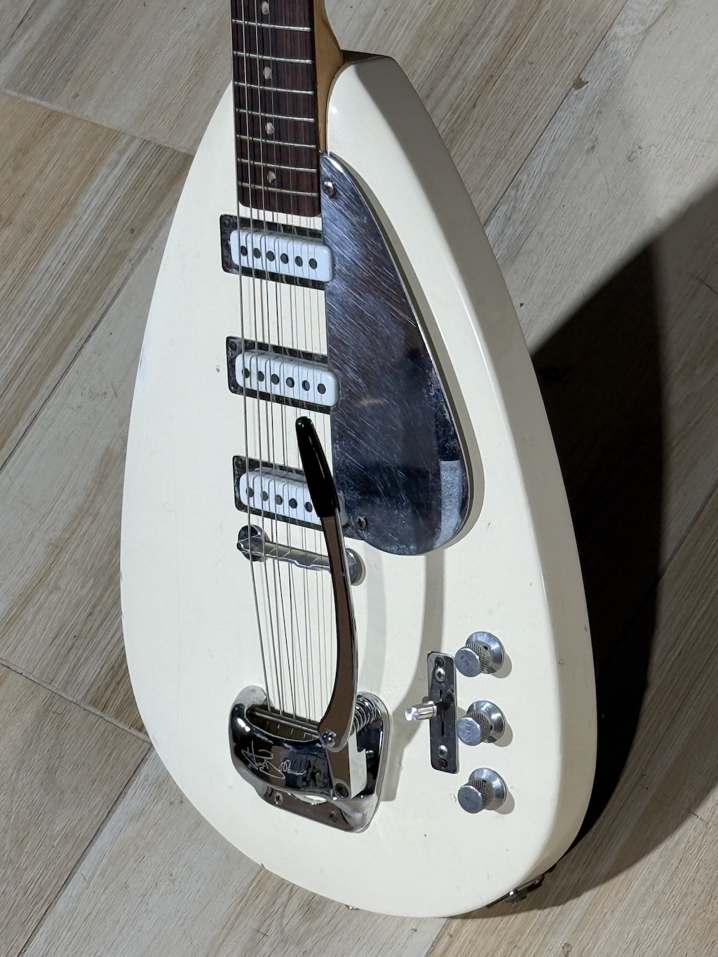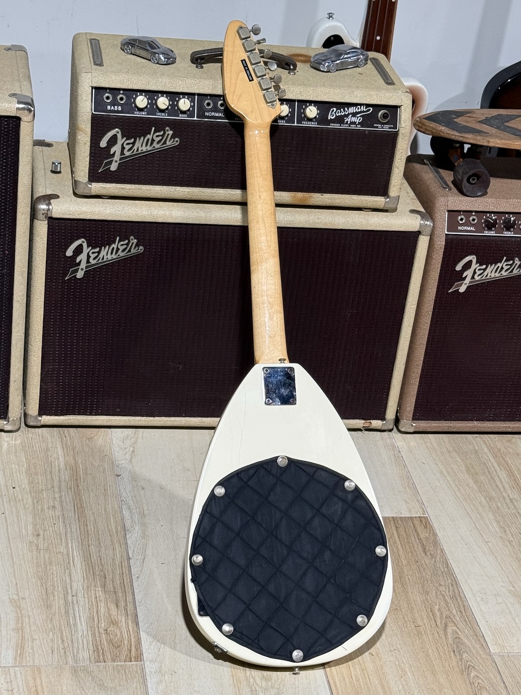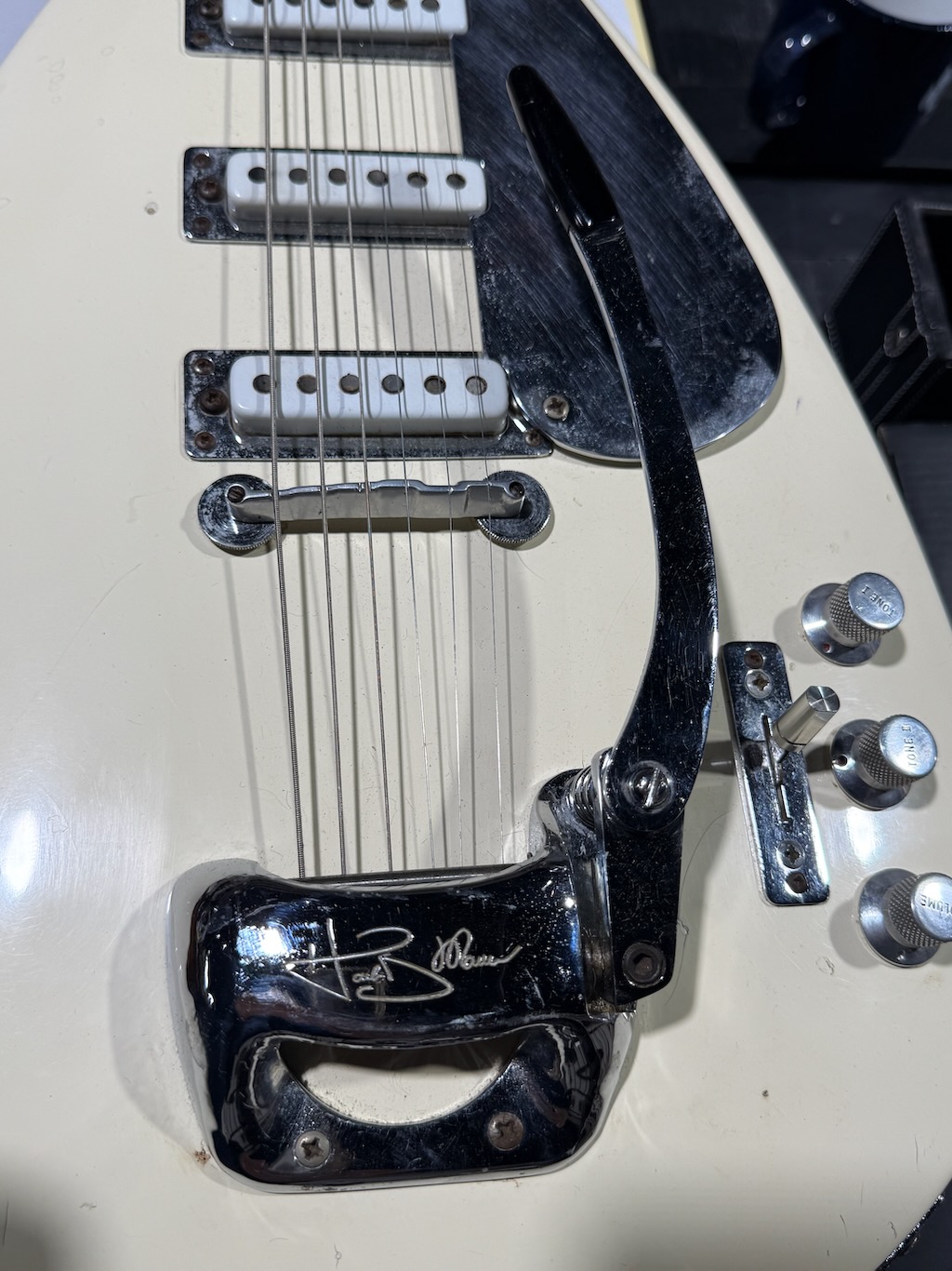 This is a very very rare early production Vox Phantom Mark III “Prototype” made in 1965 in England by Jennings Musical Industries with some Rock & Roll celebrity roots. These UK made early guitars are some of the most desirable vintage guitars from the UK. This Teardrop guitar was made famous by Brian Jones of the Stones who played an infamous White 3 pickup Mark VI similar to this Mark III. Its 1st owner was Denis Payton, the Sax player (also played guitar) in the Dave Clark V Band. It was made unlike any production Mark VI having 3 pickups that have separate bezels, a metal compensated bridge, the truss rod adjusts at the heel of the neck, sporting a Hank Marvin endorsed Vibrato & wearing its signature UK metal pickgard. It’s got the coolest Vox stamped 6-in-tuners tuners w/a serial # stamped just below w/the Vox “Made in England” sticker. It’s just out of a collection that the last owner had since 1978. It’s a once in a lifetime chance to own 1 of the most desirable iconic guitars ever produced. It’s excellent overall & comes with/some case candy in its original square hard case.
