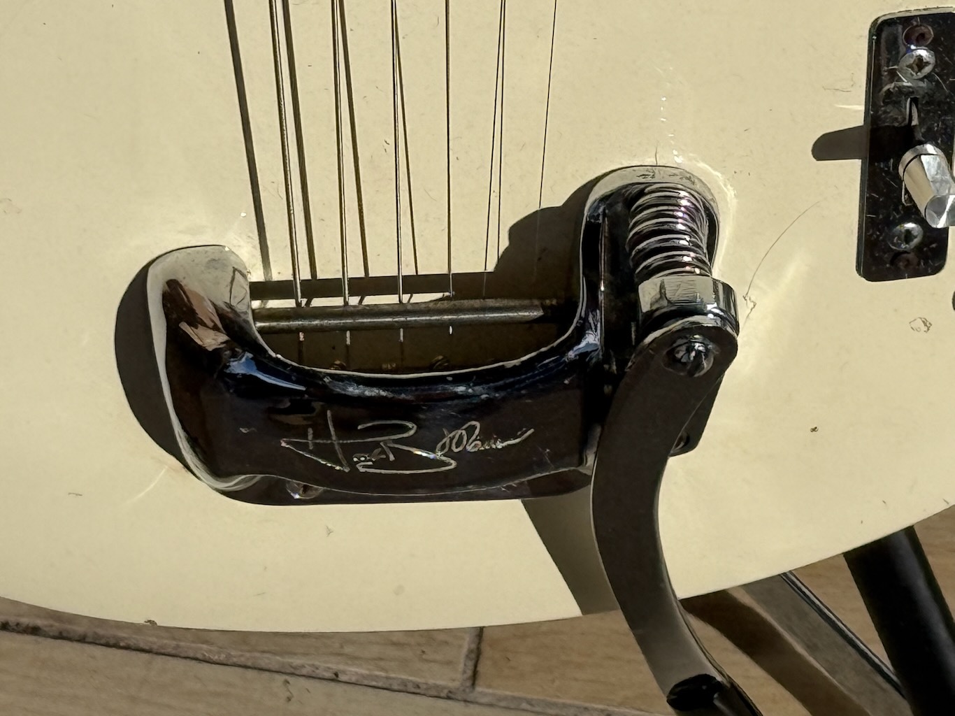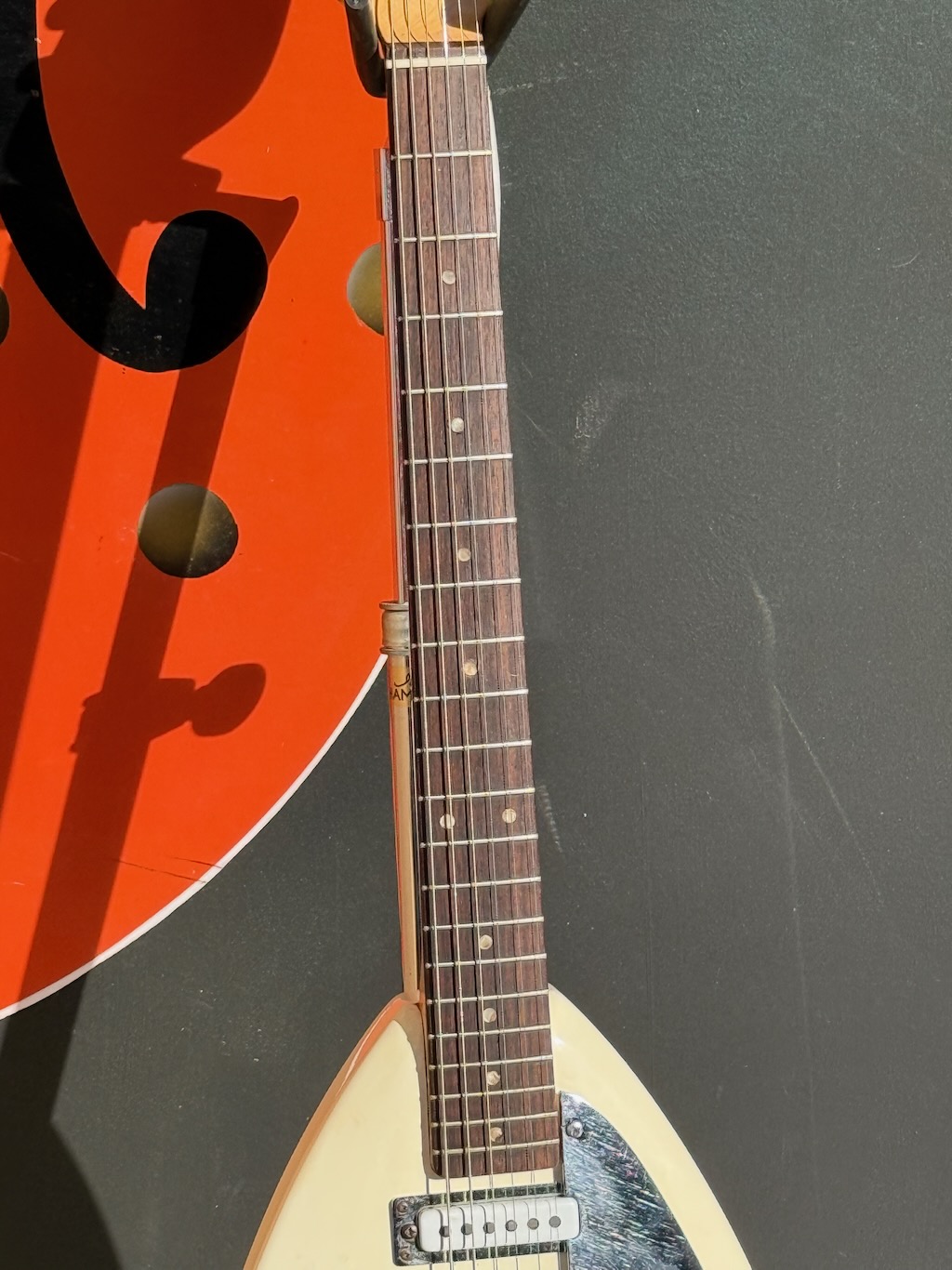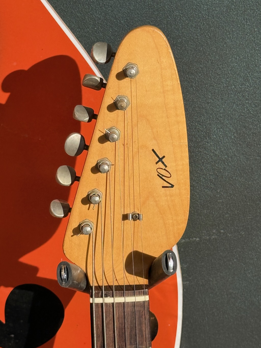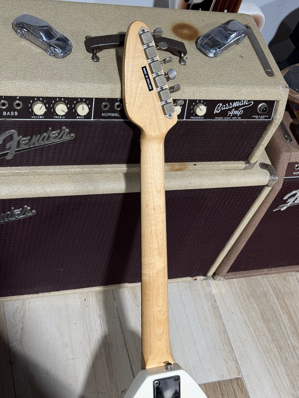 This is a very very rare early production Vox Phantom Mark III “Prototype” made in 1965 in England by Jennings Musical Industries with some Rock & Roll celebrity roots. These UK made early guitars are some of the most desirable vintage guitars from the UK. This Teardrop guitar was made famous by Brian Jones of the Stones who played an infamous White 3 pickup Mark VI similar to this Mark III. Its 1st owner was Denis Payton, the Sax player (also played guitar) in the Dave Clark V Band. It was made unlike any production Mark VI having 3 pickups that have separate bezels, a metal compensated bridge, the truss rod adjusts at the heel of the neck, sporting a Hank Marvin endorsed Vibrato & wearing its signature UK metal pickgard. It’s got the coolest Vox stamped 6-in-tuners tuners w/a serial # stamped just below w/the Vox “Made in England” sticker. It’s just out of a collection that the last owner had since 1978. It’s a once in a lifetime chance to own 1 of the most desirable iconic guitars ever produced. It’s excellent overall & comes with/some case candy in its original square hard case.