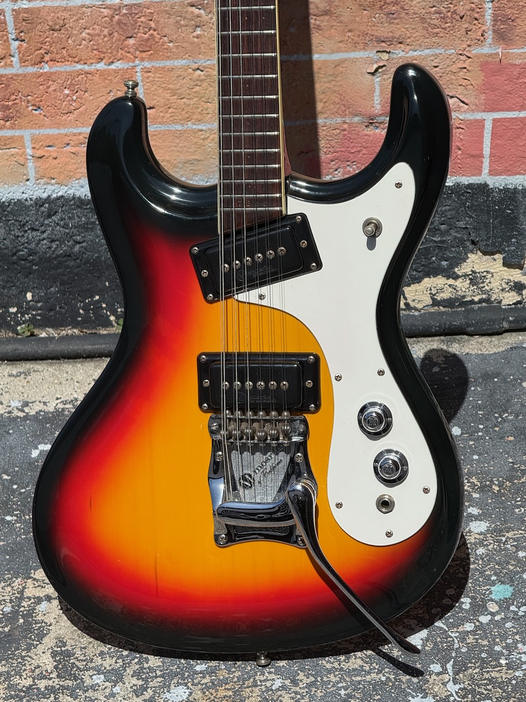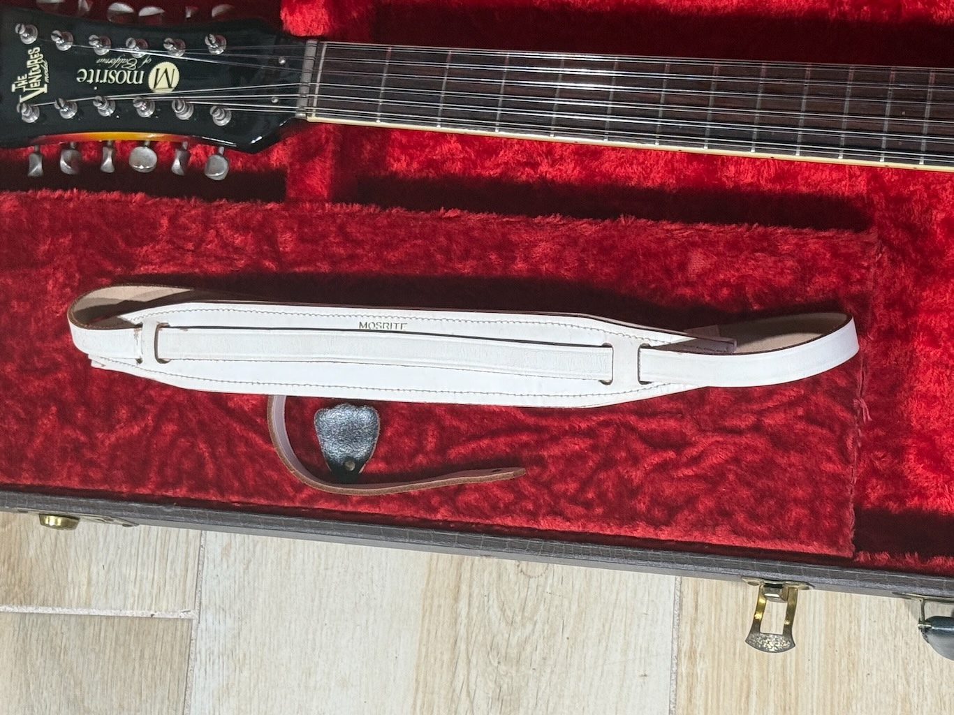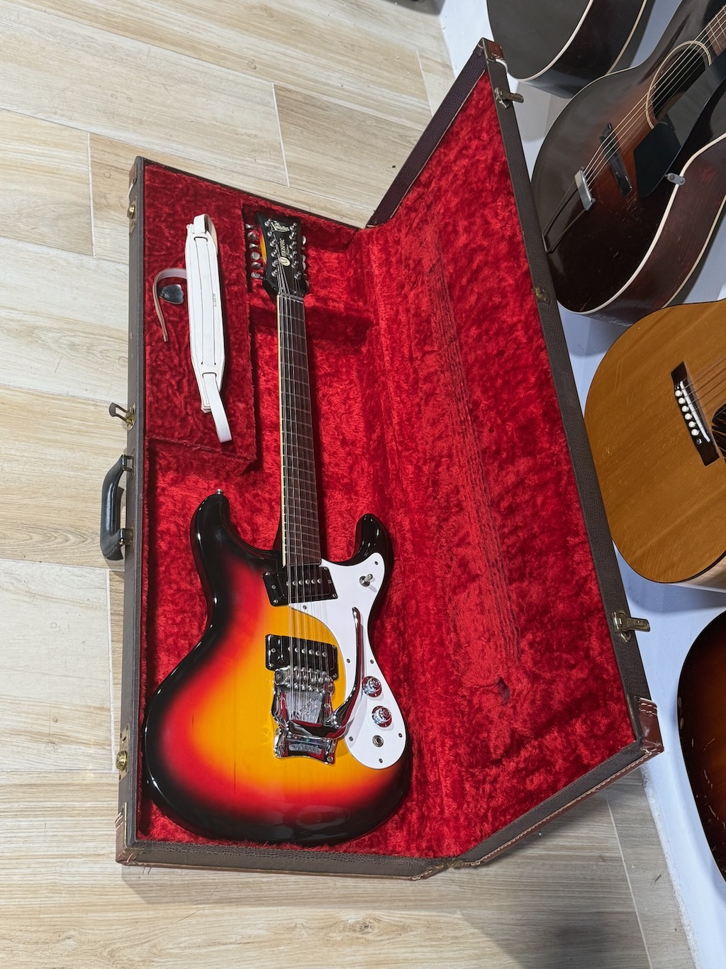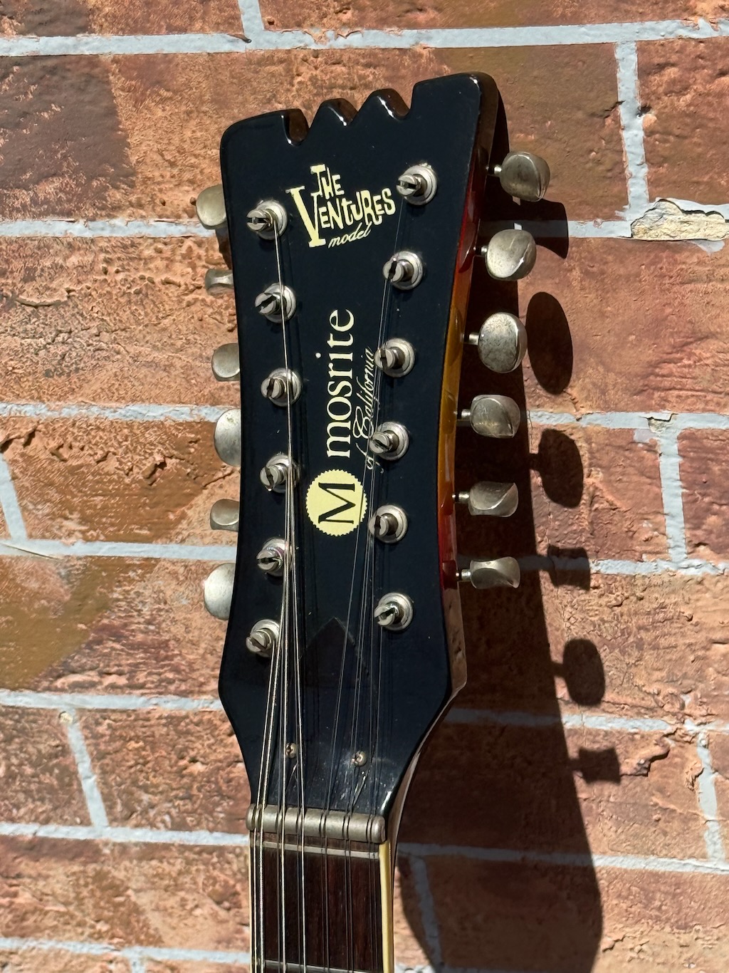This is a like new early production 1966 Mosrite Ventures 12-String Guitar w/all its 1st issue bits by Semie himself. Its Sunburst finish is rich & clean w/no wear at all ever. Its got a matching slim shaped Sunburst finished neck still sporting the Ventures logo, that only the earliest examples used prior to using clear lacquer post-1966. It’s got a pair of 6 pole pickups that sound simply delicious. It’s got the large ‘bursted headstock w/2 sets of 6 in line Kluson tuners. Its original white pickgard fits perfectly & its Moseley Vibrola works nicely. Fantastic warm and powerful tonality on an easy to live with example. She’s truly a MINT beauty, has no fade or play time & is a true time machine. Glen luv’d his. She comes in its nice original brown gator tolex hard case.