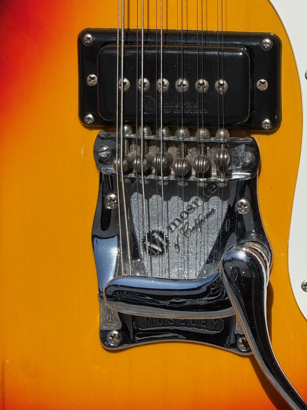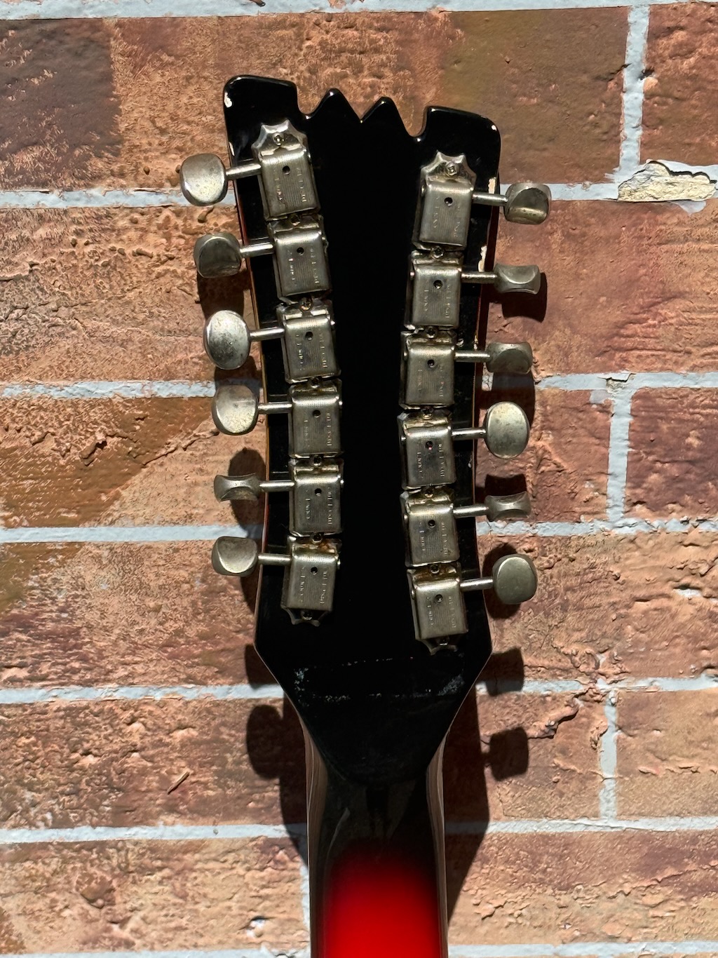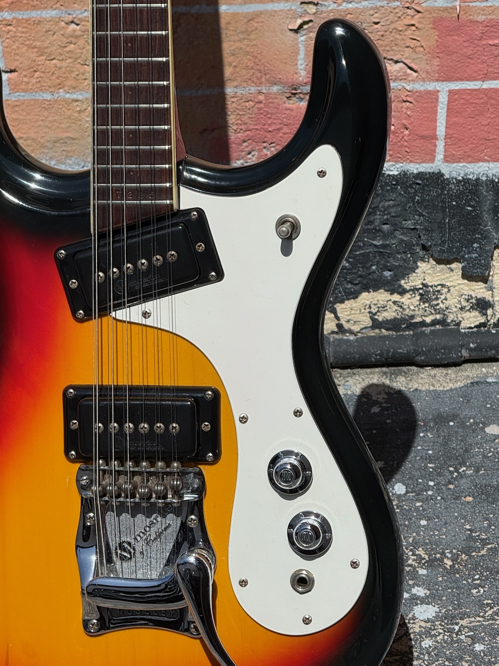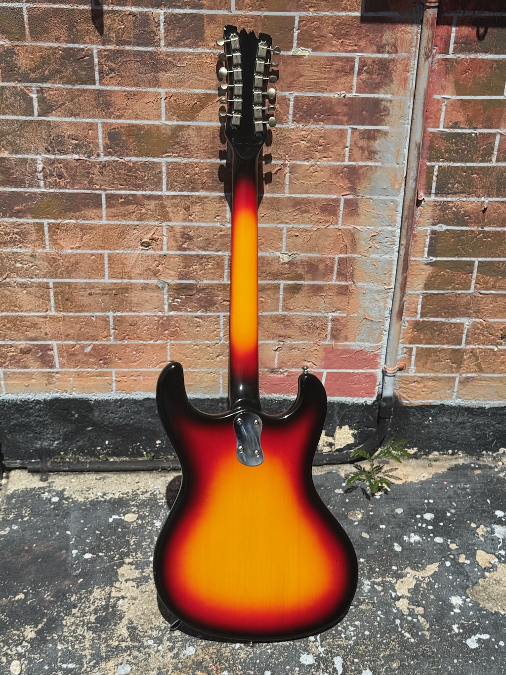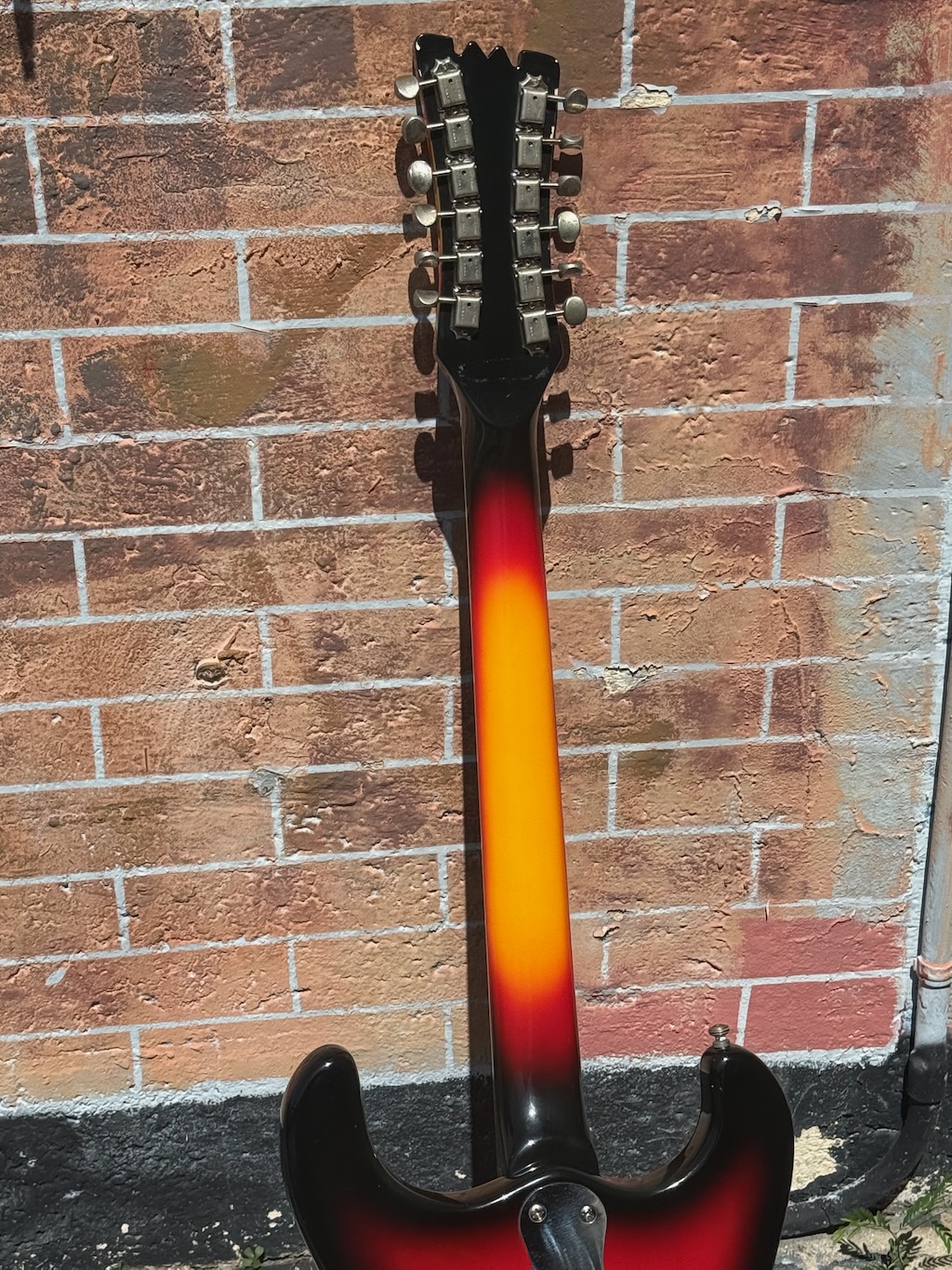 This is a like new early production 1966 Mosrite Ventures 12-String Guitar w/all its 1st issue bits by Semie himself. Its Sunburst finish is rich & clean w/no wear at all ever. Its got a matching slim shaped Sunburst finished neck still sporting the Ventures logo, that only the earliest examples used prior to using clear lacquer post-1966. It’s got a pair of 6 pole pickups that sound simply delicious. It’s got the large ‘bursted headstock w/2 sets of 6 in line Kluson tuners. Its original white pickgard fits perfectly & its Moseley Vibrola works nicely. Fantastic warm and powerful tonality on an easy to live with example. She’s truly a MINT beauty, has no fade or play time & is a true time machine. Glen luv’d his. She comes in its nice original brown gator tolex hard case.