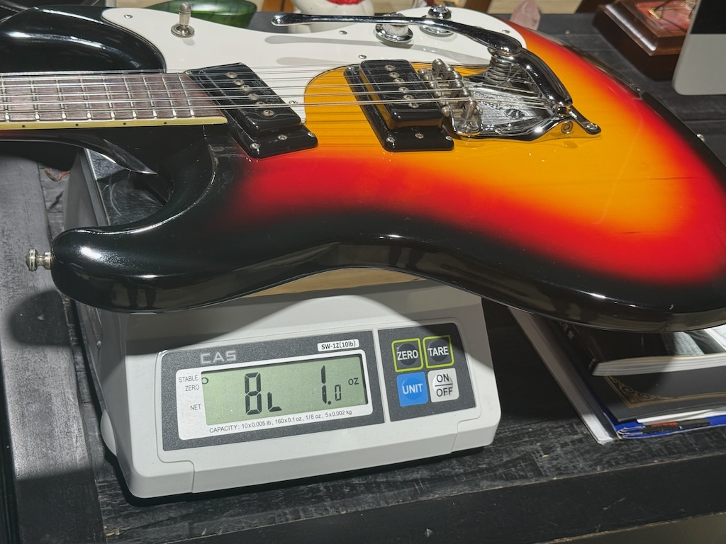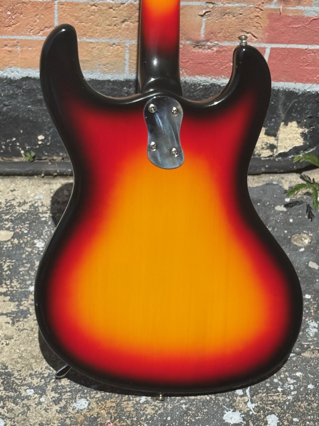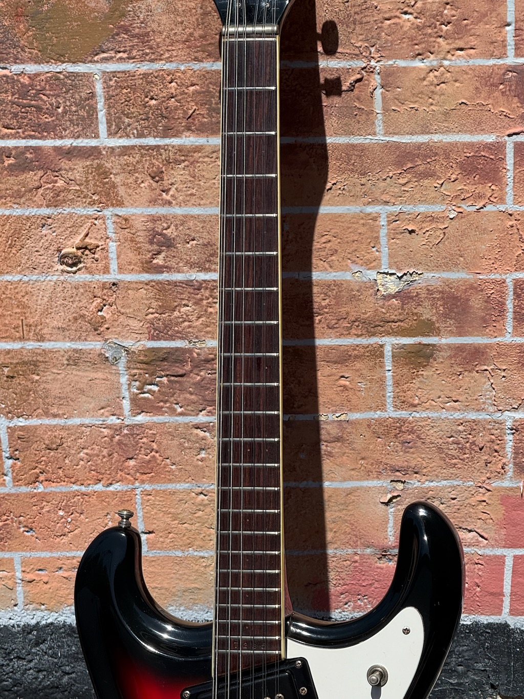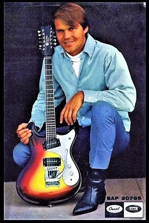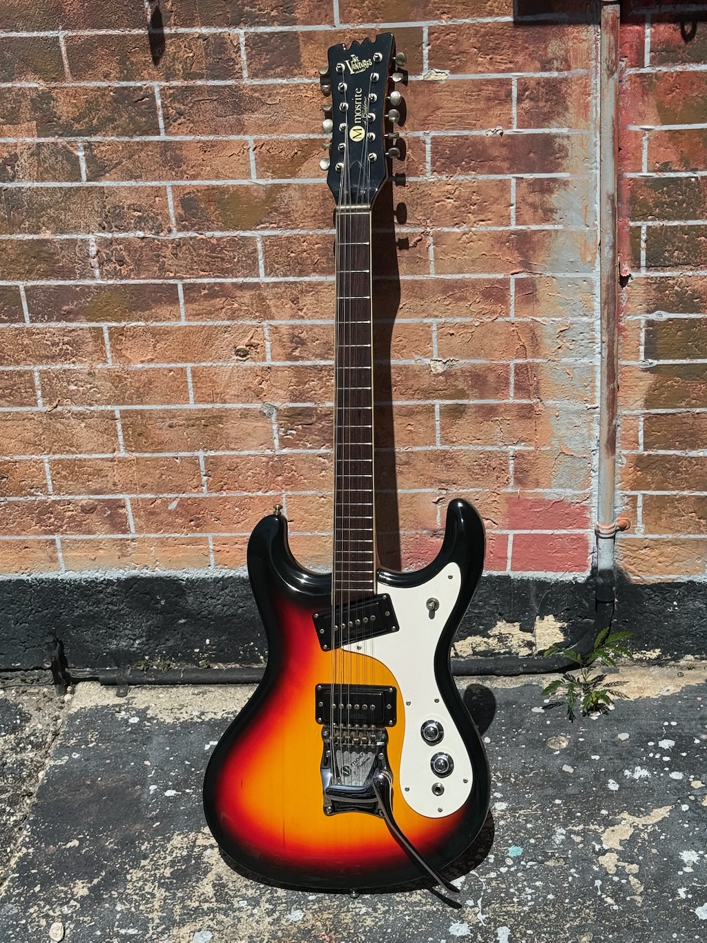 This is a like new early production 1966 Mosrite Ventures 12-String Guitar w/all its 1st issue bits by Semie himself. Its Sunburst finish is rich & clean w/no wear at all ever. Its got a matching slim shaped Sunburst finished neck still sporting the Ventures logo, that only the earliest examples used prior to using clear lacquer post-1966. It’s got a pair of 6 pole pickups that sound simply delicious. It’s got the large ‘bursted headstock w/2 sets of 6 in line Kluson tuners. Its original white pickgard fits perfectly & its Moseley Vibrola works nicely. Fantastic warm and powerful tonality on an easy to live with example. She’s truly a MINT beauty, has no fade or play time & is a true time machine. Glen luv’d his. She comes in its nice original brown gator tolex hard case.
