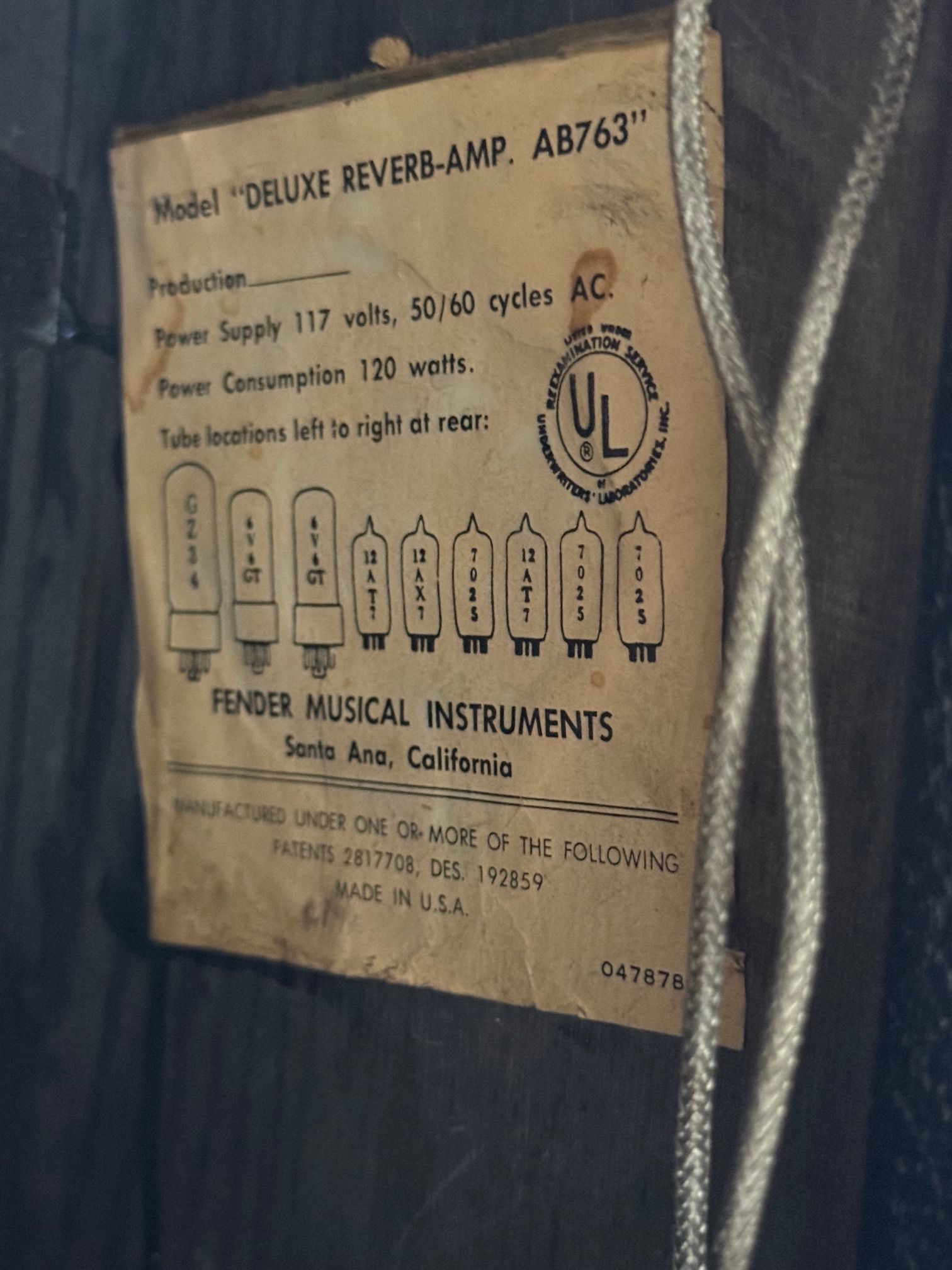 Here we have an all-original 1969 Fender Deluxe Reverb combo. This amp was maintained its entire life and sounds phenomenal with a glassy aura that makes this a true hallmark Fender design. This circuit is a sweet spot in the spectrum of the 1st era Silver panel-era amps w/the cool drip rail frame trim done only in 1968. She’s got a reissue 20w through 1×12″ Jensen from 2004, 2-channels with tremolo and reverb in a sort of manageable enclosure is just about all anyone needs. Its original tube chart is intact. The dynamic, glassy cleans that it generates are truly remarkable and would be a powerful studio or professional performance tool. She has its original transformers, speaker & clean Fender cover included. She’s excellent overall & is ready to use on the next gig.