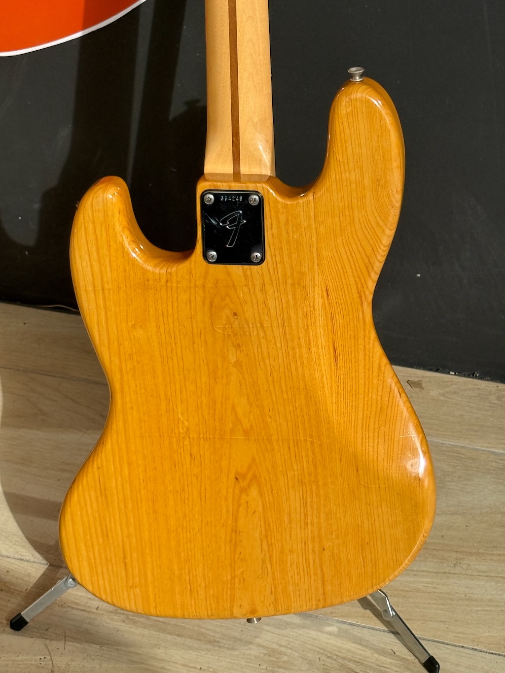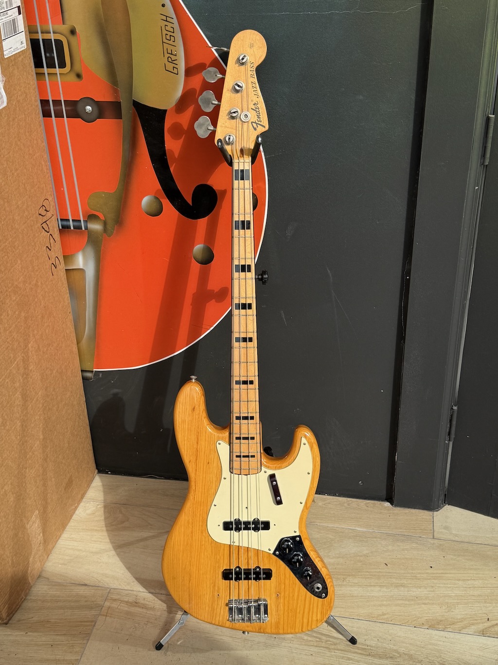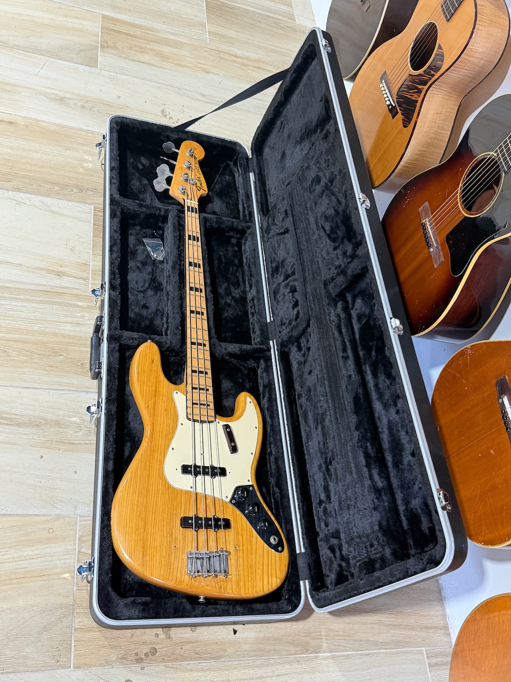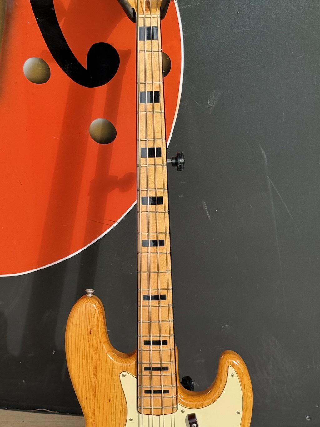 We’ve just acquired this really clean & original 1973 Fender Jazz Bass w/all the right features from its last owner, it has its beautiful original Natural finish over a super grainy lightweight Ash body, its rare Black Bound & Block inlaid 4-bolt Maple neck is super clean w/nice logo & frets, it’s maple neck is clean, unfaded & has pot date codes from the 29th week of 1973, its last of the original White 3 layer’gards that pulls this all together making it one of Fender’s last decades of great Jazzes, its 2 pickups are super smooth w/that quintessential “Jazz Bass” sound !, its so cool & legit from its tuners to its bridge & every single screw from new, it has a gorgeous patina for a 54 year old original, it plays & feels incredible, she’s truly an exceptional example & comes in a newer molded Hard Case.