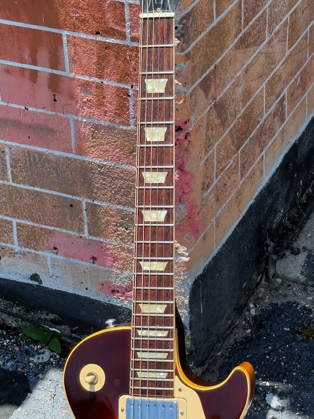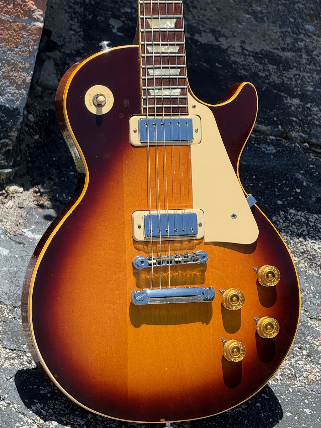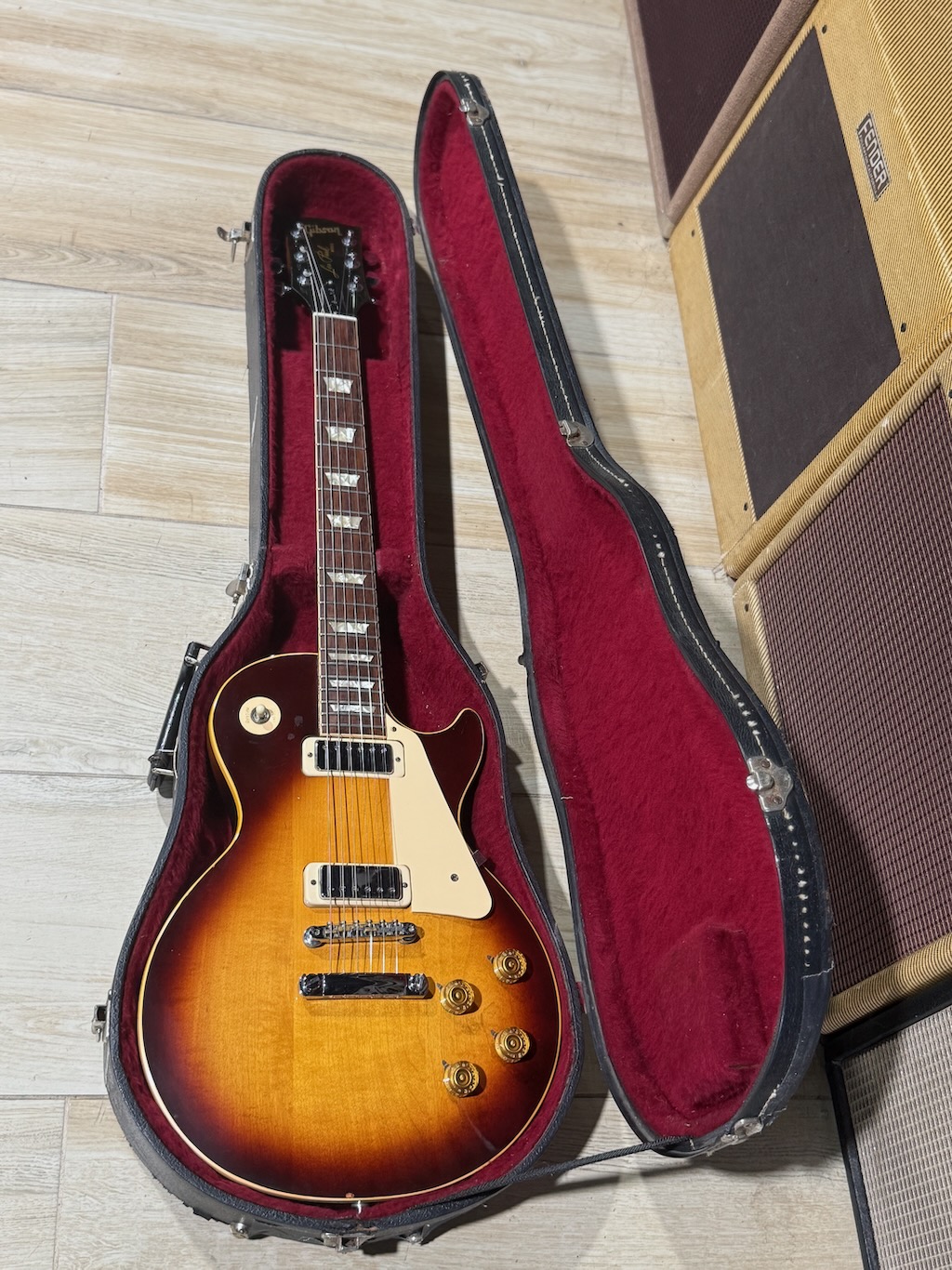This is a very cool all original 1 owner 1973 Gibson Les Paul Deluxe made in this beautiful Tobacco Sunburst finish. It is clean overall & has a powerful set of Mini Humbuckers that kick ass for sure. Its got a nice feeling mahogany neck. Its Kluson tuners replaced w/Schallers. Its tun-a-matic bridge work really well. This is a very cool 52 year old Les Paul owned by Mr. Bob Stange from new. He replaced the inside pots & wiring w/a modern harness & kept its original stuff inside the case pocket. It’s excellent overall & comes in a black tolex/red lined hard case.
