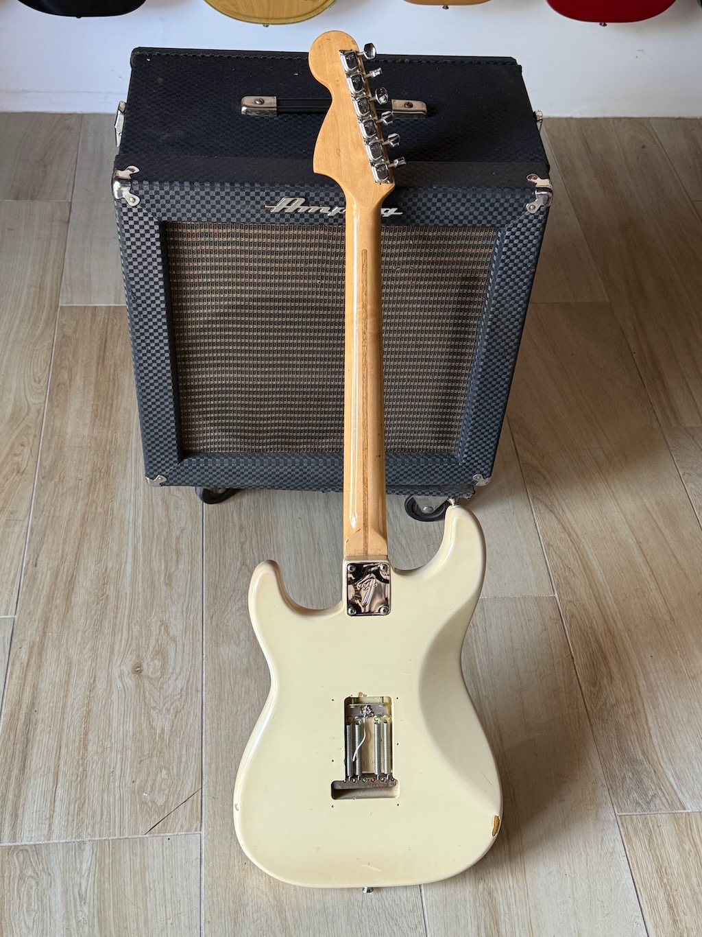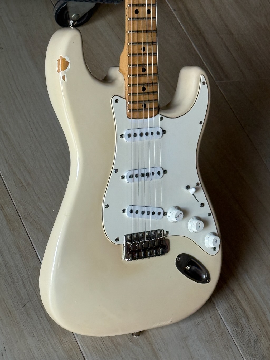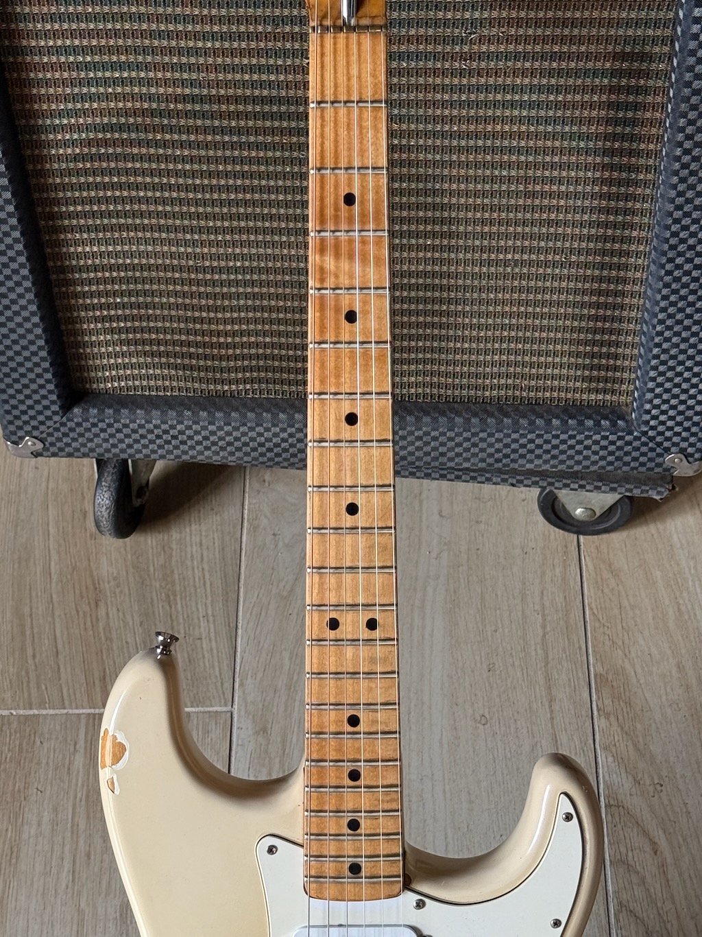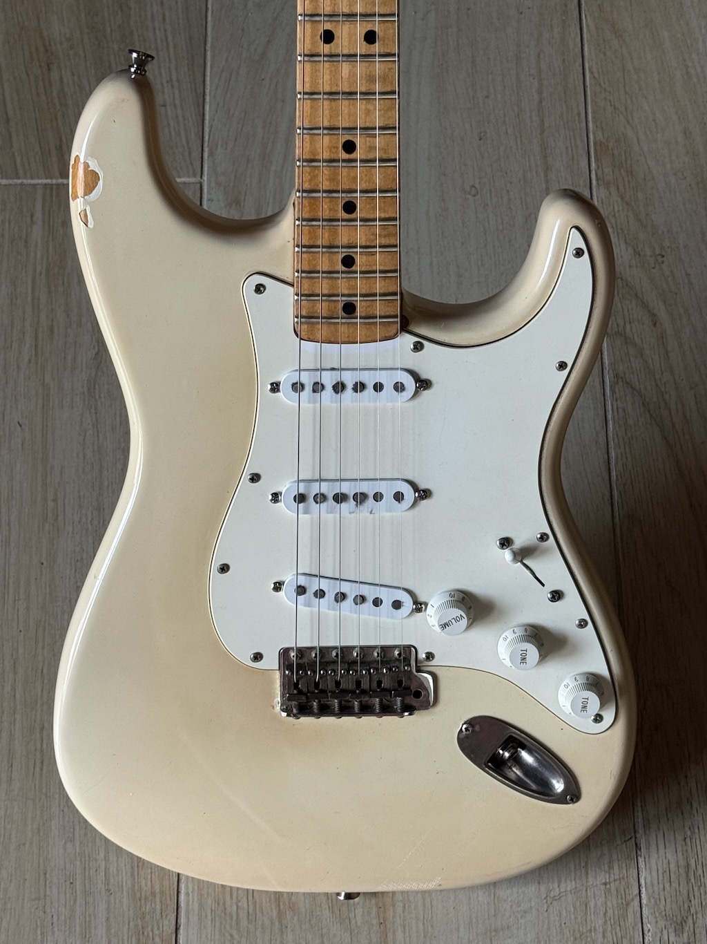 This is a very cool Strat for the player in need of a great sounding axe ! Its Olympic white finished body appears to be from an ’82 Am. Std. Strat & has a cool patina. Its Maple Neck is a 3-bolt type from 1975 w/a brass nut added. Its original white pickgard is loaded w/a set of killer sounding Custom Shop “1969” Strat pickups & new pots. Its original tremolo feels smooth. This has the vibe of Robin Trower or Jimi on a budget. She’s excellent overall & comes in a decent hard case.