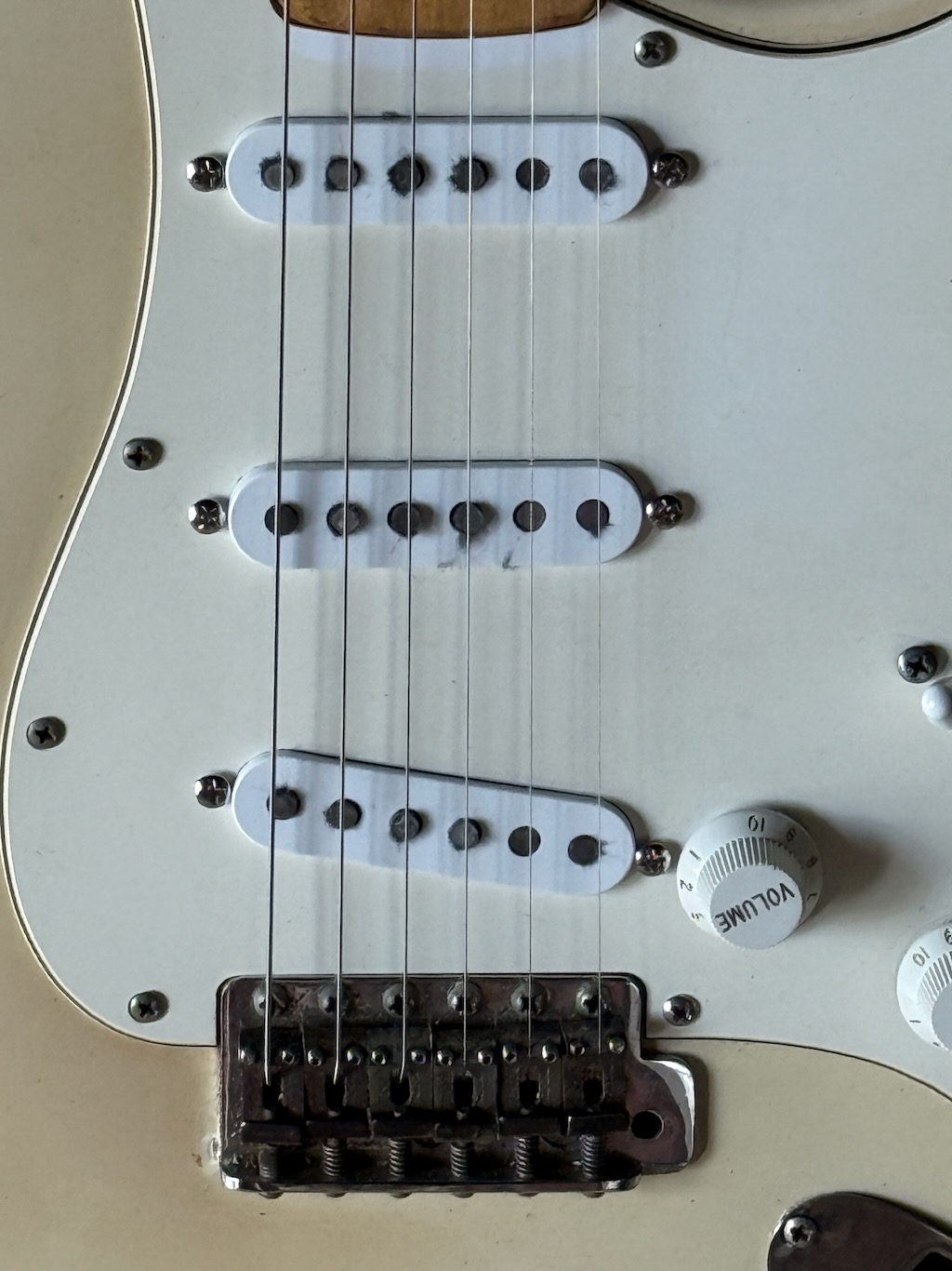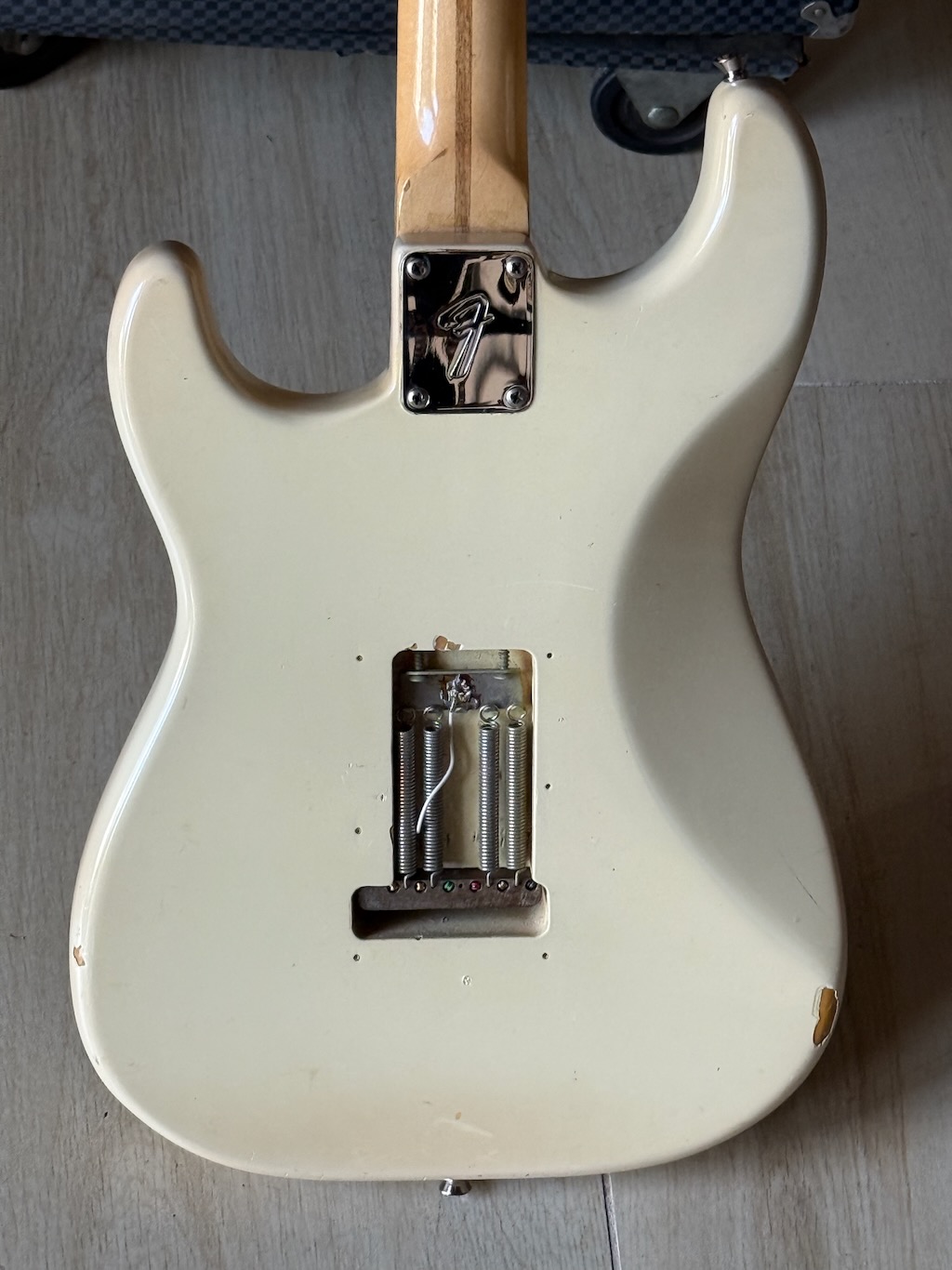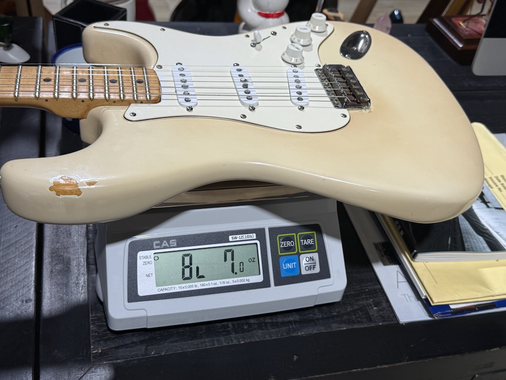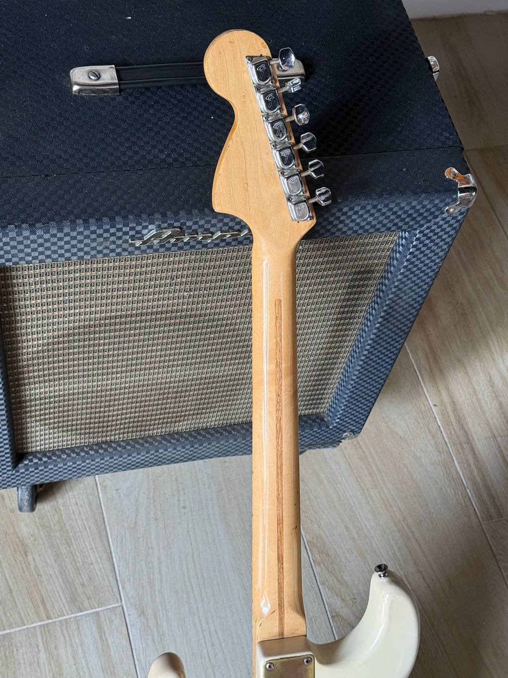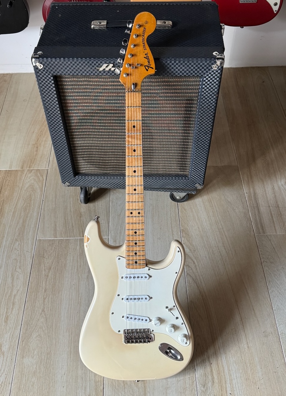 This is a very cool Strat for the player in need of a great sounding axe ! Its Olympic white finished body appears to be from an ’82 Am. Std. Strat & has a cool patina. Its Maple Neck is a 3-bolt type from 1975 w/a brass nut added. Its original white pickgard is loaded w/a set of killer sounding Custom Shop “1969” Strat pickups & new pots. Its original tremolo feels smooth. This has the vibe of Robin Trower or Jimi on a budget. She’s excellent overall & comes in a decent hard case.