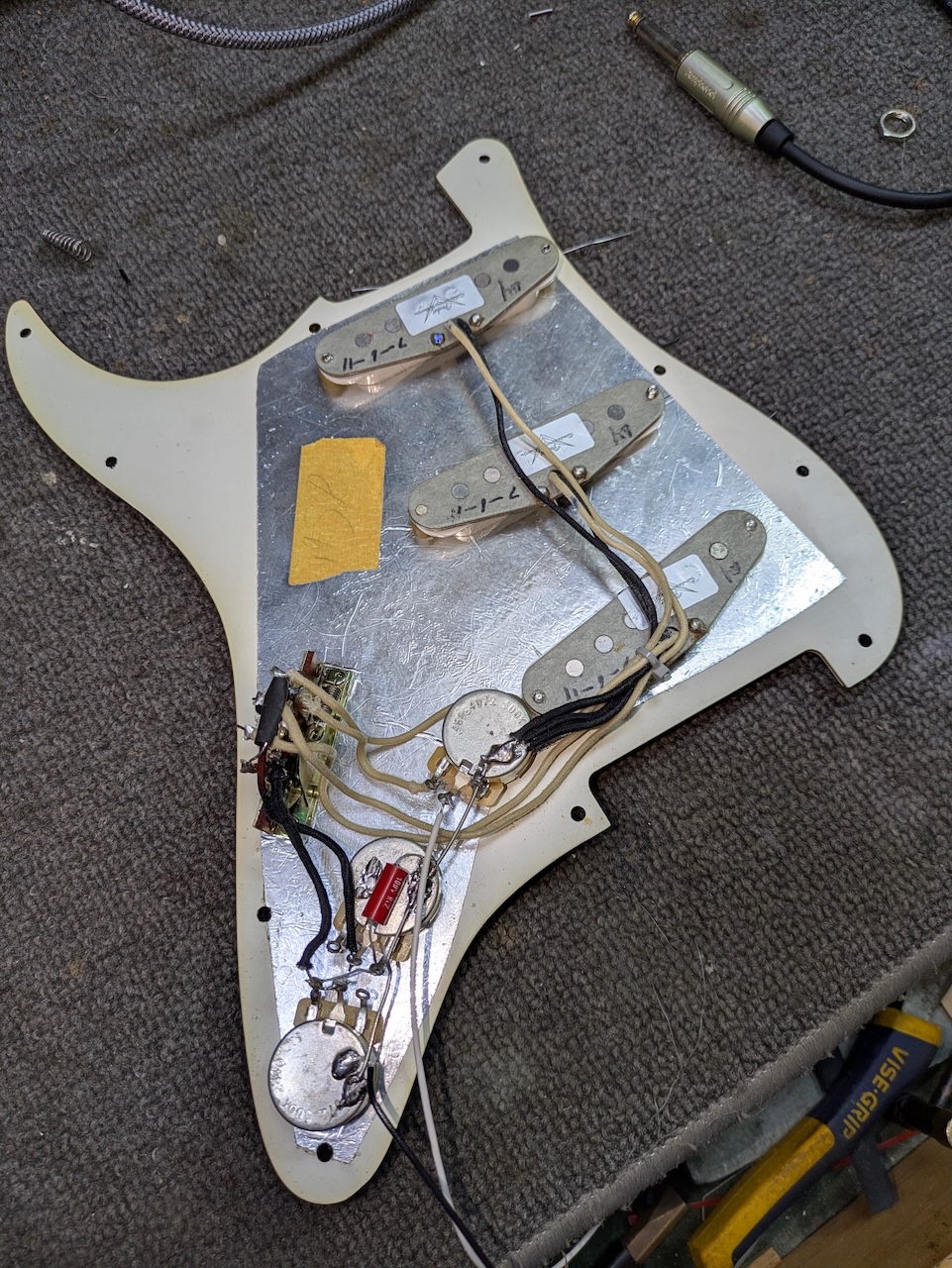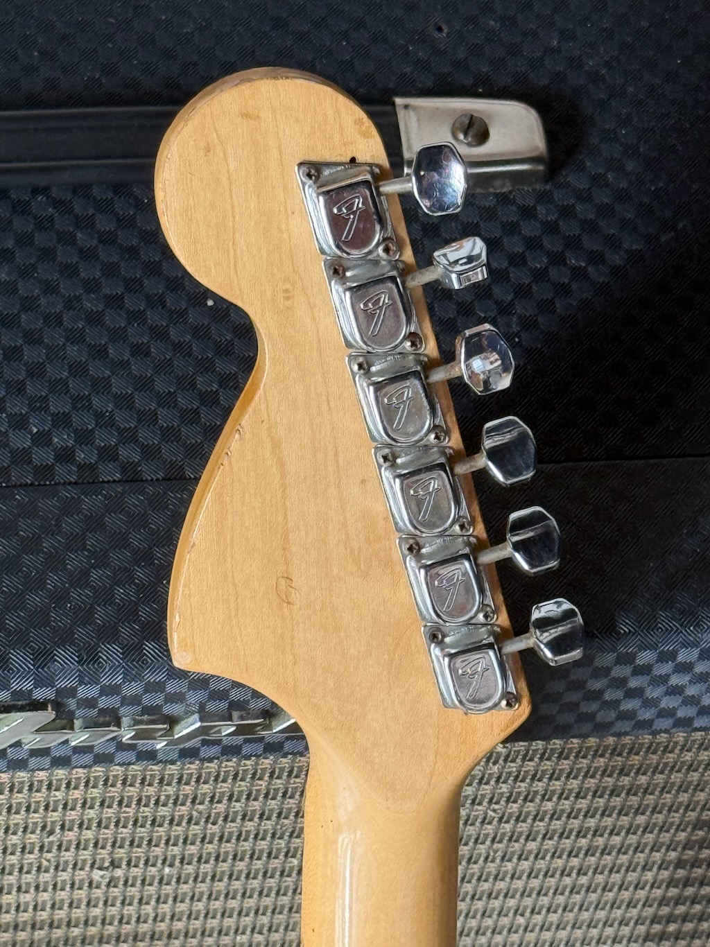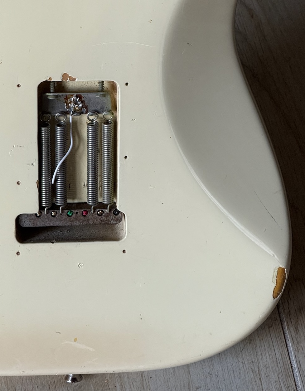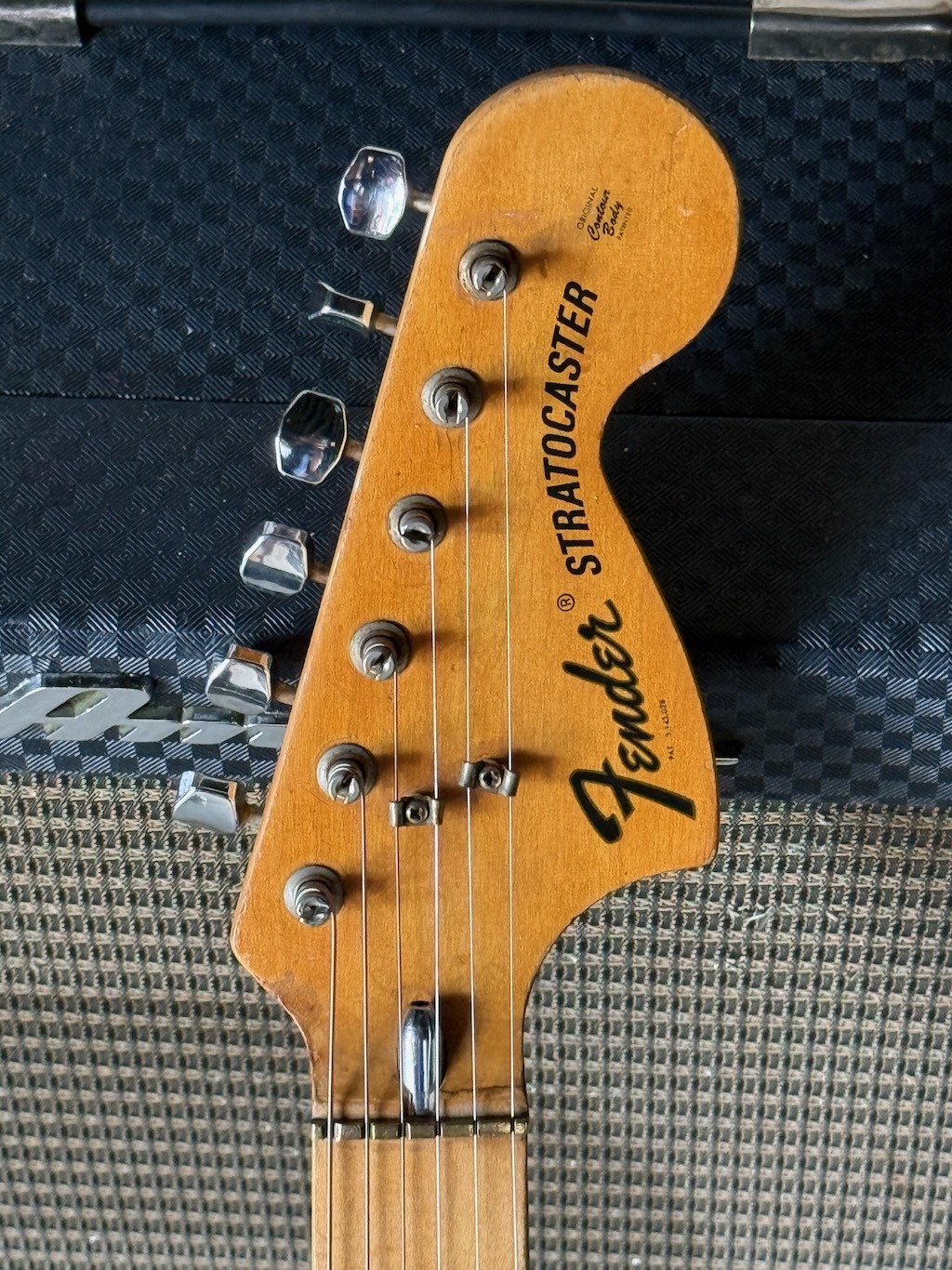 This is a very cool Strat for the player in need of a great sounding axe ! Its Olympic white finished body appears to be from an ’82 Am. Std. Strat & has a cool patina. Its Maple Neck is a 3-bolt type from 1975 w/a brass nut added. Its original white pickgard is loaded w/a set of killer sounding Custom Shop “1969” Strat pickups & new pots. Its original tremolo feels smooth. This has the vibe of Robin Trower or Jimi on a budget. She’s excellent overall & comes in a decent hard case.