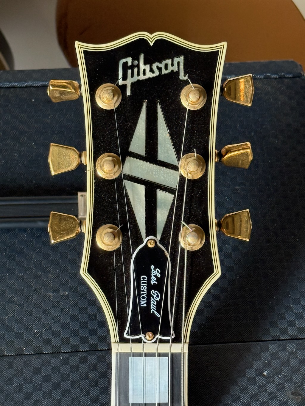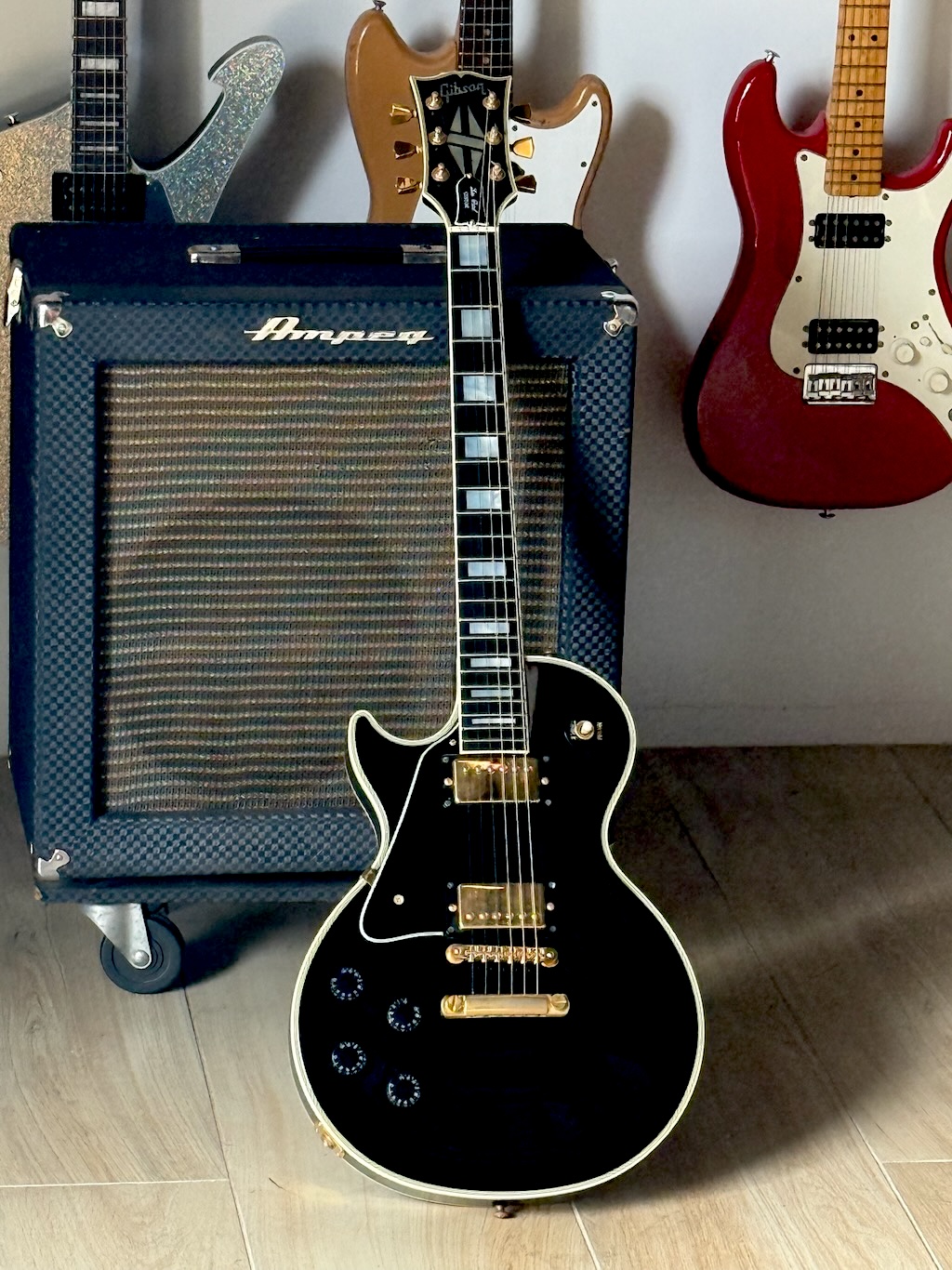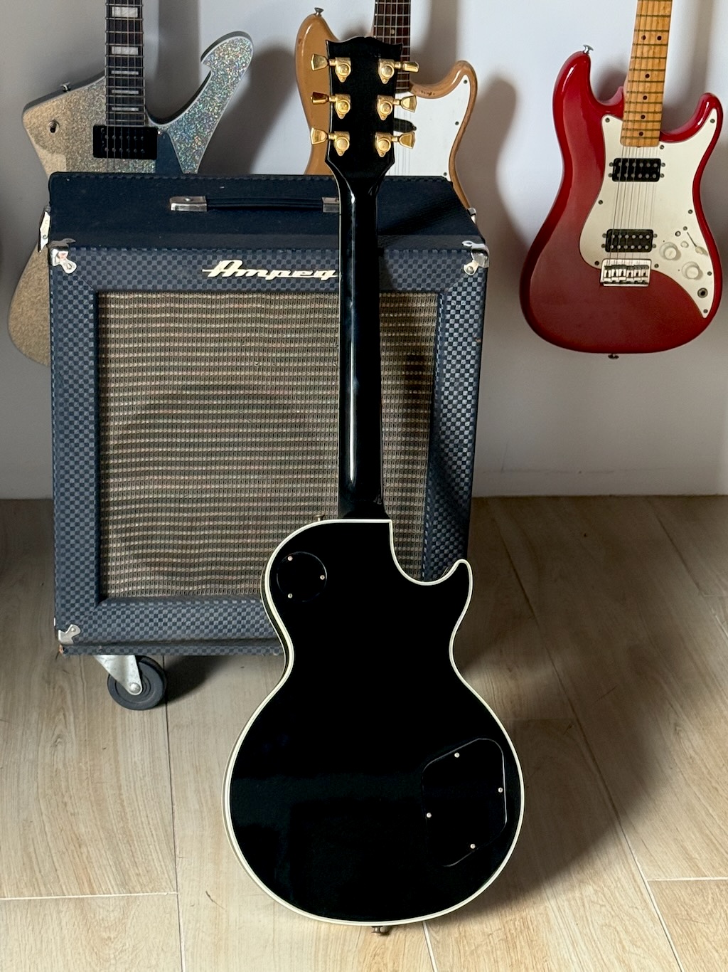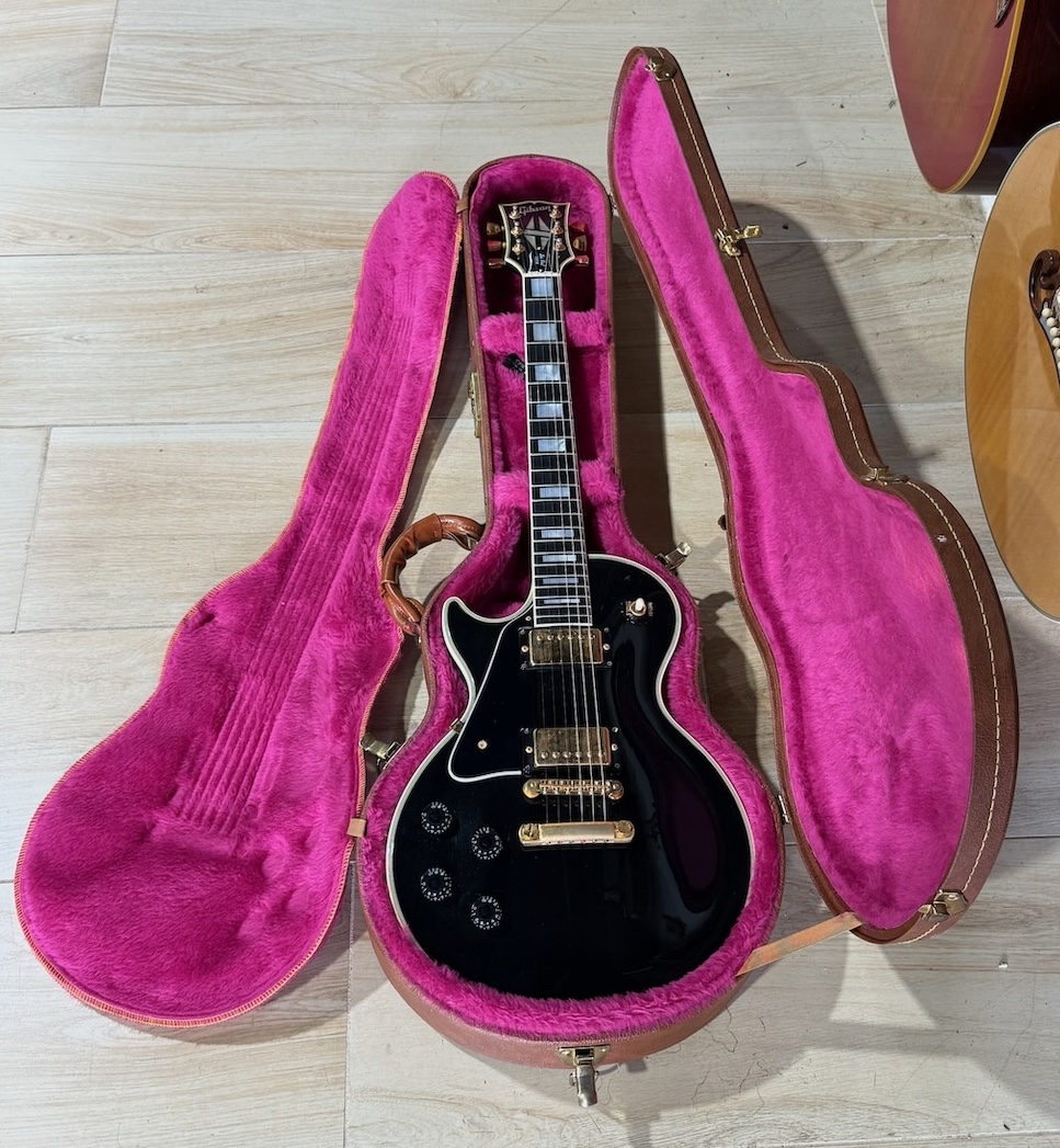 This is a very cool 1989 Gibson Les Paul Custom a factory Left Handed guitar that’s immaculate. Its black finish all over looks devilish. Its block inlaid ebony fingerboard has perfect original frets & nice Gold hardware all over. Loaded w/factory installed Humbucking pickups w/its Pot Codes dating to 1989. It’s got almost no wear all over & still remains amazingly beautiful. Overall she’s exceptional overall & comes in its original brown tolex/pink lined hard case.