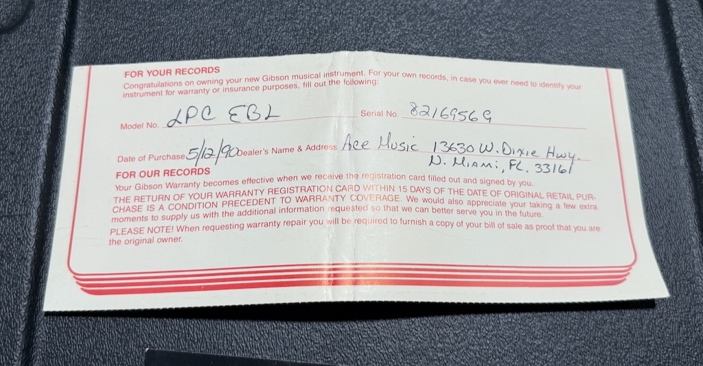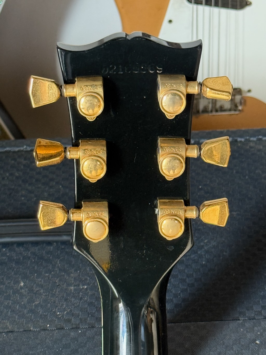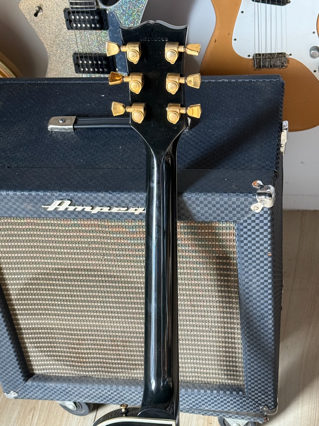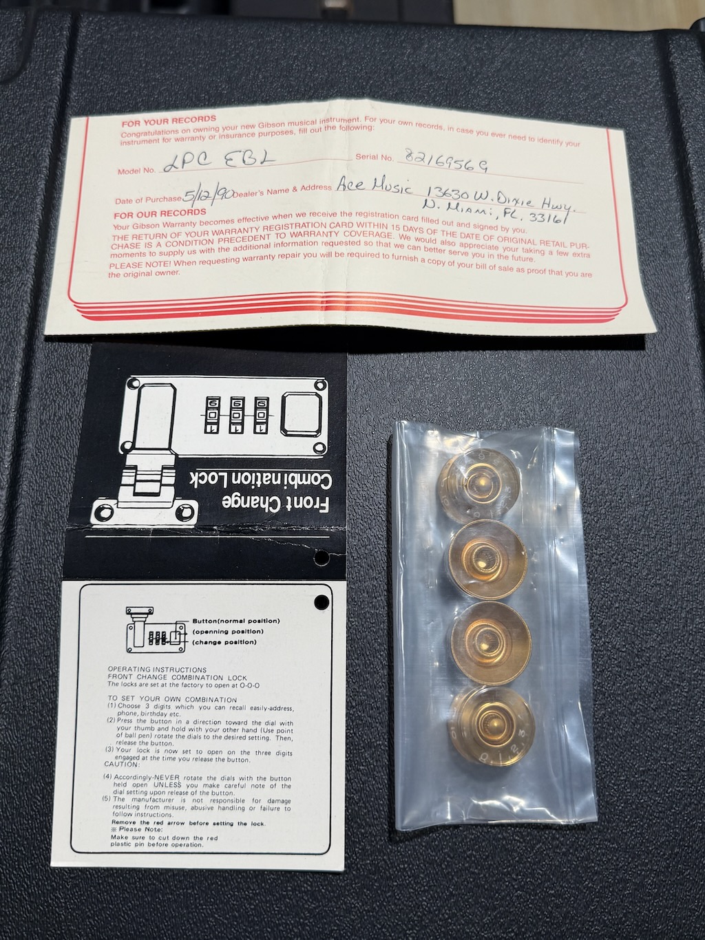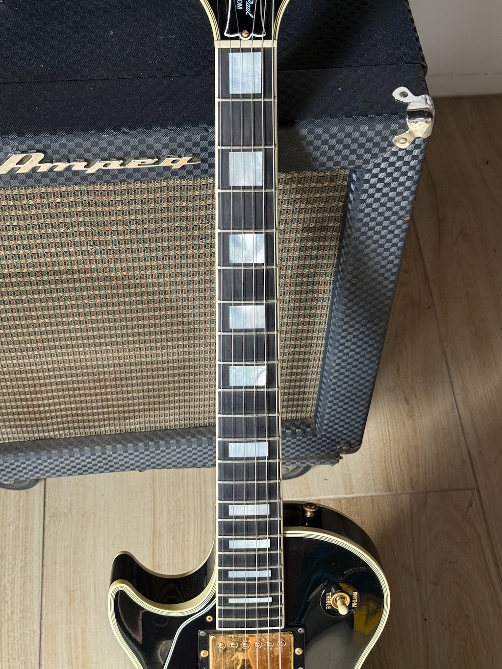 This is a very cool 1989 Gibson Les Paul Custom a factory Left Handed guitar that’s immaculate. Its black finish all over looks devilish. Its block inlaid ebony fingerboard has perfect original frets & nice Gold hardware all over. Loaded w/factory installed Humbucking pickups w/its Pot Codes dating to 1989. It’s got almost no wear all over & still remains amazingly beautiful. Overall she’s exceptional overall & comes in its original brown tolex/pink lined hard case.