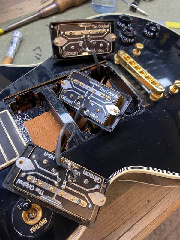 This is a wonderful & maybe 1 of the most desirable late-80’s Gibson Les Paul Custom w/its now extremely rare 3 pickup configuration a la Peter Frampton. These were produced in 3-4 colors maybe 50 of each. Its original Alpine White finish is stunning w/hardly any play time at all. Its mahogany neck feels great. Its white bound & block inlaid Ebony fingerboard is perfectly playable w/clean Gold hardware all over. Loaded w/a set of original Pat.# Humbucking pickups along w/Pot Codes dating 1989. It’s 100% original & still near mint overall w/no real yellowing from new. The cleanest example we’ve seen in years. She’s truly near mint & comes all in its original brown tolex/pink lined hard case.
