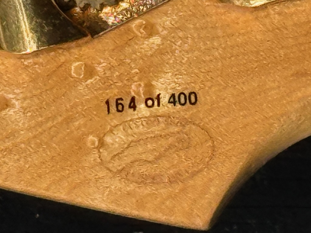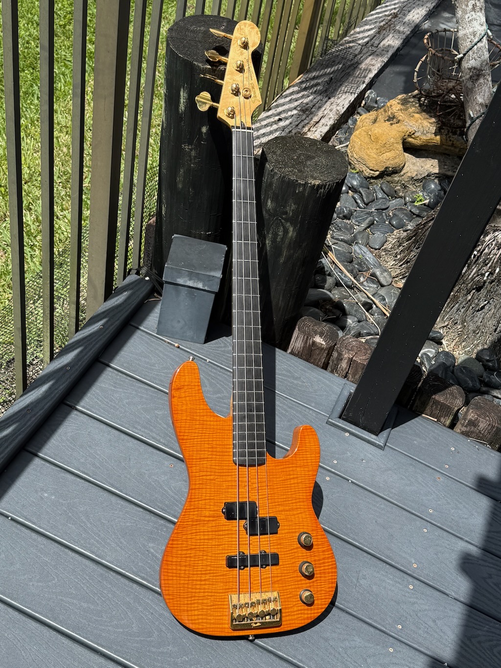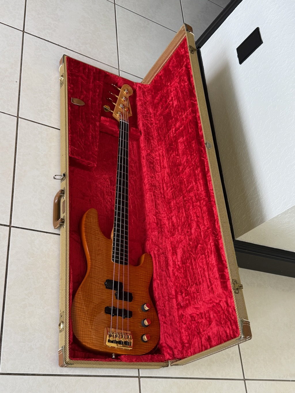 This is a very rare Limited Run Fender Custom Shop 40th Anniversary Precision Bass #164 of 400. It’s got a wonderful see-thru Amber finish over 1 of the best Flamey Maple Tops we’ve ever encountered over a very figured Ash bodies. Its Maple neck has very figured Birdseye Maple w/a Smith era small headstock. This bass is excellent and sounds wonderful. It features a pair of Active Fender P-J Lace Sensor pickups w/3 Stacked Concentric knobs. Its all gold parts finish her off nicely. Its bridge still sports its fine tune adjustment screws. The COA is dated January 1992. It’s Exceptional all around & truly near mint with very minimal evidence of being played. It also has copies of an original owners manual showing what each pot is capable of doing. It’s complete w/its original Tweed Case.
