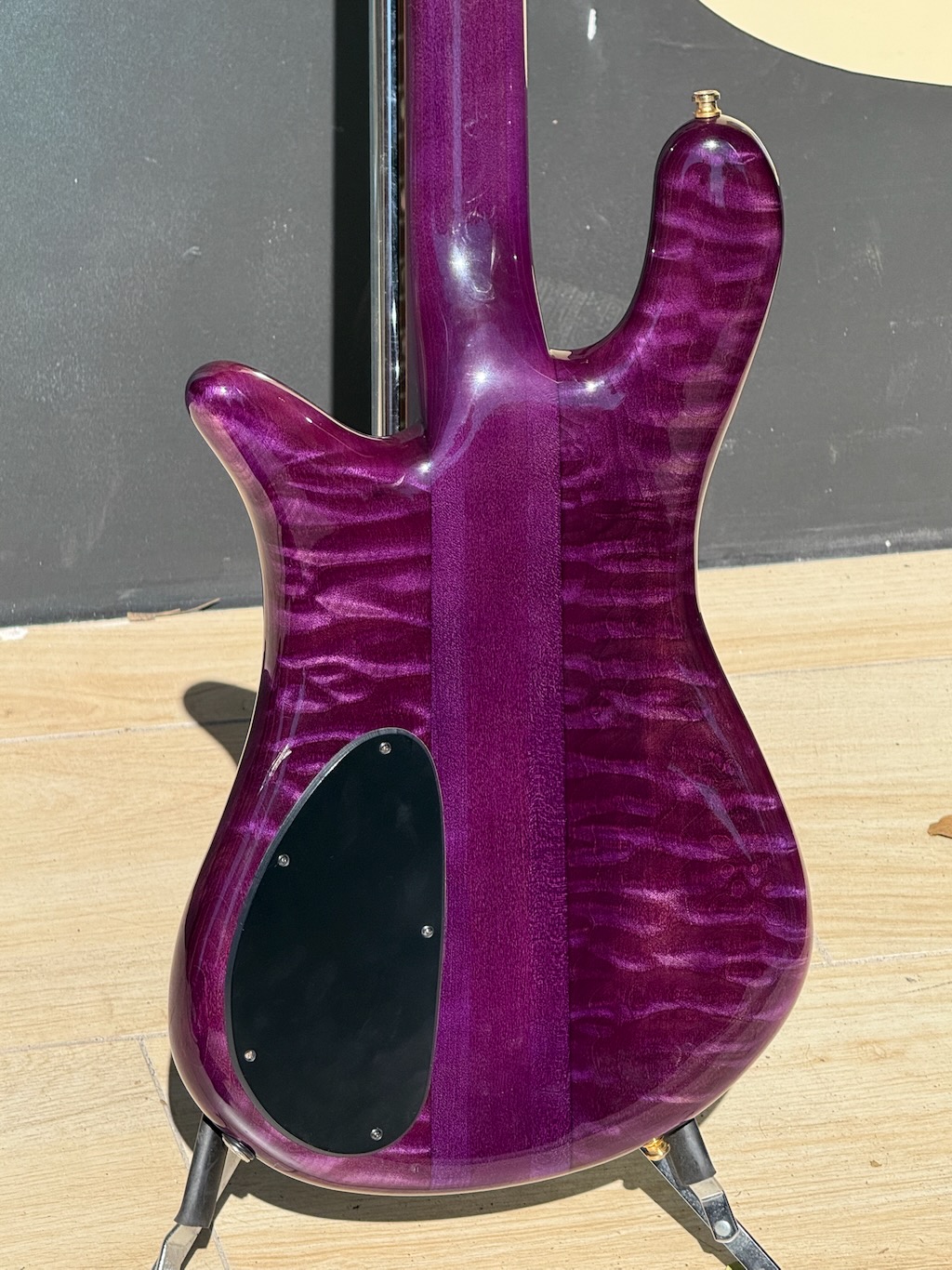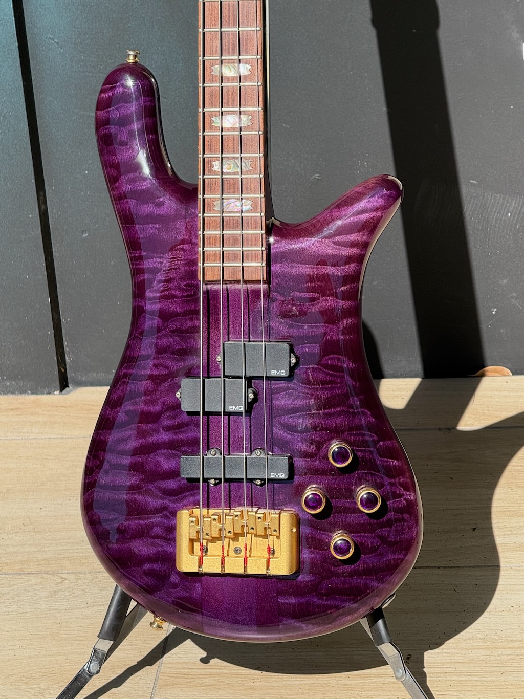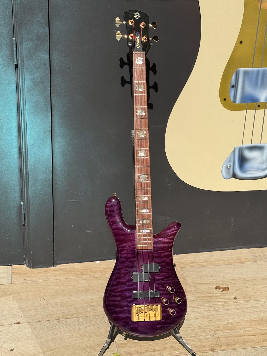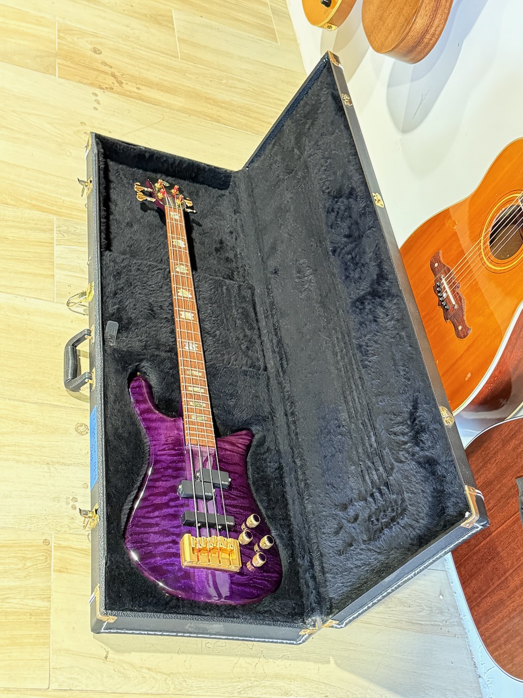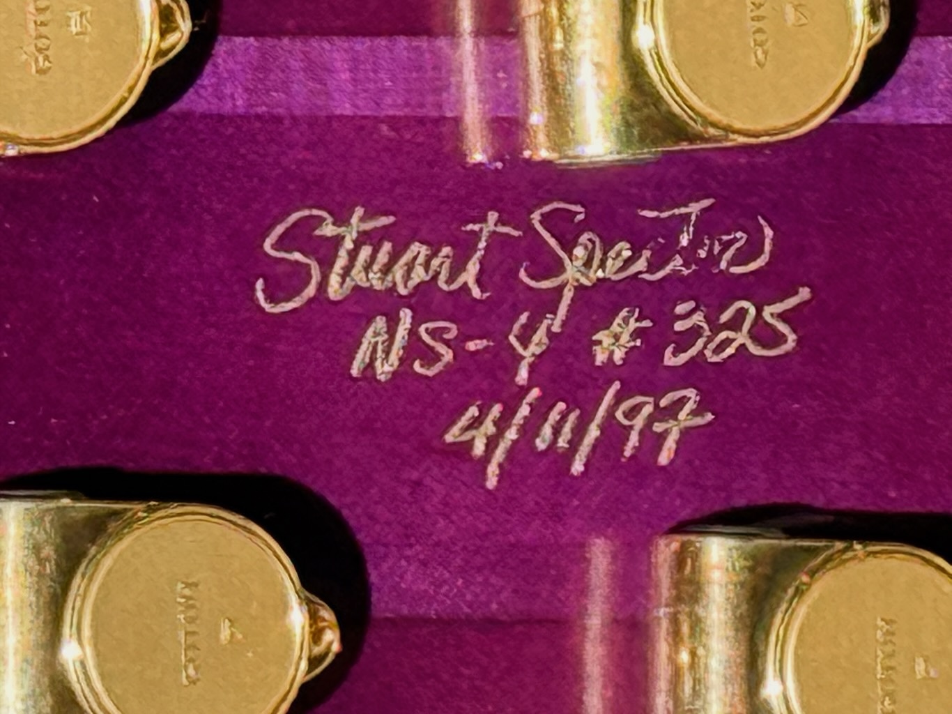 This is a very beautiful 1997 Spector NS-4 Bass made by hand by Stuart & his boyz. This is a stunning example in a very rare see-thru Purple finish w/stunning quilted maple body halves. It’s got a set of P & J EMG pickups & a set of matching purple knobs added to match but the original plastic knobs are in the case. It’s signed & dated by Stuart on 4/11/97. It’s got slight play time & 1 major scratch. Otherwise she’s excellent overall & comes in its original hard case.