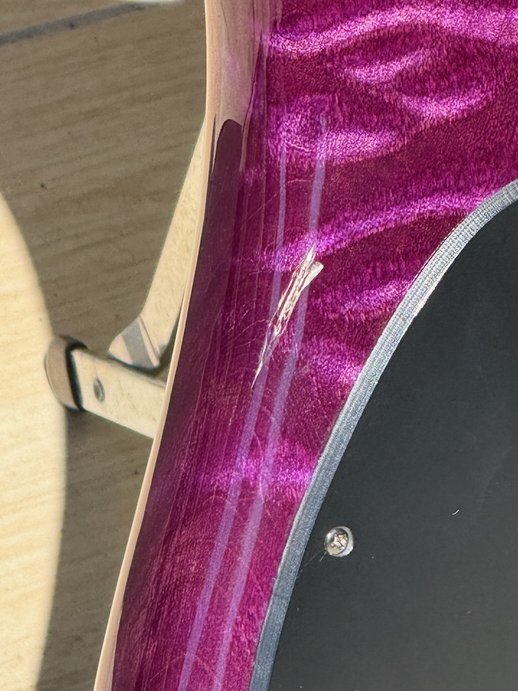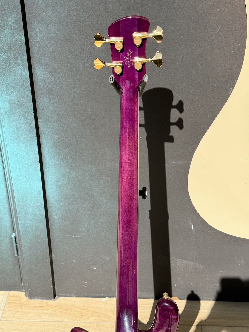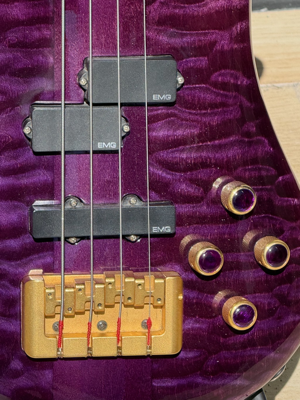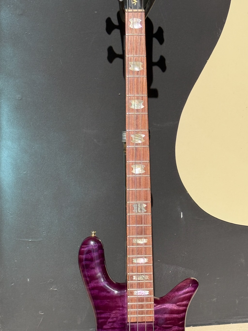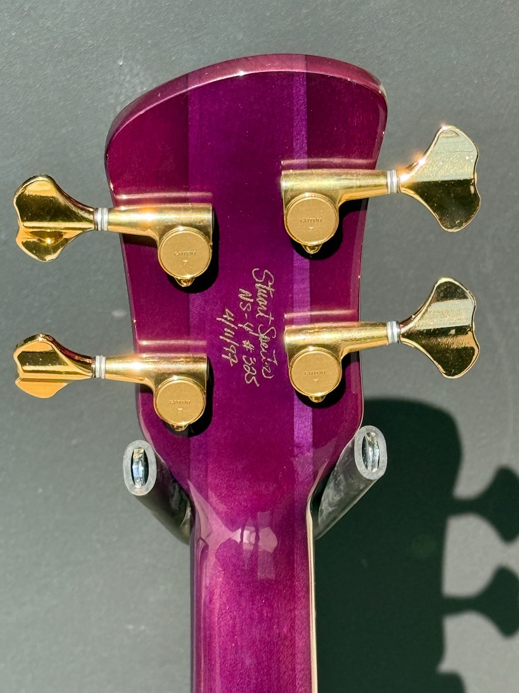 This is a very beautiful 1997 Spector NS-4 Bass made by hand by Stuart & his boyz. This is a stunning example in a very rare see-thru Purple finish w/stunning quilted maple body halves. It’s got a set of P & J EMG pickups & a set of matching purple knobs added to match but the original plastic knobs are in the case. It’s signed & dated by Stuart on 4/11/97. It’s got slight play time & 1 major scratch. Otherwise she’s excellent overall & comes in its original hard case.