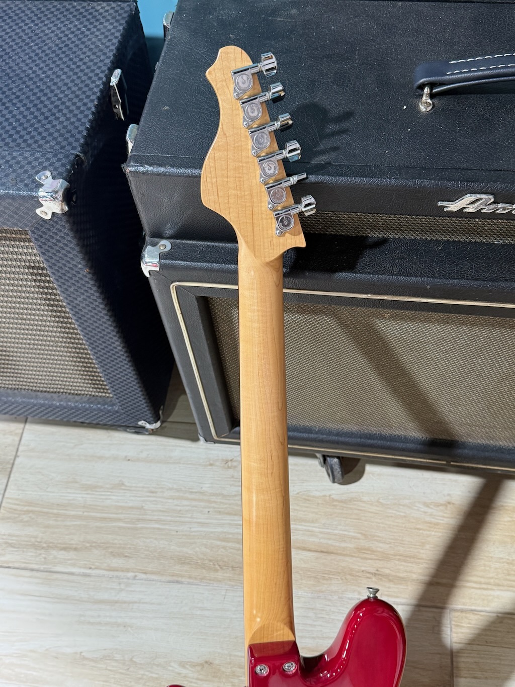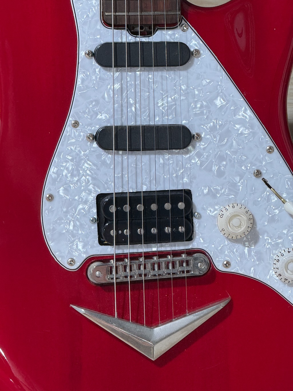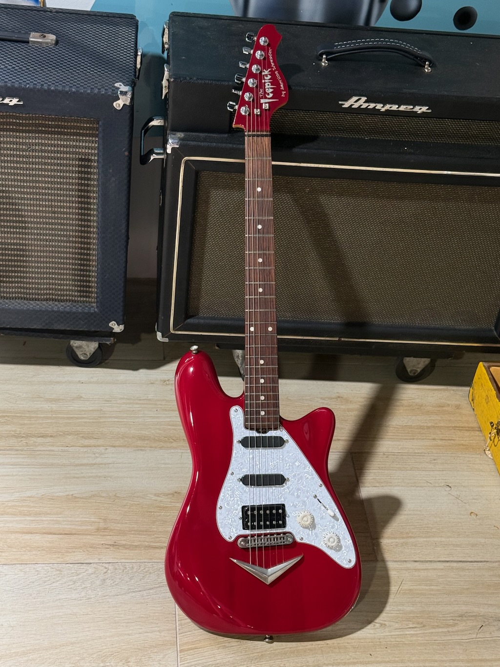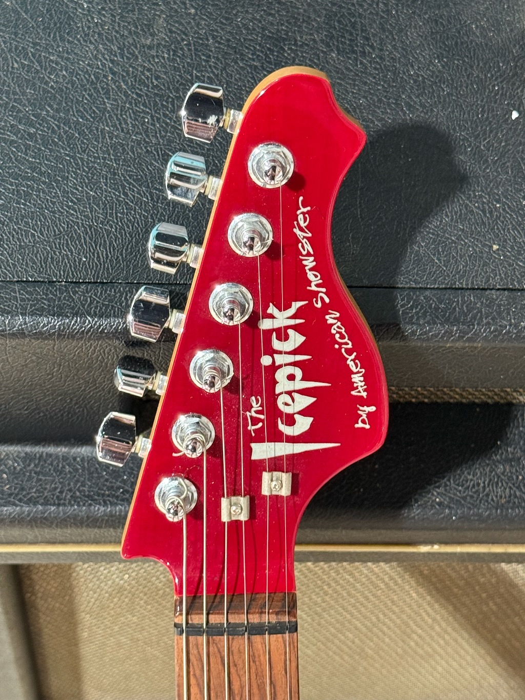This is a very cool US made American Showster Icepick guitar hand constructed in the state of New Jersey by their certified luthiers. Most people know American Showster for their ’57 Chevy guitar w/tail fins. This Ice Pick guitar, a more traditional design, provides a bright sound with an old school tone that is sure to keep you rocking all night long. Retro design with the real rocker in mind ! The Ice Pick by American Showster is our most normal looking electric guitar featuring great sound and our time-honored design. Its Candy Apple Red finish w/matching headstock emulates some Fender guitars of the 60’s. Its truly near mint & comes w/a nice gig bag.