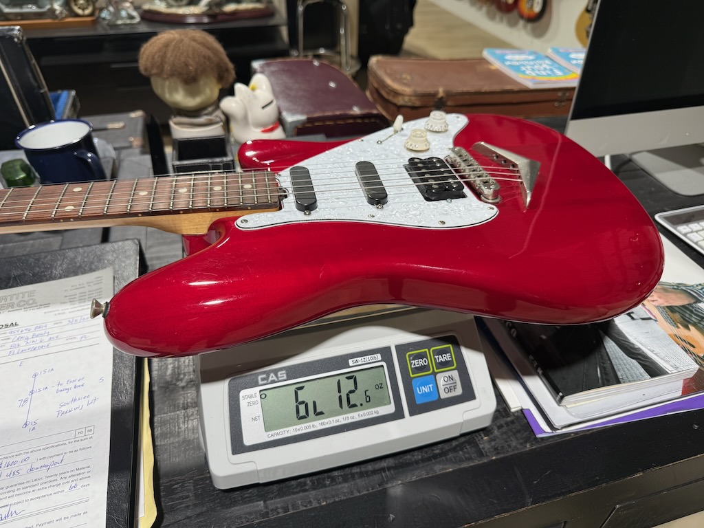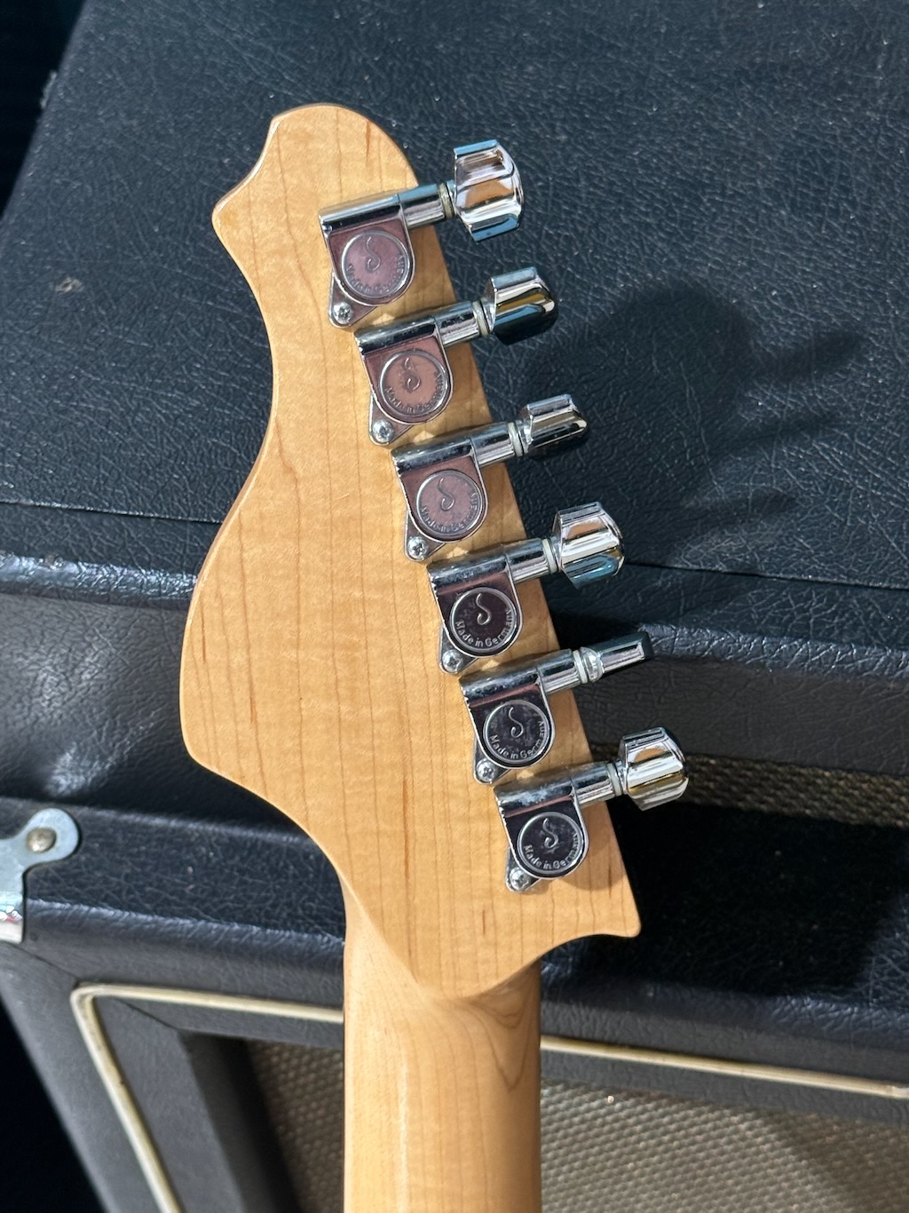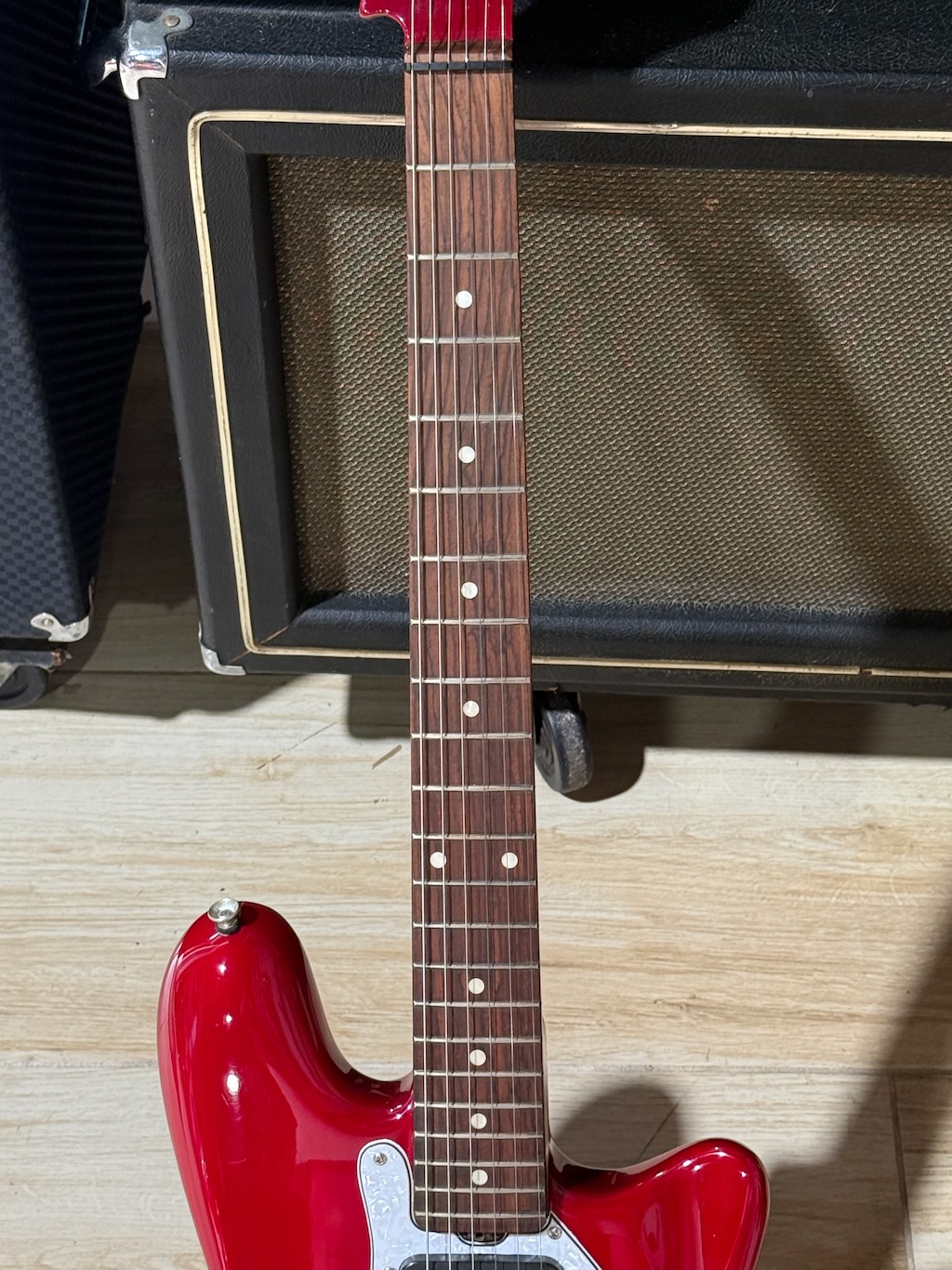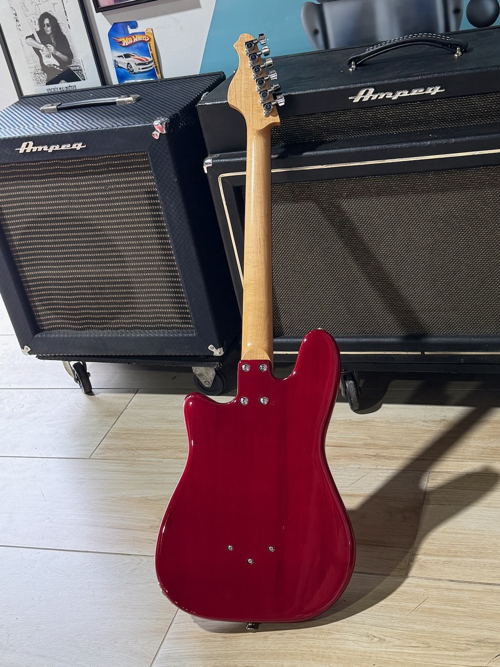 This is a very cool US made American Showster Icepick guitar hand constructed in the state of New Jersey by their certified luthiers. Most people know American Showster for their ’57 Chevy guitar w/tail fins. This Ice Pick guitar, a more traditional design, provides a bright sound with an old school tone that is sure to keep you rocking all night long. Retro design with the real rocker in mind ! The Ice Pick by American Showster is our most normal looking electric guitar featuring great sound and our time-honored design. Its Candy Apple Red finish w/matching headstock emulates some Fender guitars of the 60’s. Its truly near mint & comes w/a nice gig bag.