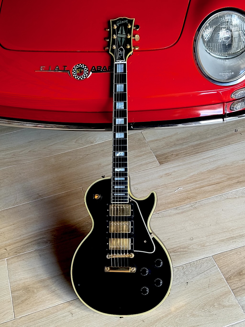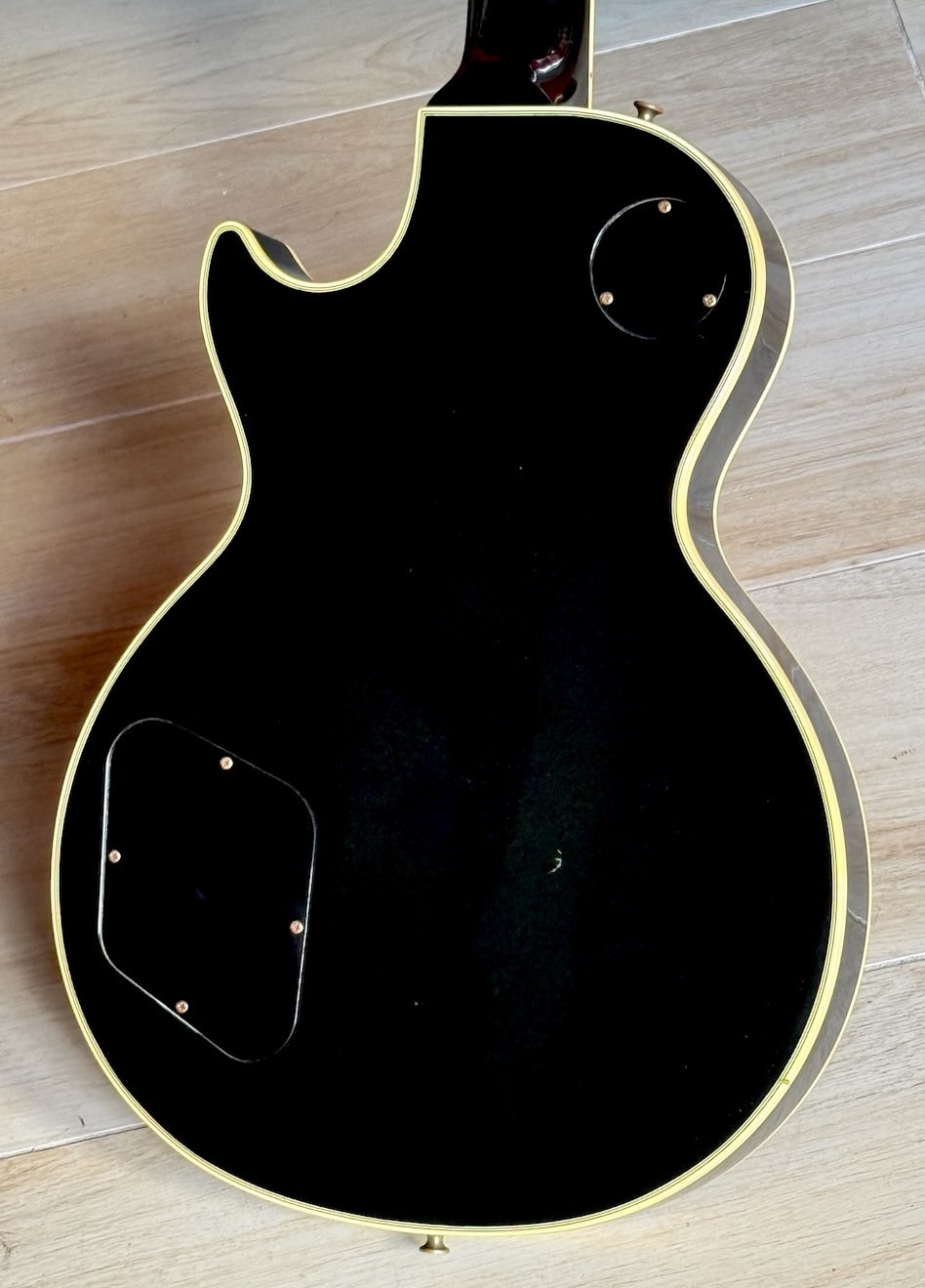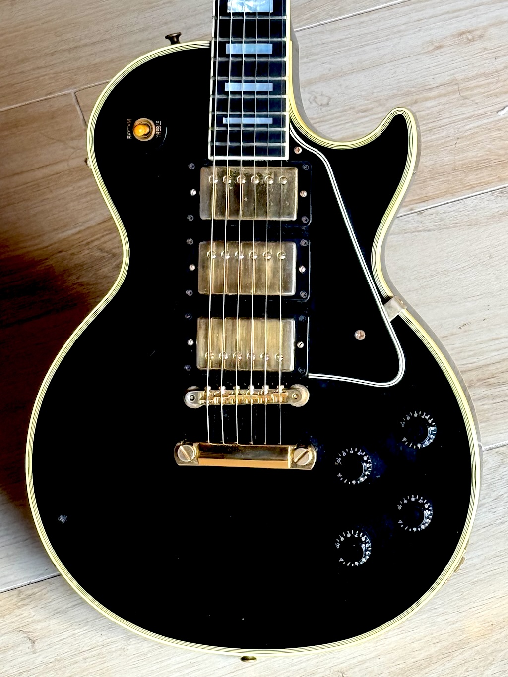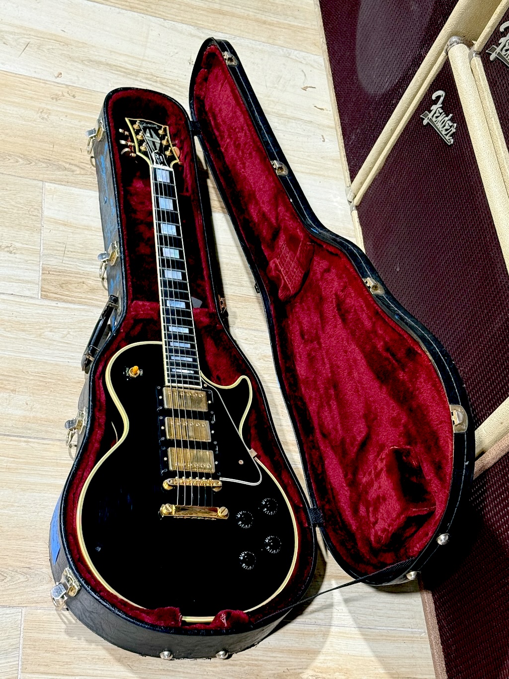 This is a wonderful & maybe 1 of the most desirable late-90’s Gibson Les Paul Custom w/its now extremely rare 3 pickup configuration a la Peter Frampton.. Its original Black finish is stunning w/hardly a lot of play time at all. Its mahogany neck feels great. Its white bound & block inlaid Ebony fingerboard is perfectly playable w/clean Gold hardware all over. Loaded w/a set of original Pat.# Humbucking pickups. It’s 100% original, she’s truly excellent & comes in its original Black fancy tolex case that’s been painted over by its last owner.