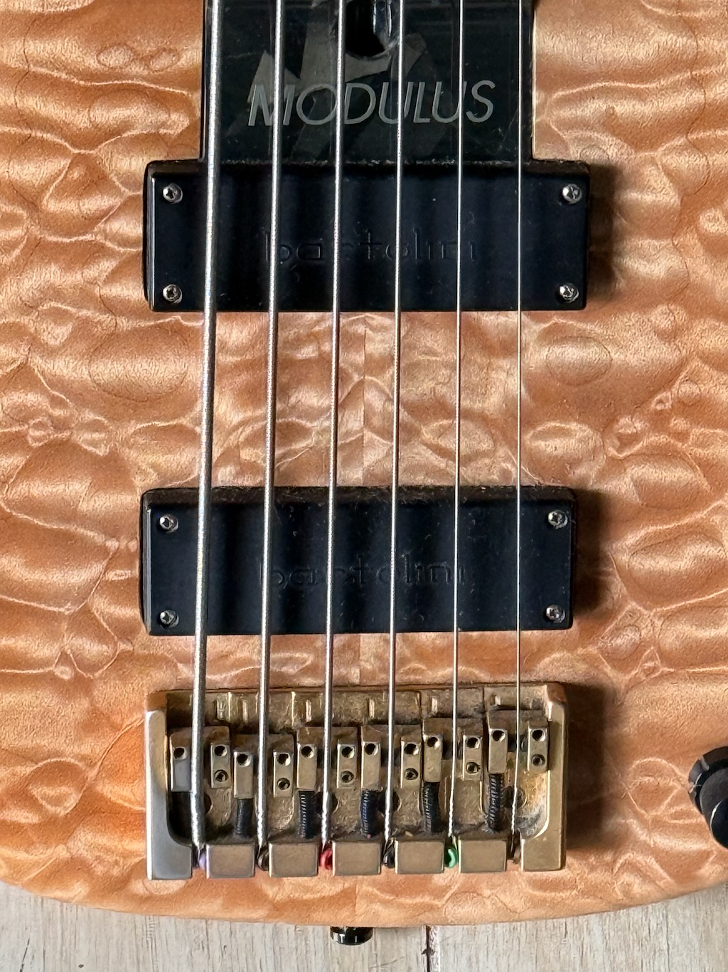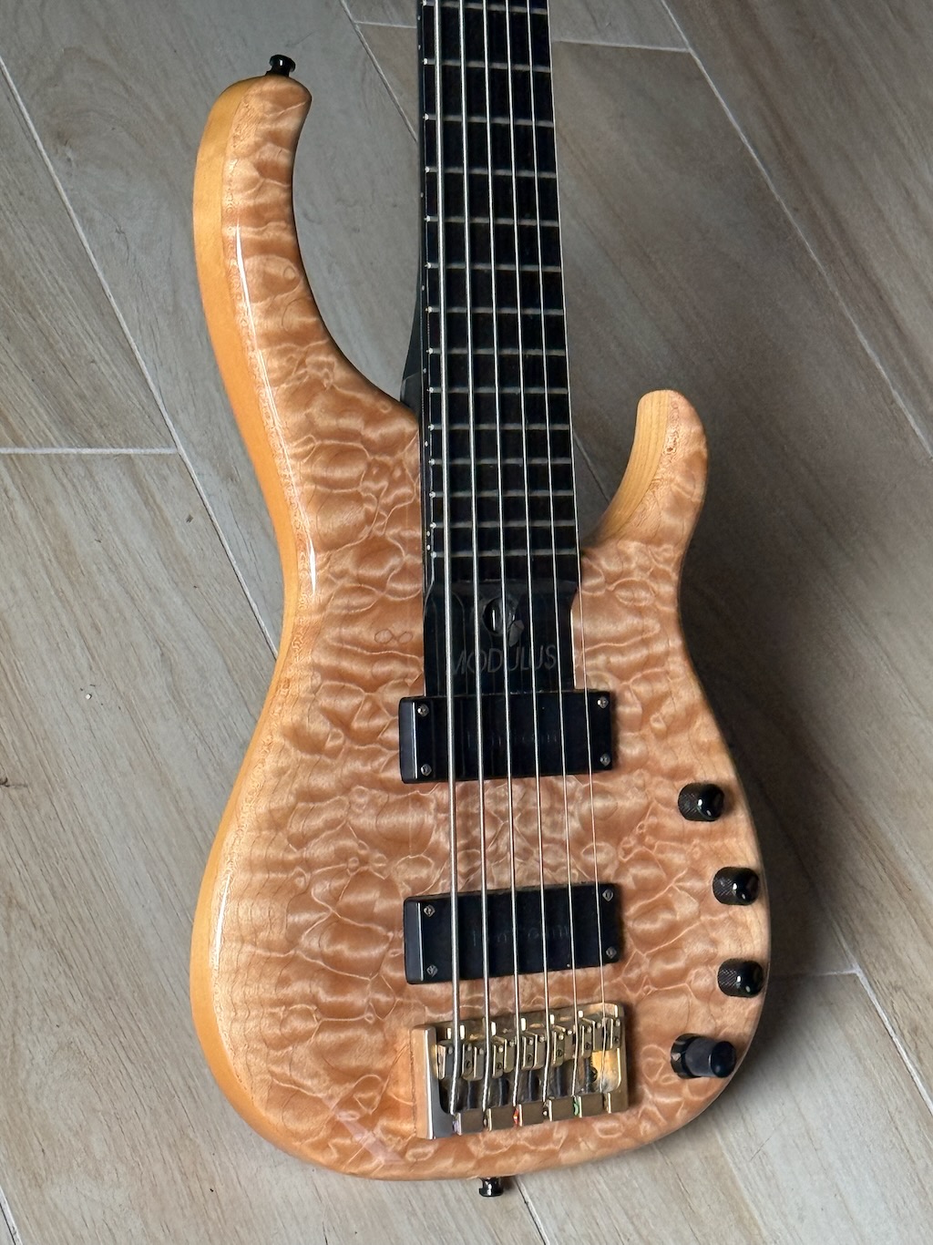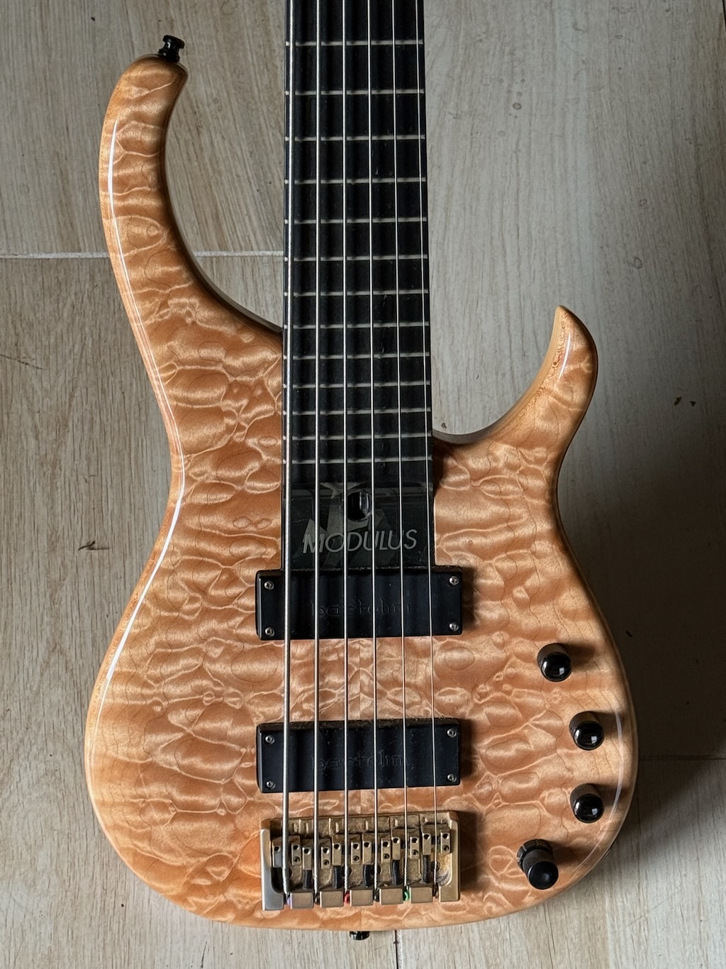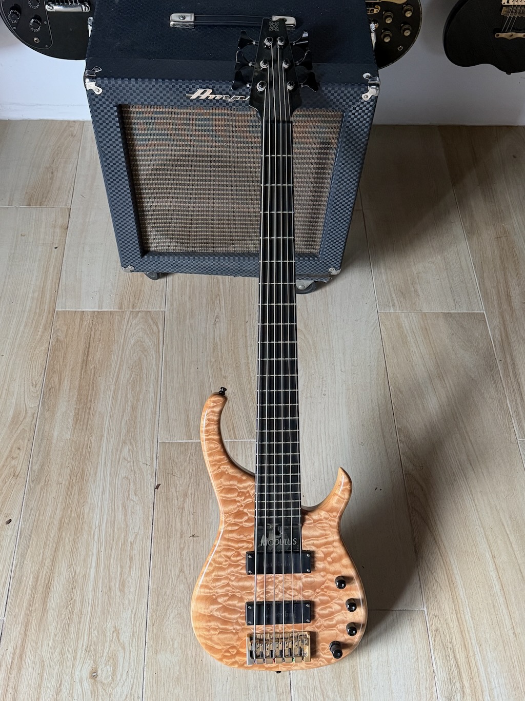 This is 1 cool boutique bass from the land of Graphite. Modulus Graphite’s Geoff Gould is the king of bass technology & this 1999 Quantum 6 6-String Bass is what he has perfected. This one was ordered w/its stunning crazy 5A Quilted Maple Top done in a nice amber tone. Its 2 Bartolini pickups are fabulous from killer Funk to hard Rock. I have liked Modulus since the 80’s. This is a fabulous bass for a talented player. She’s all original & in excellent overall & comes in a nice gig bag.