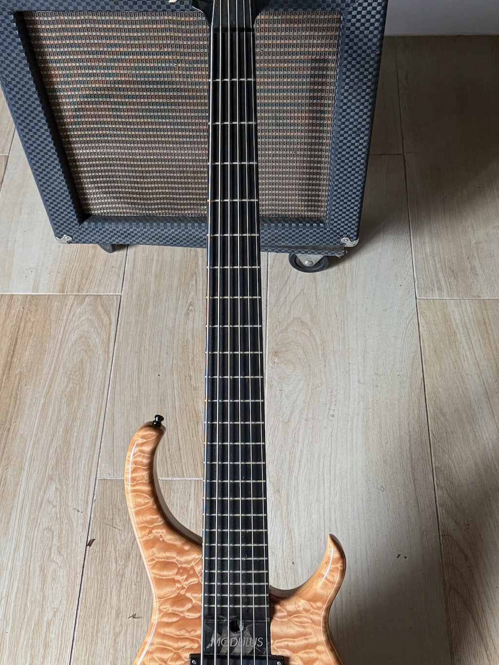 Everything works as it should in this instrument. No issues at all. Perfect string to string balance, amazing low B, super responsive all across the fingerboard. Scale lenght is 35″ and this is in part responsible for a great 5th string but the good news is that this extra stretch is hardly noticeable. It just feels great.