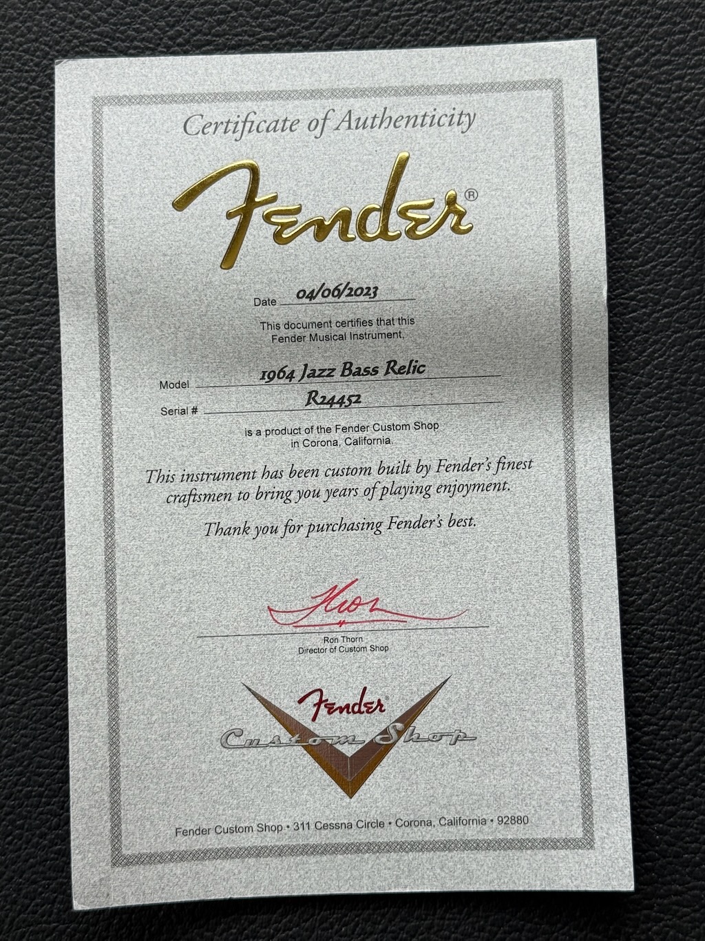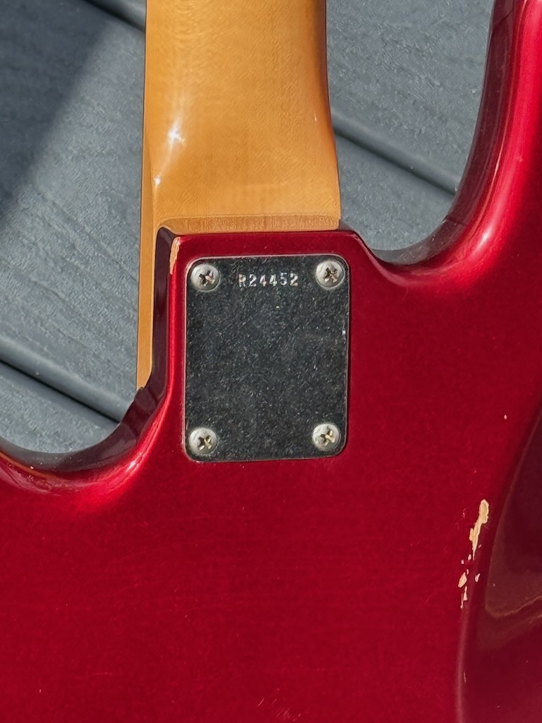 This is a very nice Jazz Bass made by the Custom Shop back in March 2005. She’s got a nicely Relic’d Candy Apple Metallic finish over a lightweight Alder body. It’s got a great feeling Rosewood fingerboard & a matching Candy Red Headstock. She has a nice tortoise’gard to pull this all together. She has 1 pickup changed out w/a killer “The Pickup Wizard” ’62 vintage pickup (but the original pickup is in the case pocket). She’s excellent in all respects, she has its certificate (replaced by Fender 2023) all in its Black Tolex Hard Case.