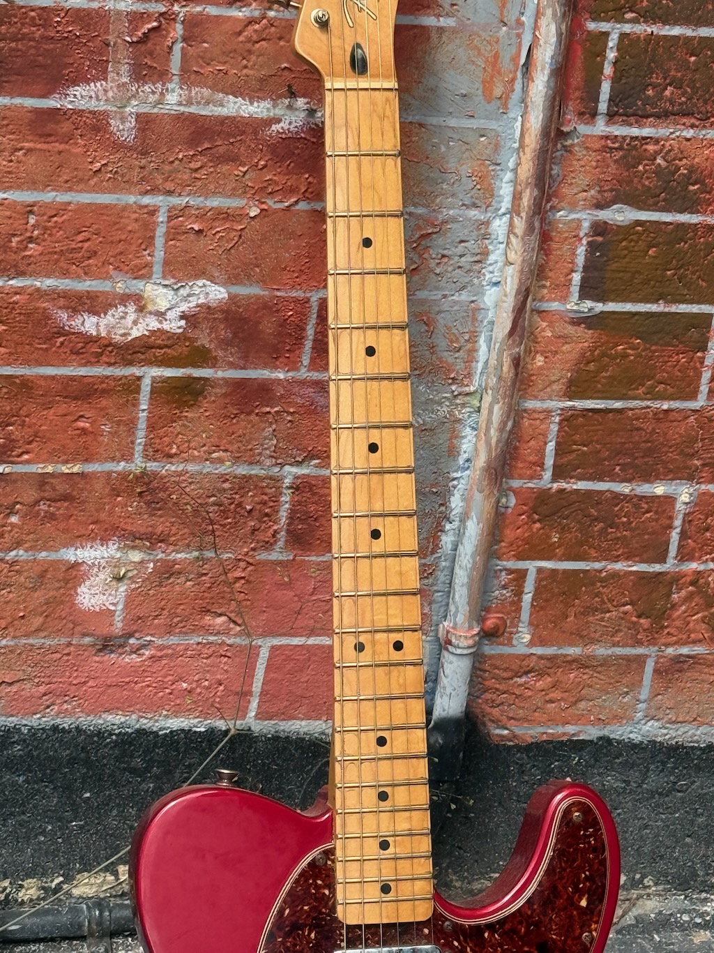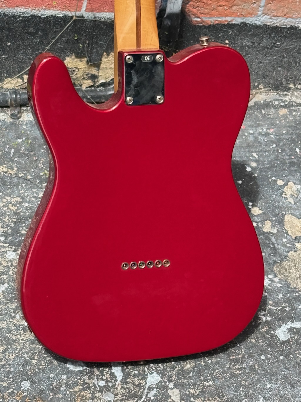Here’s an affordible Fender Telecaster made in Mexico in 2005 w/some incredible tone courtesy of the Fender Tele pickups & an added Strat pickup. Its got a beautiful Candy Apple Red finish. This player-friendly guitar includes a slim, comfortable C-shaped maple neck profile with an easy-playing feel as well as a vintage-style Telecaster bridge with barrel saddles and string-through-body design. This Tele also features 1950s-inspired headstock markings and a slick vintage-tint gloss neck finish for an old-school vibe. Its excellent overall & comes w/a gig bag.