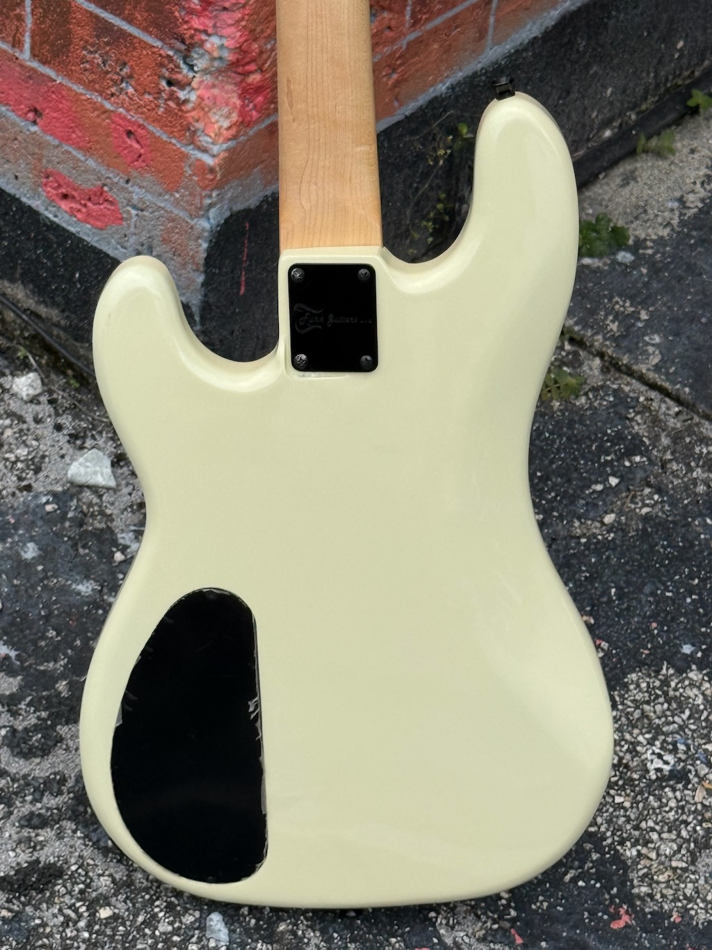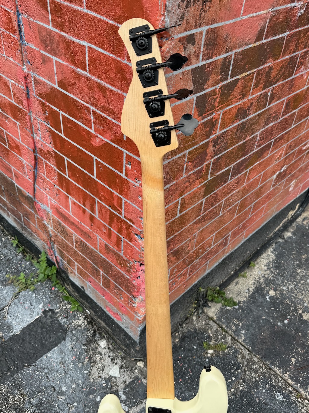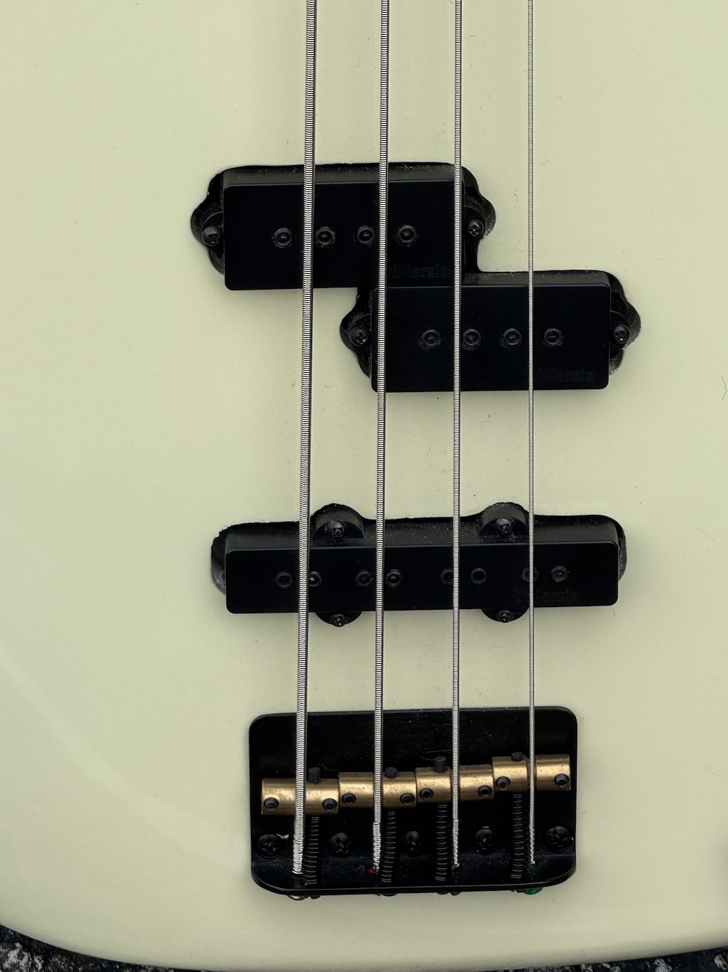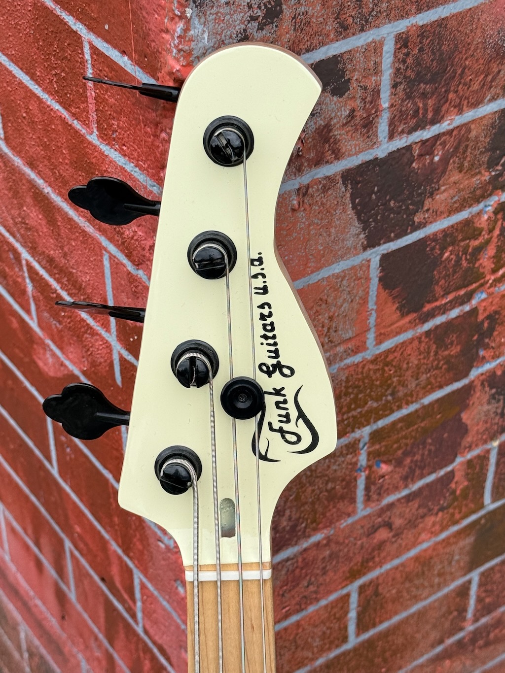 Mark Funk is a small builder from Florida building cool P & J clones all made in the USA. This PJ Series has an Olympic White finish w/a matching headstock over a poplar body, 2 DiMarzio pickups, a Wilkinson bridge, she has a slim 1 piece maple neck , she’s 20 nickel frets w/a 16 radius w/a bone nut & a dual action truss rod. It’s the perfect go to gig bass that looks vintage but performs like a pro ! She’s near mint & comes in a nice gig bag.