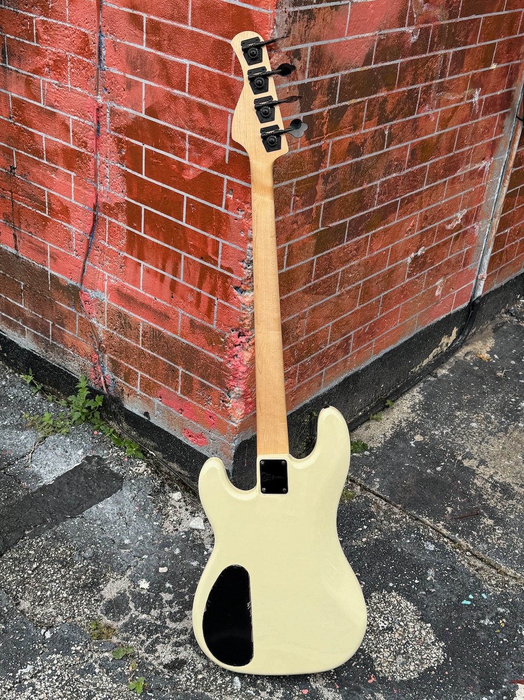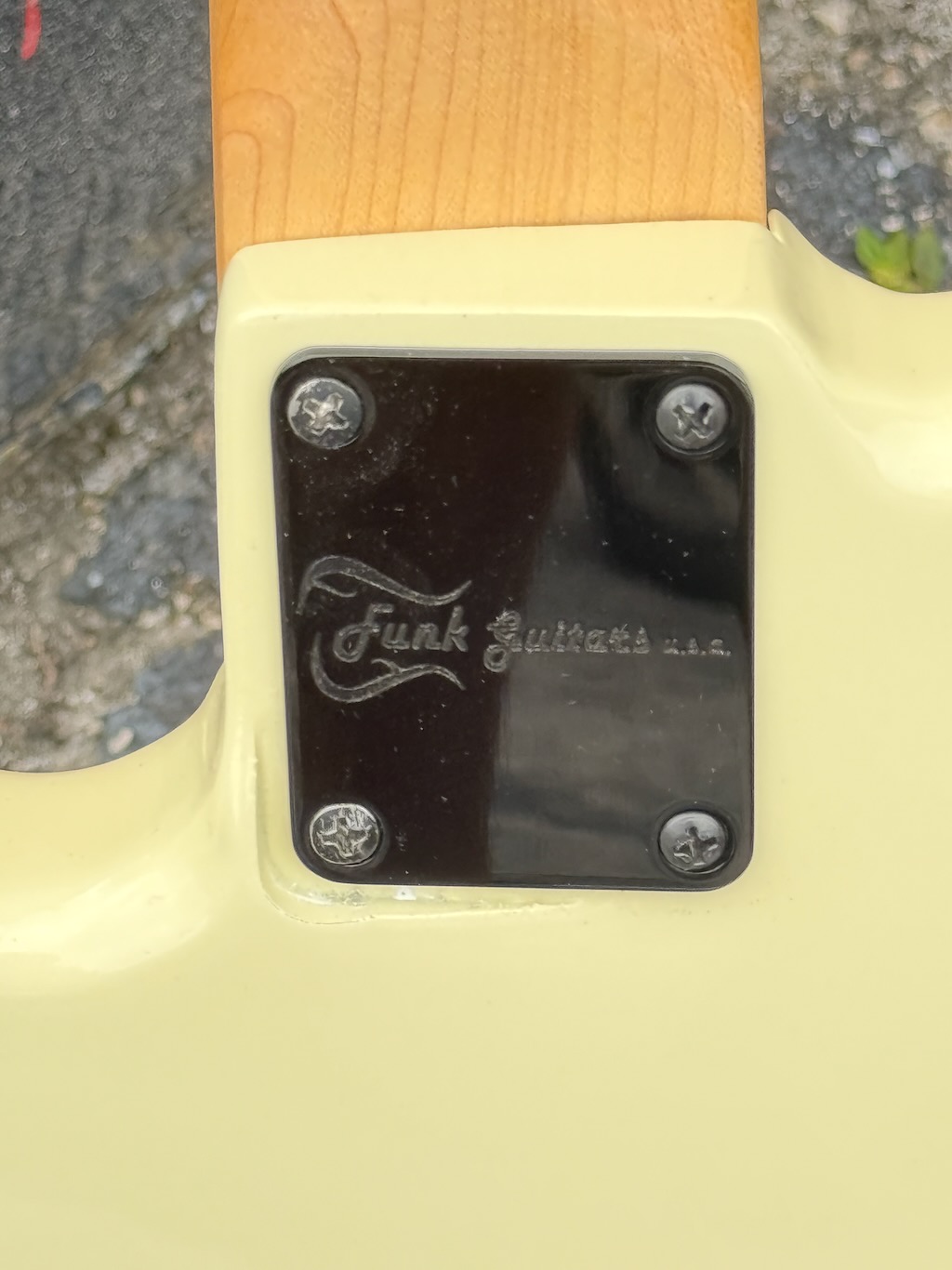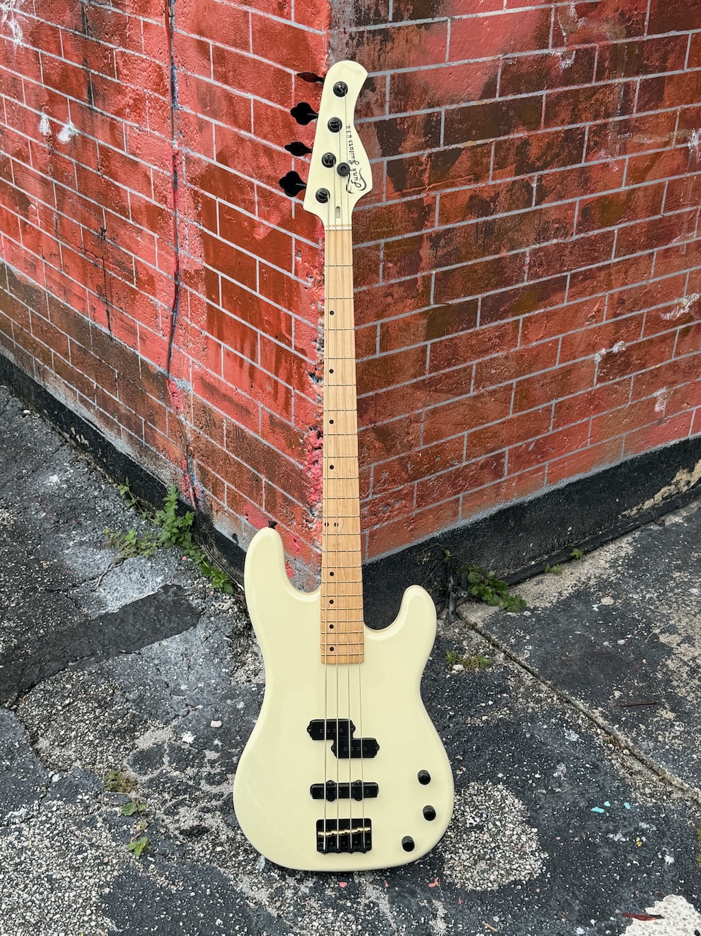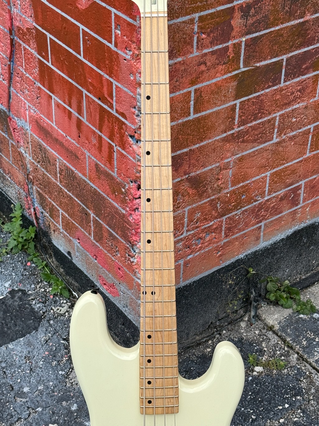 Mark Funk is a small builder from Florida building cool P & J clones all made in the USA. This PJ Series has an Olympic White finish w/a matching headstock over a poplar body, 2 DiMarzio pickups, a Wilkinson bridge, she has a slim 1 piece maple neck , she’s 20 nickel frets w/a 16 radius w/a bone nut & a dual action truss rod. It’s the perfect go to gig bass that looks vintage but performs like a pro ! She’s near mint & comes in a nice gig bag.